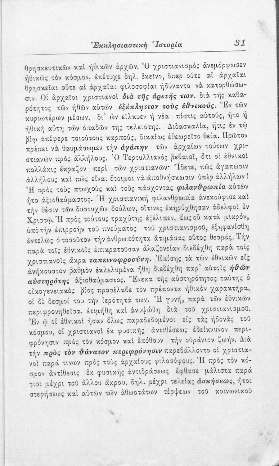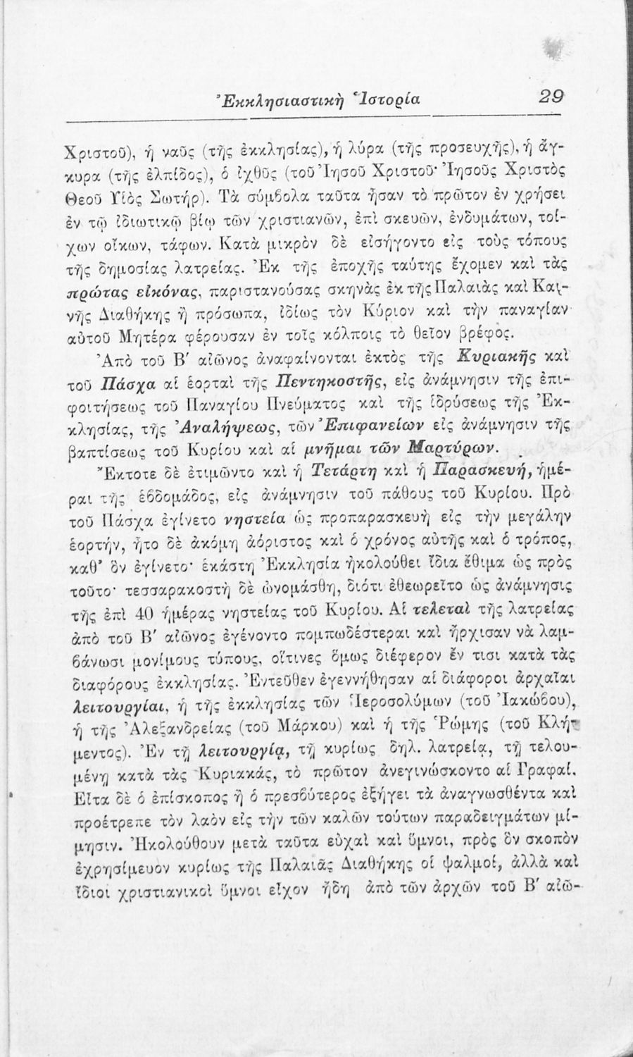 Το σύγγραμμα ήταν σχολικό εγχειρίδιο για το μαθήματα των Θρησκευτικών. Περιγράφει σημαντικά γεγονότα της θρησκευτικής ζωής ξεκινώντας από την Πεντηκοστή. Επίσης, αναφέρεται σε θέματα διοίκησης της εκκλησίας ...