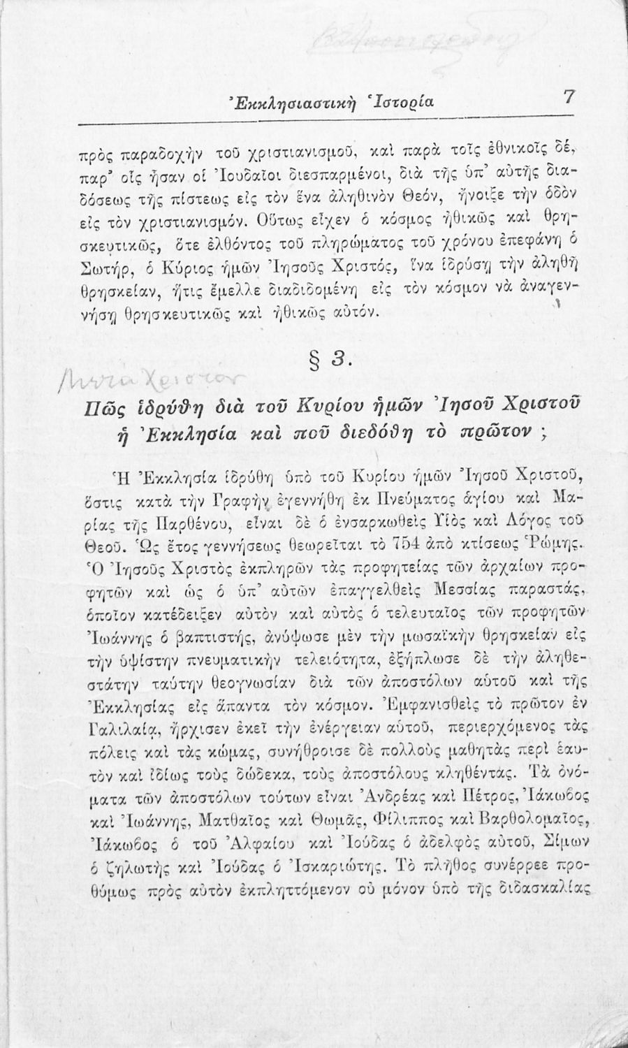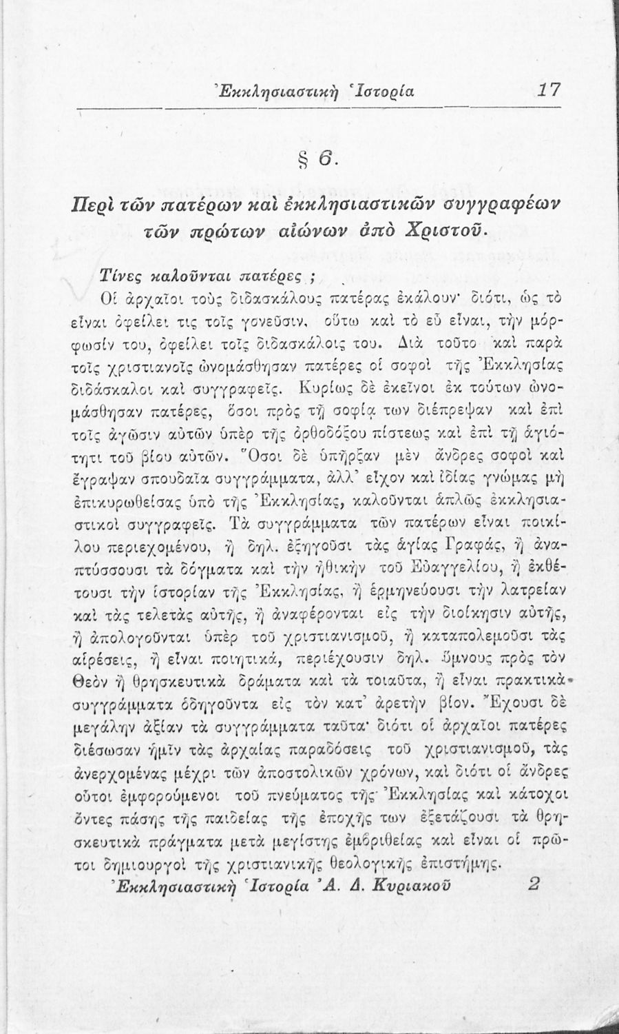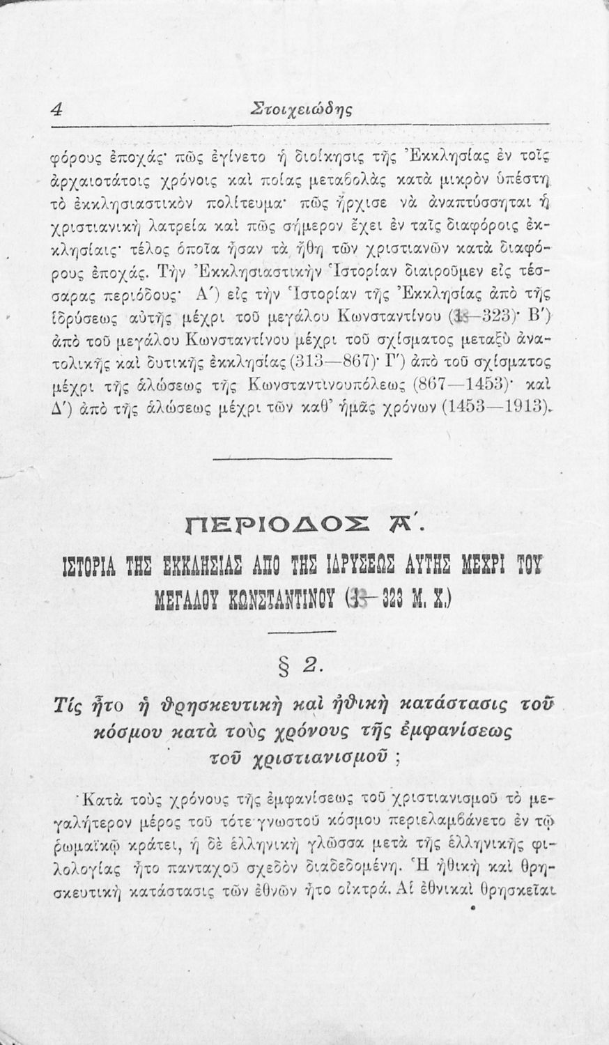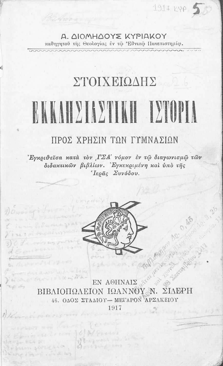 Βαθμίδα εκπαίδευσης: Δευτεροβάθμια Τάξη: Γυμνάσιο Μάθημα: Θρησκευτικά Γλώσσα: Καθαρεύουσα Παρουσίαση περιεχομένου: Σχολικό εγχειρίδιο Εκκλησιαστικής Ιστορίας δομημένο ιστορικά με βάση το σχίσμα των εκκλησιών σε ανατολική και δυτική και την άλωση της Κωνσταντινούπολης. Το εγχειρίδιο εγκρίθηκε από την Ιερά Σύνοδο. Ο συγγραφέας ήταν καθηγητής Θεολογίας στο Εθνικό Πανεπιστήμιο. |