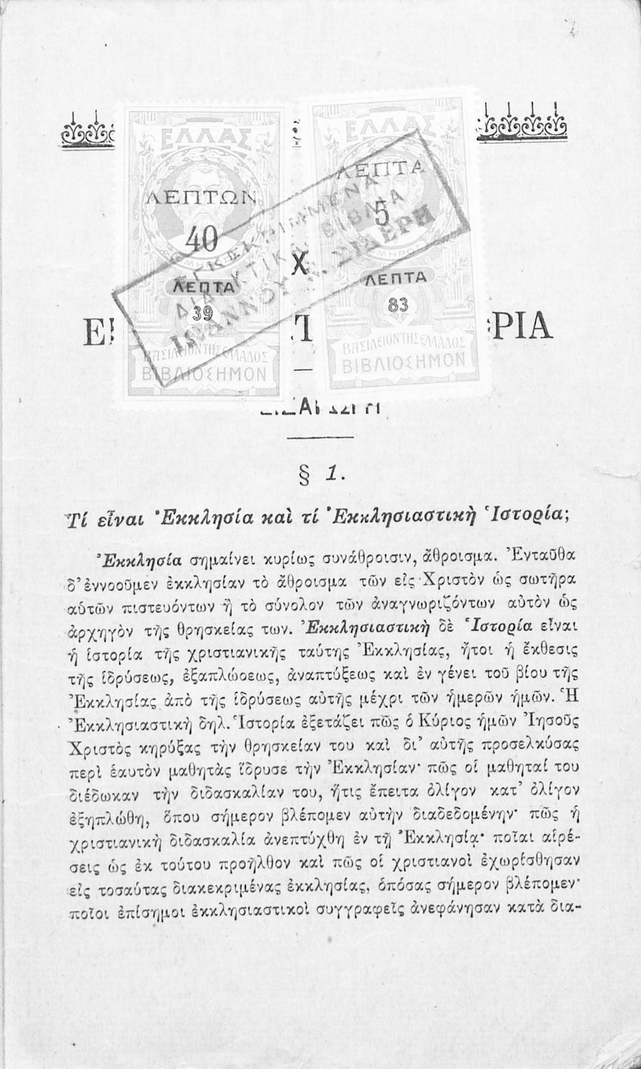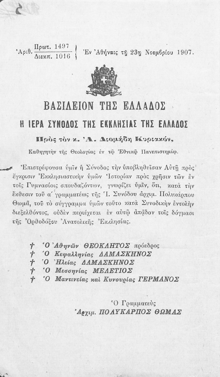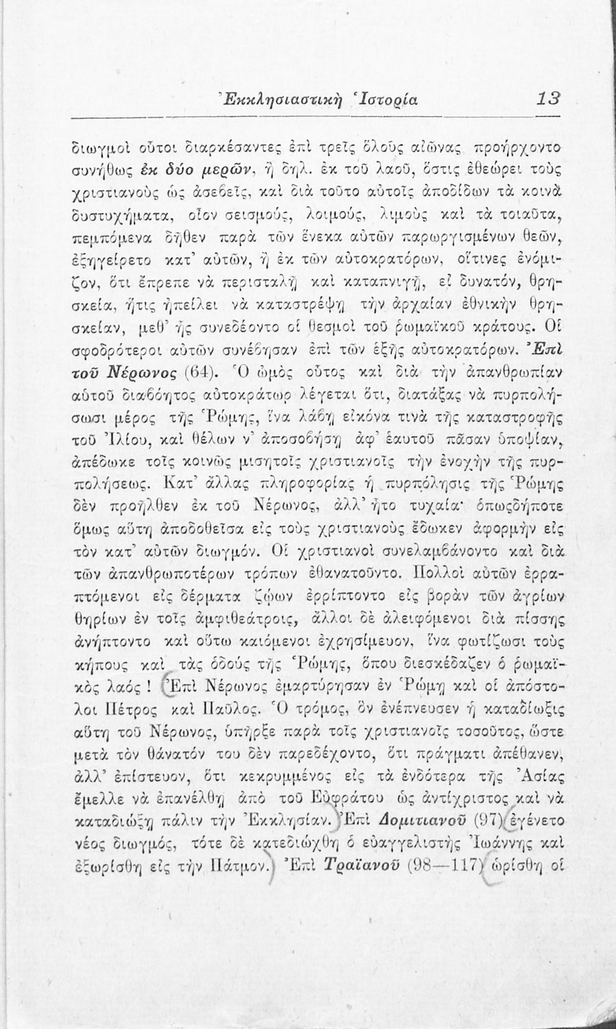 Βαθμίδα εκπαίδευσης: Δευτεροβάθμια Τάξη: Γυμνάσιο Μάθημα: Θρησκευτικά Γλώσσα: Καθαρεύουσα Παρουσίαση περιεχομένου: Σχολικό εγχειρίδιο Εκκλησιαστικής Ιστορίας δομημένο ιστορικά με βάση το σχίσμα των εκκλησιών σε ανατολική και δυτική και την άλωση της Κωνσταντινούπολης. Το εγχειρίδιο εγκρίθηκε από την Ιερά Σύνοδο. Ο συγγραφέας ήταν καθηγητής Θεολογίας στο Εθνικό Πανεπιστήμιο. |