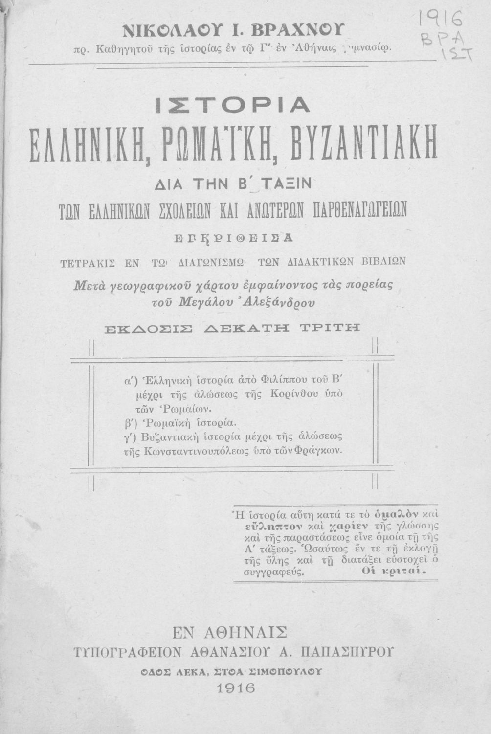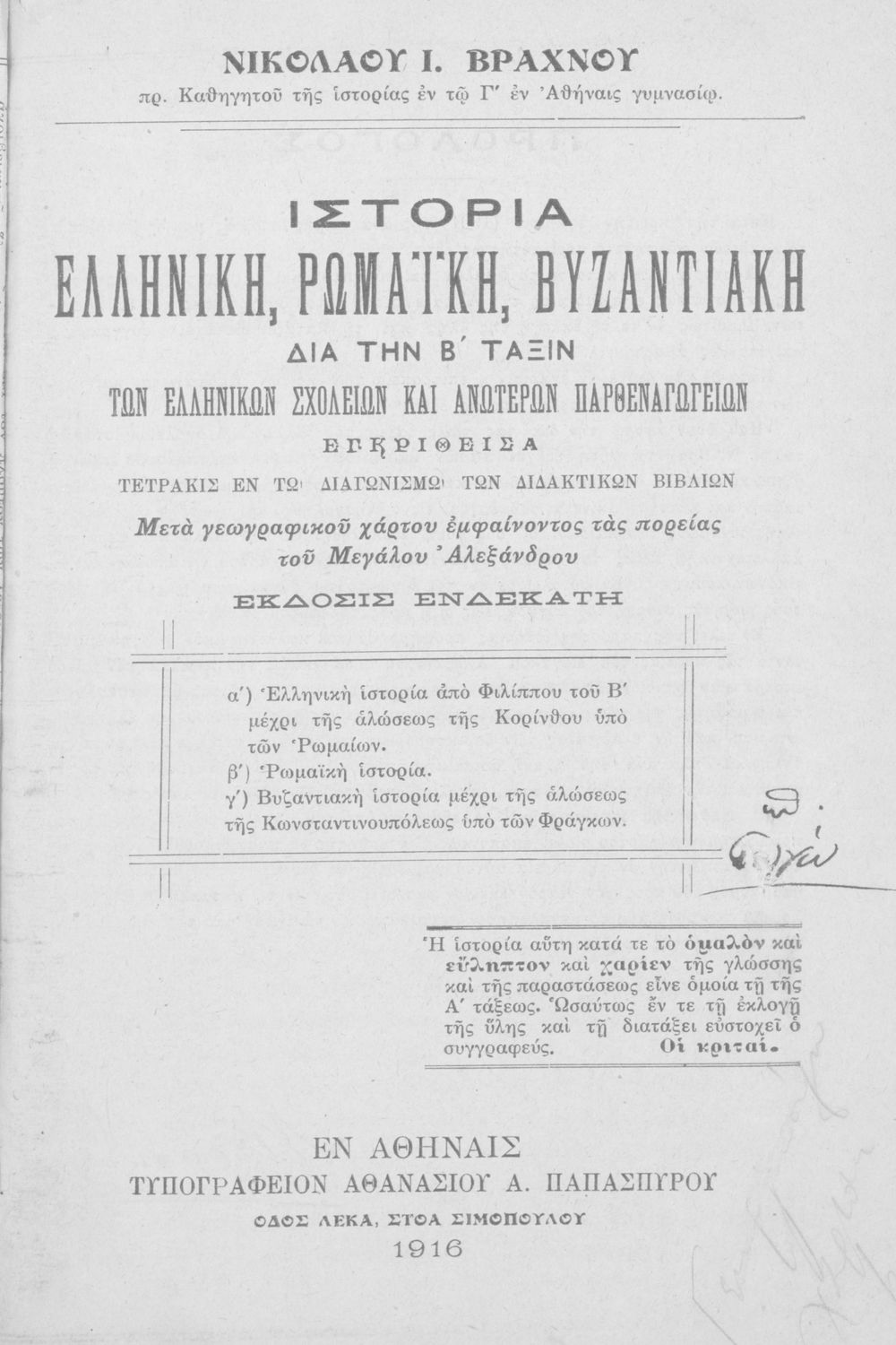 Κωδικός αναγνώρισης: 02-02073 Τίτλος: Ιστορία ελληνική, ρωμαϊκή, βυζαντιακή δια την Β΄ τάξιν των Ελληνικών Σχολείων και ανωτέρων Παρθεναγωγείων Συγγραφέας: Νικόλαος Ι. Βραχνός Μέγεθος και υπόστρωμα: Σχολικό εγχειρίδιο, σκληρό εξώφυλλο, 140 σελίδες. Σκίτσα (ασπρόμαυρα). |