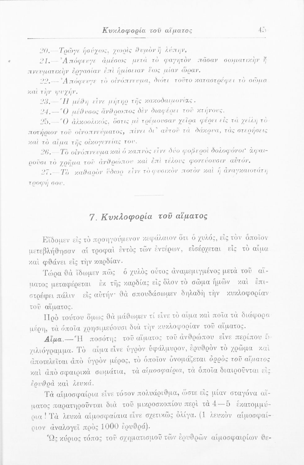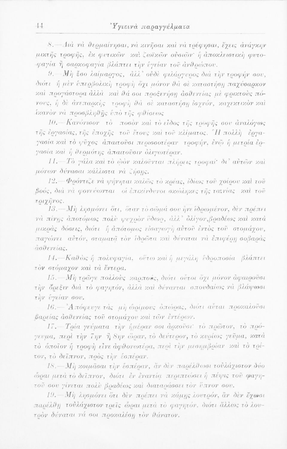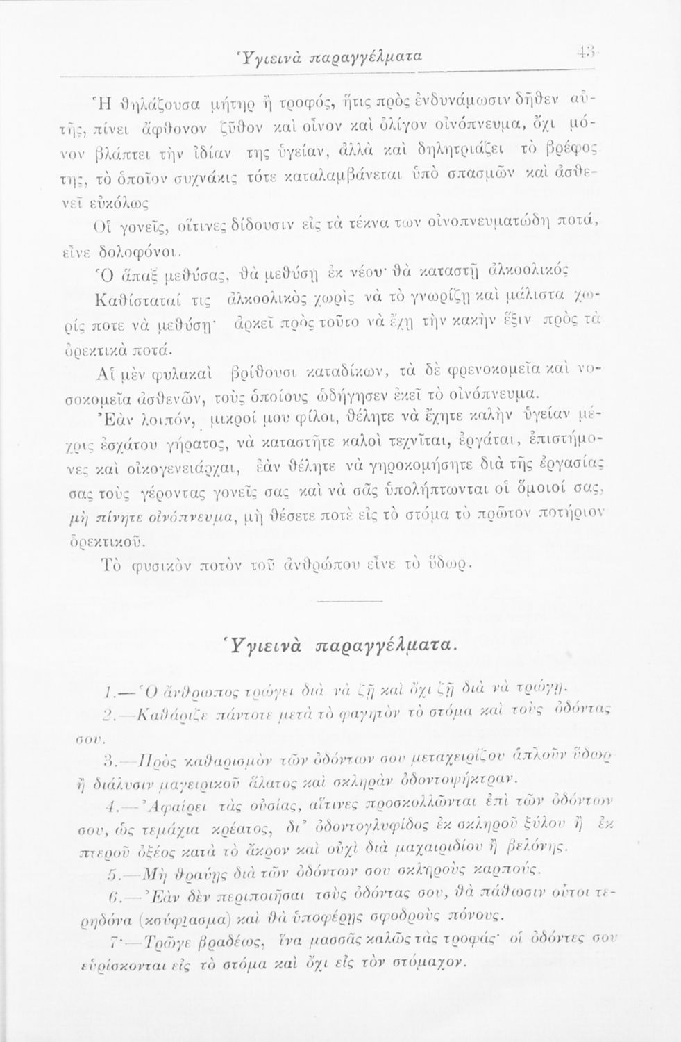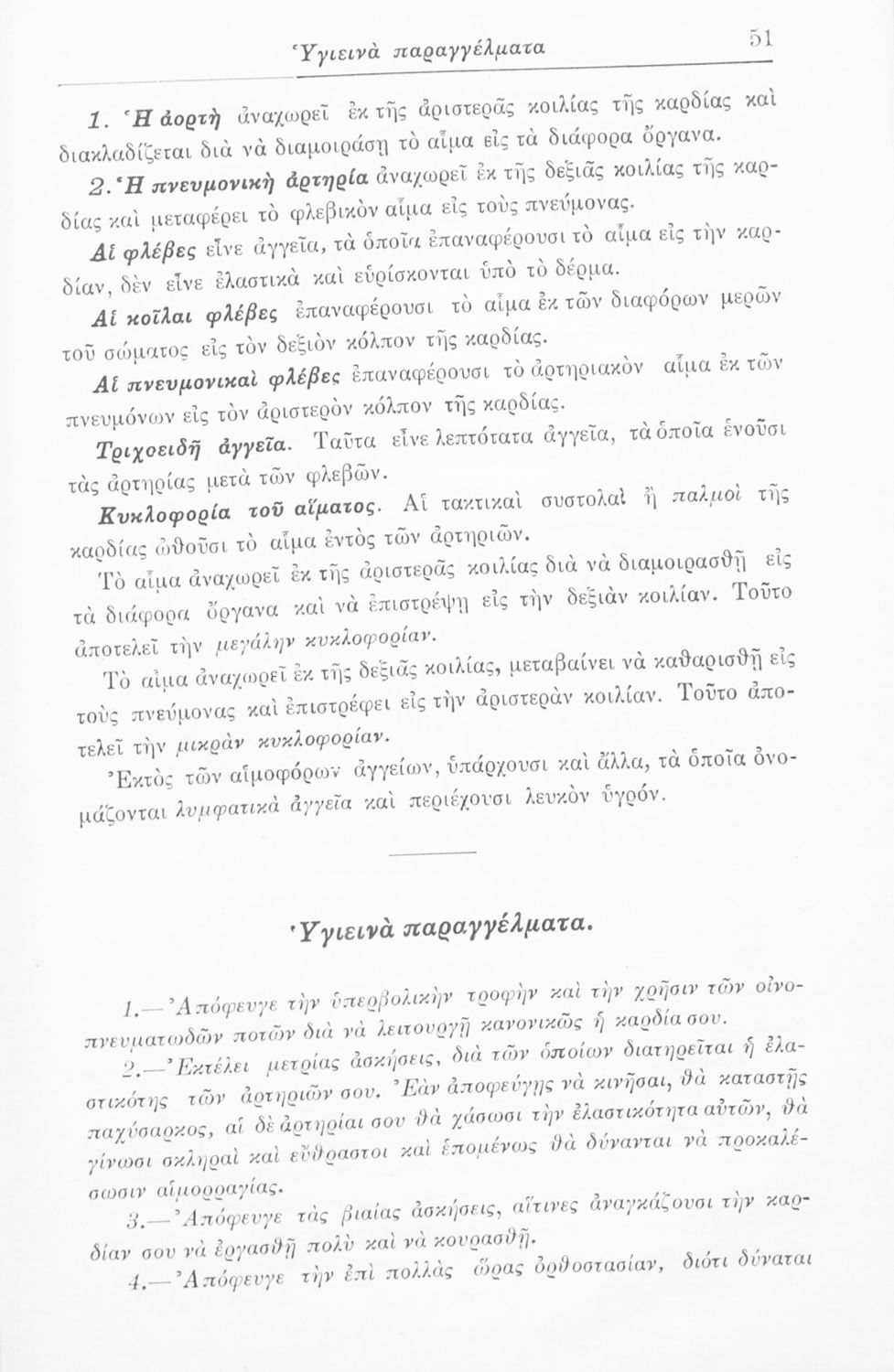 Βαθμίδα εκπαίδευσης: Πρωτοβάθμια, Δευτεροβάθμια Τάξη: Δημοτικό / Ελληνικό Σχολείο Μάθημα: Υγιεινή Γλώσσα: Καθαρεύουσα Παρουσίαση περιεχομένου: Σχολικό εγχειρίδιο για τις τάξεις του Δημοτικού και Ελληνικού σχολείου για το μάθημα της Υγιεινής. Το εγχειρίδιο περιλαμβάνει εισαγωγικά γενικές έννοιες και το αντικείμενο μελέτης της υγιεινής και της σωματολογίας. Ο κύριος κορμός του βιβλίου αναπτύσσει τις θεματικές της κίνησης των αρθρώσεων και των μυών, της διατροφής και της αναπνοής των οργανισμών και καταλήγει με το κεφάλαιο των αισθήσεων με τα αισθητήρια όργανα και το νευρικό σύστημα. |