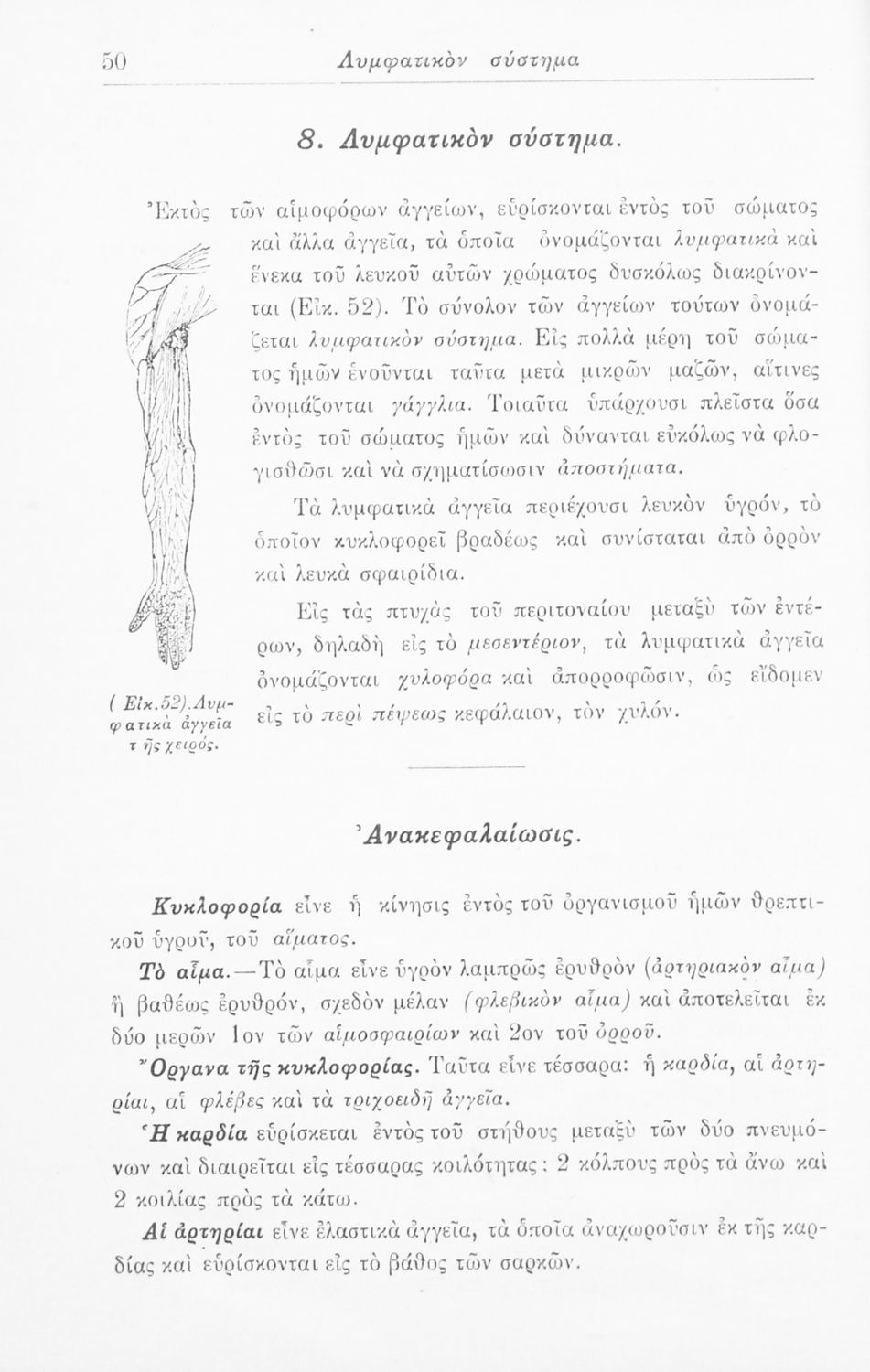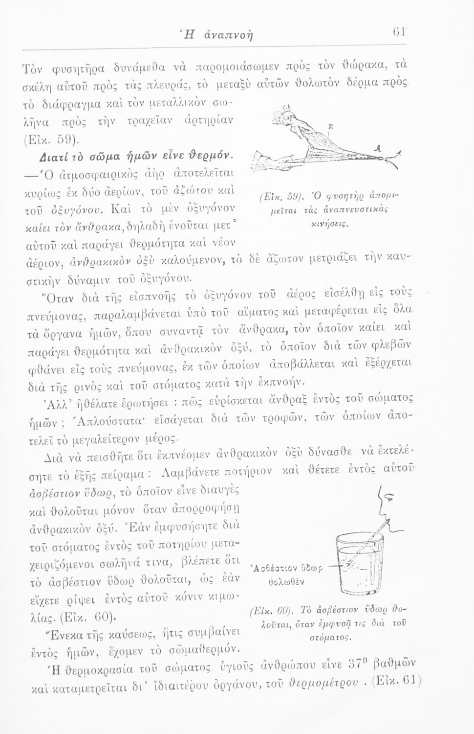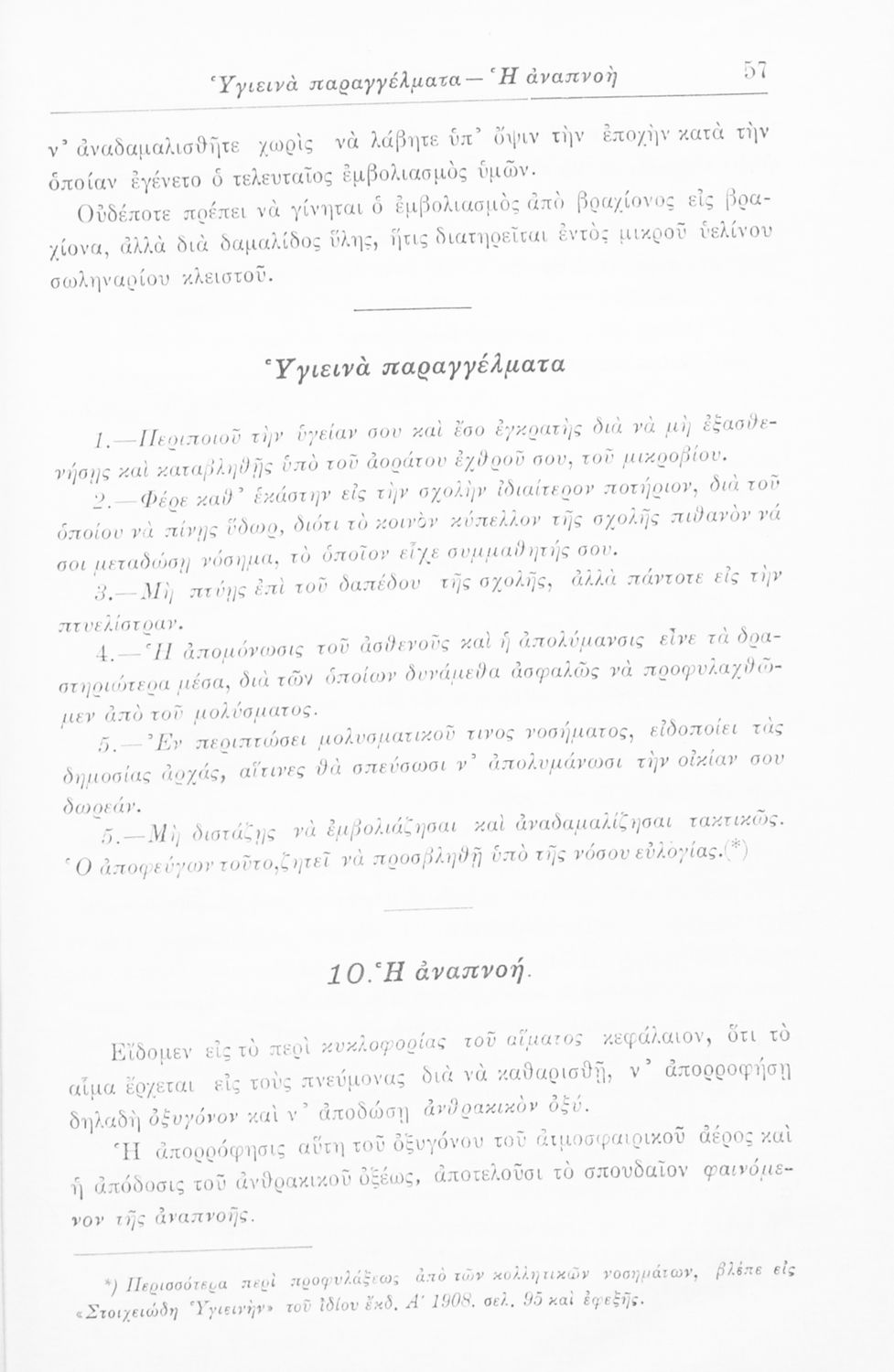 Σχολικό εγχειρίδιο για τις τάξεις του Δημοτικού και Ελληνικού σχολείου για το μάθημα της Υγιεινής. Το εγχειρίδιο περιλαμβάνει εισαγωγικά γενικές έννοιες και το αντικείμενο μελέτης της υγιεινής και της σωματολογίας. Ο κύριος κορμός του βιβλίου αναπτύσσει τις θεματικές της κίνησης των αρθρώσεων και των μυών, της διατροφής και της αναπνοής των οργανισμών και καταλήγει με το κεφάλαιο των αισθήσεων με τα αισθητήρια όργανα και το νευρικό σύστημα.