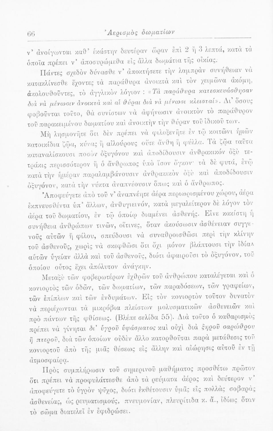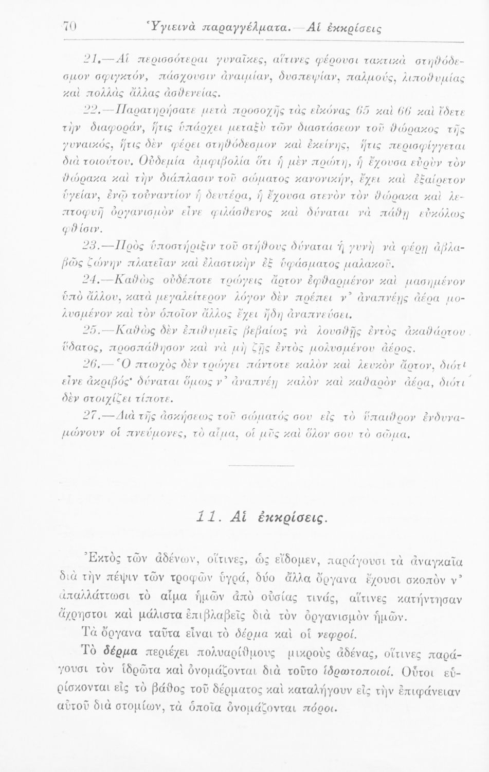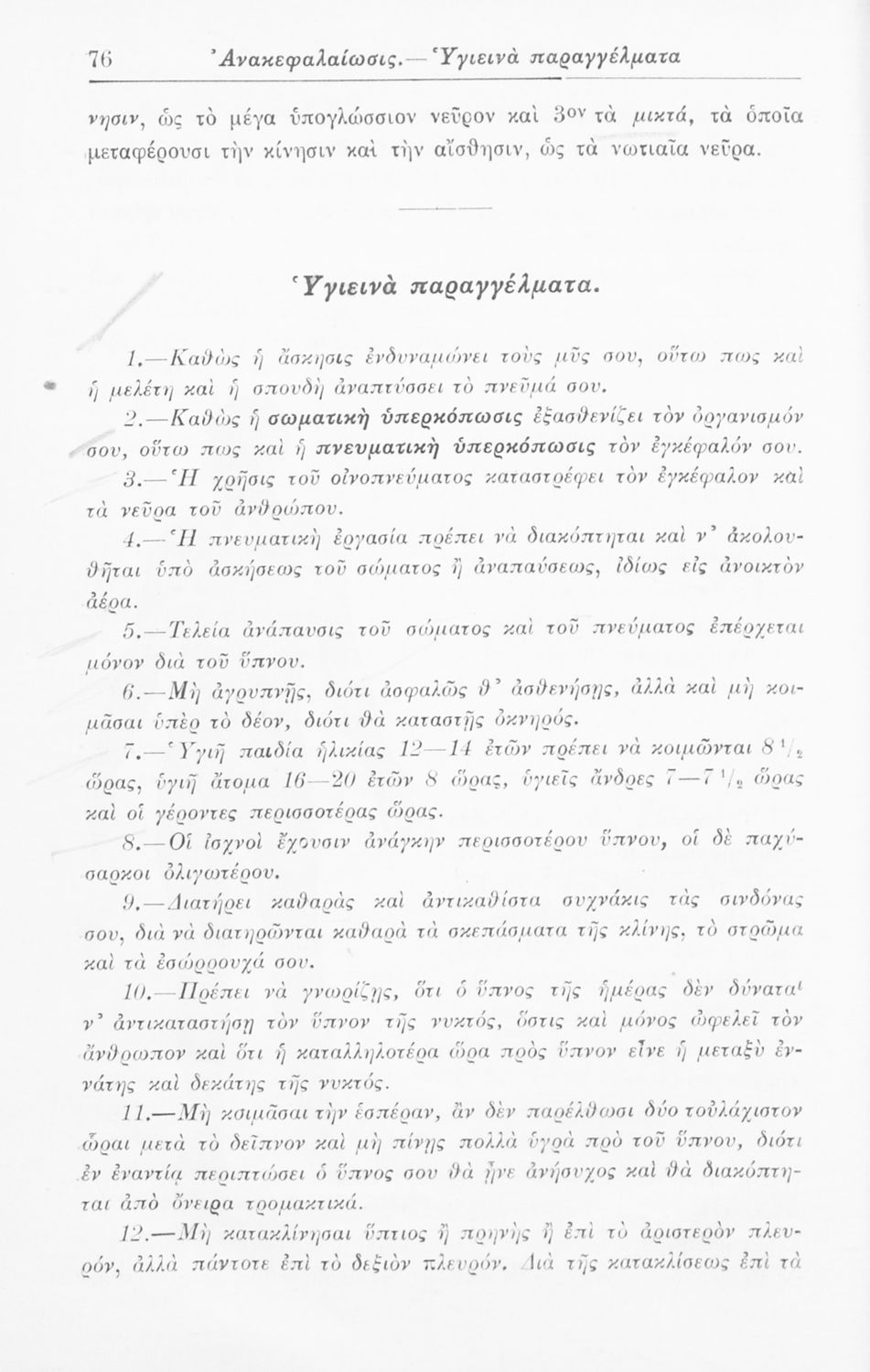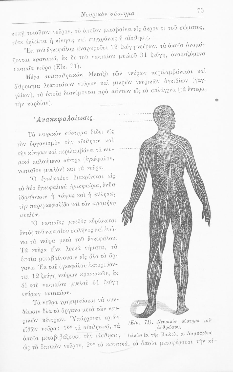 Βαθμίδα εκπαίδευσης: Πρωτοβάθμια, Δευτεροβάθμια Τάξη: Δημοτικό / Ελληνικό Σχολείο Μάθημα: Υγιεινή Γλώσσα: Καθαρεύουσα Παρουσίαση περιεχομένου: Σχολικό εγχειρίδιο για τις τάξεις του Δημοτικού και Ελληνικού σχολείου για το μάθημα της Υγιεινής. Το εγχειρίδιο περιλαμβάνει εισαγωγικά γενικές έννοιες και το αντικείμενο μελέτης της υγιεινής και της σωματολογίας. Ο κύριος κορμός του βιβλίου αναπτύσσει τις θεματικές της κίνησης των αρθρώσεων και των μυών, της διατροφής και της αναπνοής των οργανισμών και καταλήγει με το κεφάλαιο των αισθήσεων με τα αισθητήρια όργανα και το νευρικό σύστημα. |