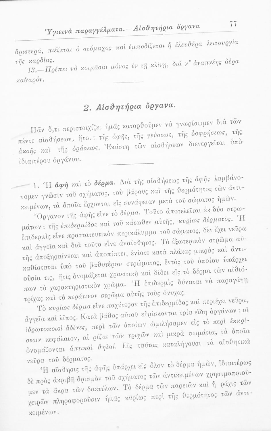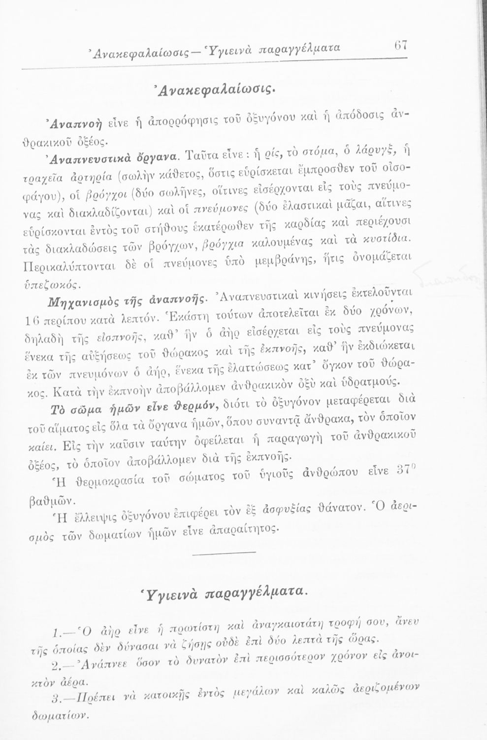 Σχολικό εγχειρίδιο για τις τάξεις του Δημοτικού και Ελληνικού σχολείου για το μάθημα της Υγιεινής. Το εγχειρίδιο περιλαμβάνει εισαγωγικά γενικές έννοιες και το αντικείμενο μελέτης της υγιεινής και της σωματολογίας. Ο κύριος κορμός του βιβλίου αναπτύσσει τις θεματικές της κίνησης των αρθρώσεων και των μυών, της διατροφής και της αναπνοής των οργανισμών και καταλήγει με το κεφάλαιο των αισθήσεων με τα αισθητήρια όργανα και το νευρικό σύστημα.