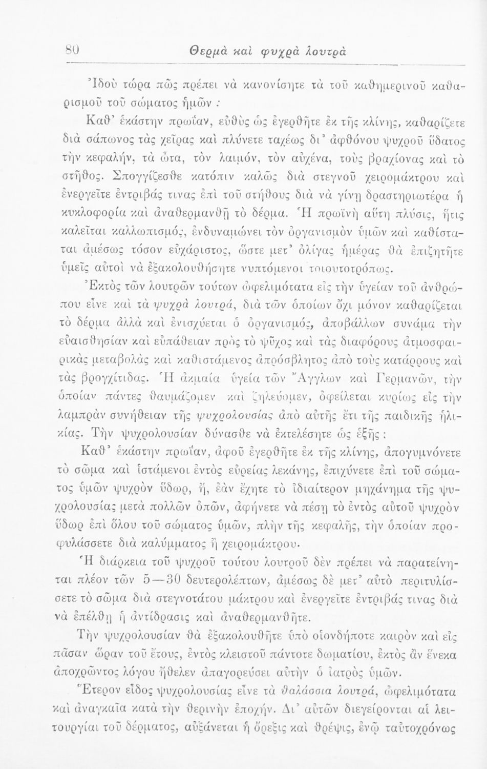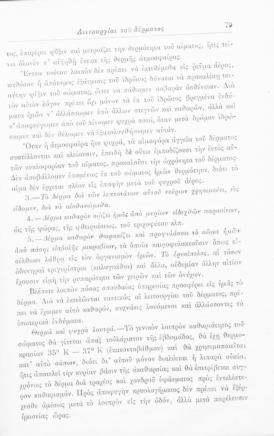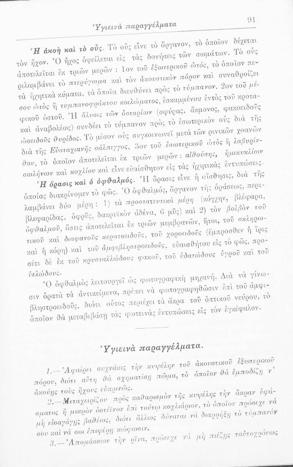 Σχολικό εγχειρίδιο για τις τάξεις του Δημοτικού και Ελληνικού σχολείου για το μάθημα της Υγιεινής. Το εγχειρίδιο περιλαμβάνει εισαγωγικά γενικές έννοιες και το αντικείμενο μελέτης της υγιεινής και της σωματολογίας. Ο κύριος κορμός του βιβλίου αναπτύσσει τις θεματικές της κίνησης των αρθρώσεων και των μυών, της διατροφής και της αναπνοής των οργανισμών και καταλήγει με το κεφάλαιο των αισθήσεων με τα αισθητήρια όργανα και το νευρικό σύστημα.