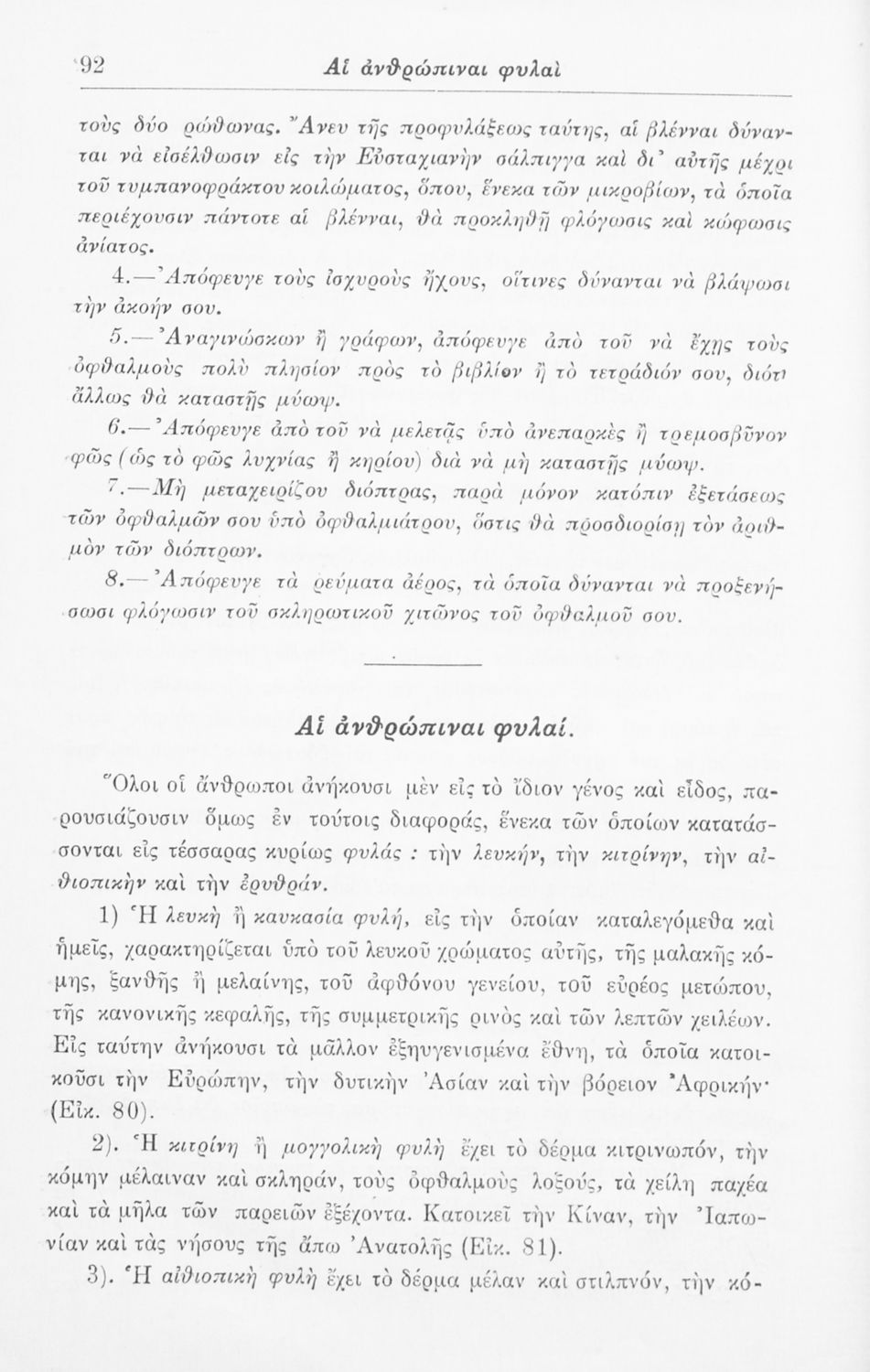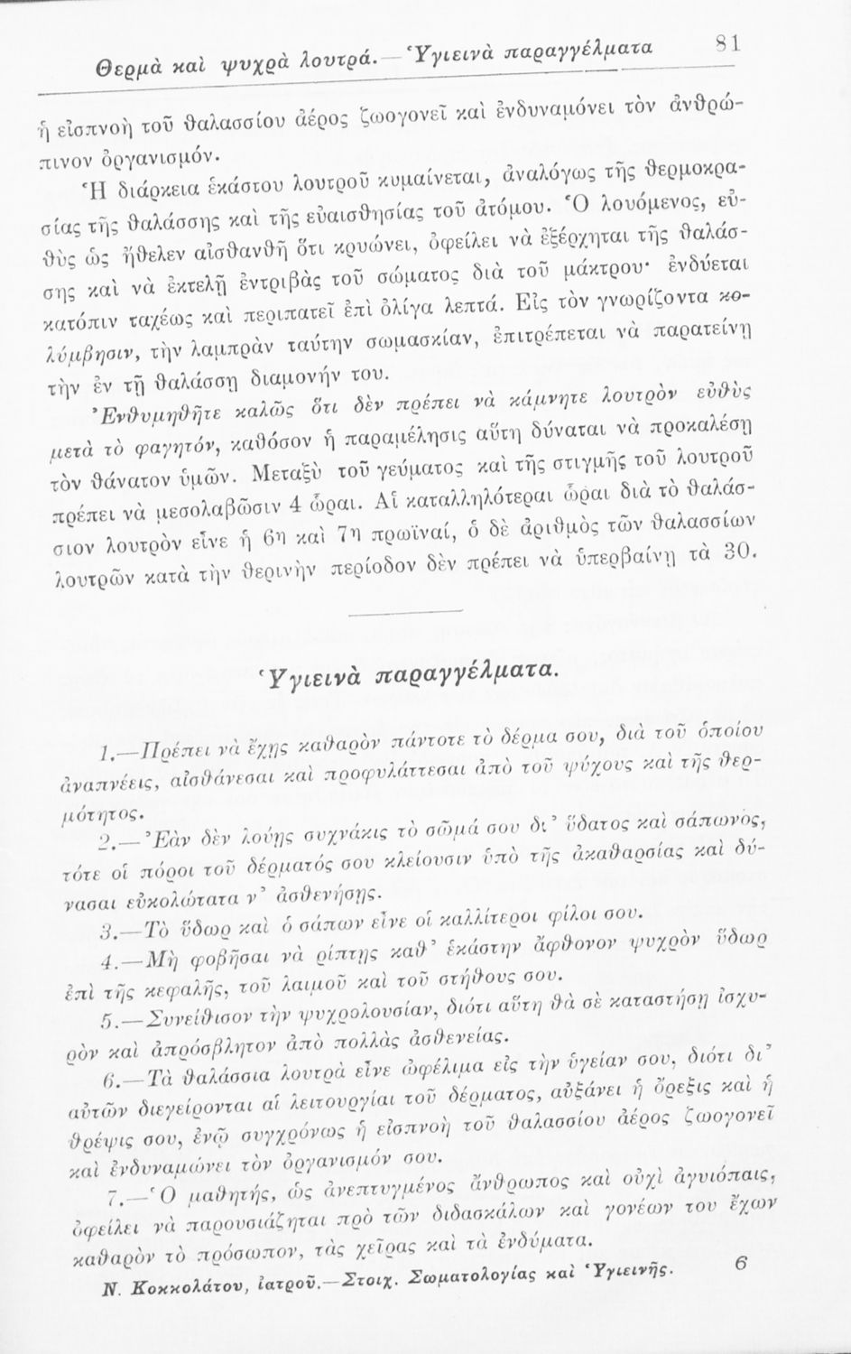 Βαθμίδα εκπαίδευσης: Πρωτοβάθμια, Δευτεροβάθμια Τάξη: Δημοτικό / Ελληνικό Σχολείο Μάθημα: Υγιεινή Γλώσσα: Καθαρεύουσα Παρουσίαση περιεχομένου: Σχολικό εγχειρίδιο για τις τάξεις του Δημοτικού και Ελληνικού σχολείου για το μάθημα της Υγιεινής. Το εγχειρίδιο περιλαμβάνει εισαγωγικά γενικές έννοιες και το αντικείμενο μελέτης της υγιεινής και της σωματολογίας. Ο κύριος κορμός του βιβλίου αναπτύσσει τις θεματικές της κίνησης των αρθρώσεων και των μυών, της διατροφής και της αναπνοής των οργανισμών και καταλήγει με το κεφάλαιο των αισθήσεων με τα αισθητήρια όργανα και το νευρικό σύστημα. |