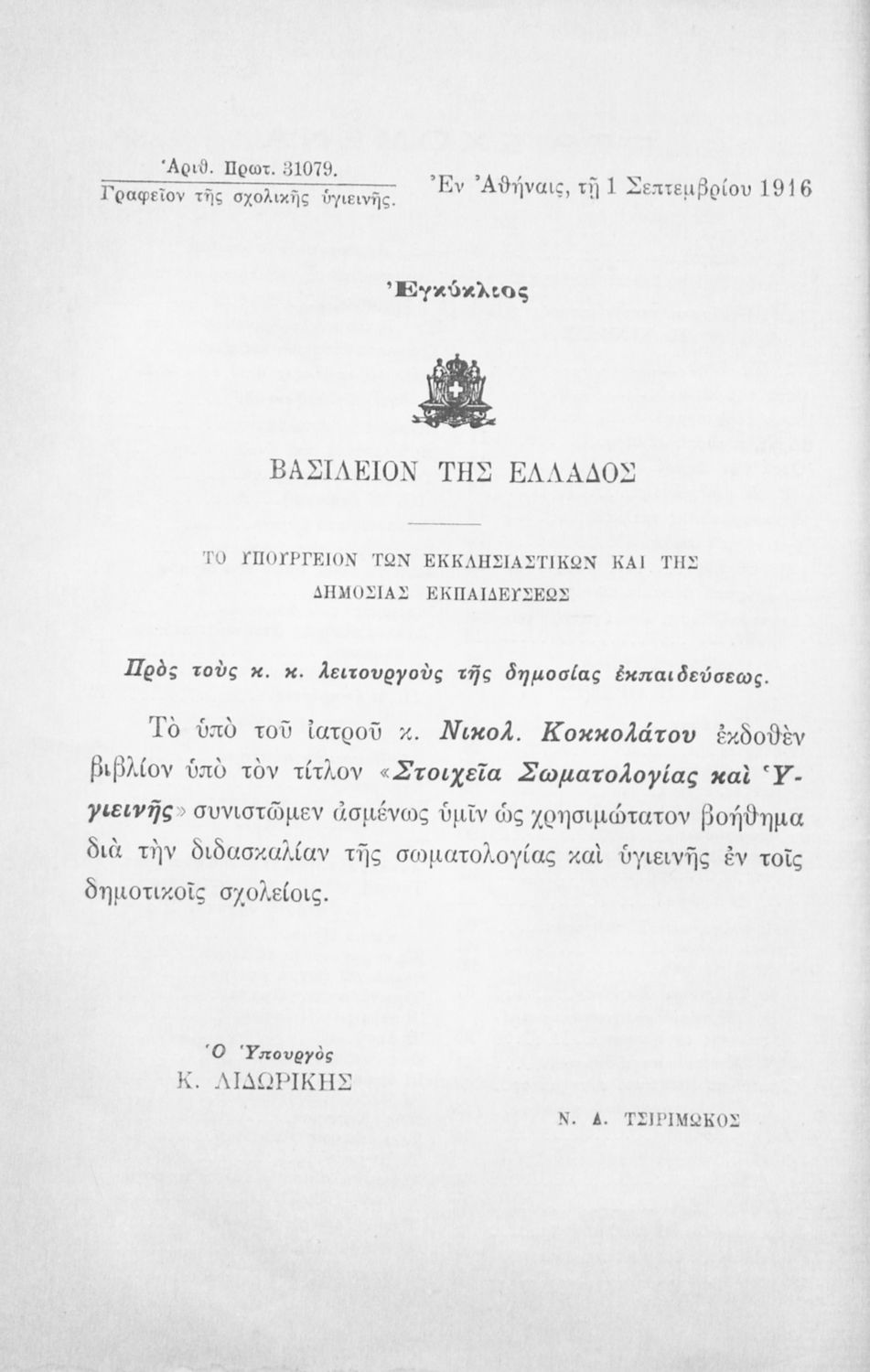 LDR 01881 2200217 4500 035 ## _a02-02077 040 ## _aΕλληνικό Λογοτεχνικό και Ιστορικό Αρχείο 041 ## _ael 100 ## _aΝικόλαος Χ. Κοκκολάτος 110 ## _a2077 245 0# _aΣτοιχεία σωματολογίας και υγιεινής προς χρήσιν των ανωτέρων τάξεων των δημοτικών και Ελληνικών Σχολείων 250 ## _a3η Έκδοση 260 ## _aΑθήνα _bΙωάννης Ν. Σιδέρης _c1916 300 ## _a100 _bΣκίτσα (ασπρόμαυρα) 520 ## _aΣχολικό εγχειρίδιο για τις τάξεις του Δημοτικού και Ελληνικού σχολείου για το μάθημα της Υγιεινής. Το εγχειρίδιο περιλαμβάνει εισαγωγικά γενικές έννοιες και το αντικείμενο μελέτης της υγιεινής και της σωματολογίας. Ο κύριος κορμός του βιβλίου αναπτύσσει τις θεματικές της κίνησης των αρθρώσεων και των μυών, της διατροφής και της αναπνοής των οργανισμών και καταλήγει με το κεφάλαιο των αισθήσεων με τα αισθητήρια όργανα και το νευρικό σύστημα. 521 ## _aΔημοτικό / Ελληνικό Σχολείο 522 ## _aΕλλάδα 546 ## _aΚαθαρεύουσα 563 ## _aΜαλακό Εξώφυλλο 583 ## _a31079/ 1-9-1916 _c1916 650 #4 _aΑισθήσεις _aΑναπνοή _aΔημοτικού και Ελληνικού _aΔιατροφή _aΚαθαρεύουσα _aΝευρικό σύστημα _aΣωματολογία _aΥγιεινή