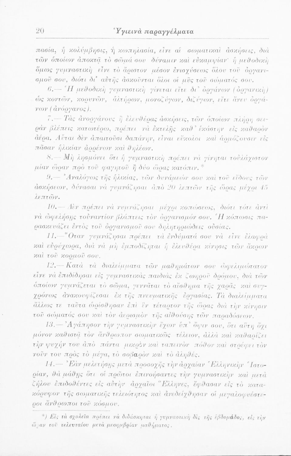 Σχολικό εγχειρίδιο για τις τάξεις του Δημοτικού και Ελληνικού σχολείου για το μάθημα της Υγιεινής. Το εγχειρίδιο περιλαμβάνει εισαγωγικά γενικές έννοιες και το αντικείμενο μελέτης της υγιεινής και της σωματολογίας. Ο κύριος κορμός του βιβλίου αναπτύσσει τις θεματικές της κίνησης των αρθρώσεων και των μυών, της διατροφής και της αναπνοής των οργανισμών και καταλήγει με το κεφάλαιο των αισθήσεων με τα αισθητήρια όργανα και το νευρικό σύστημα.