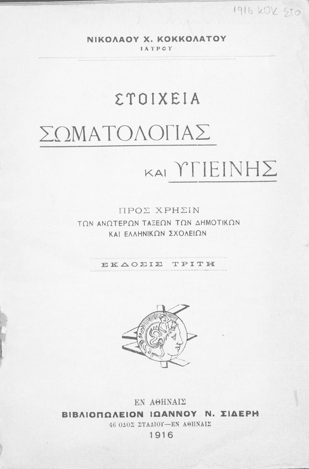 Τίτλος: Στοιχεία σωματολογίας και υγιεινής προς χρήσιν των ανωτέρων τάξεων των δημοτικών και Ελληνικών Σχολείων