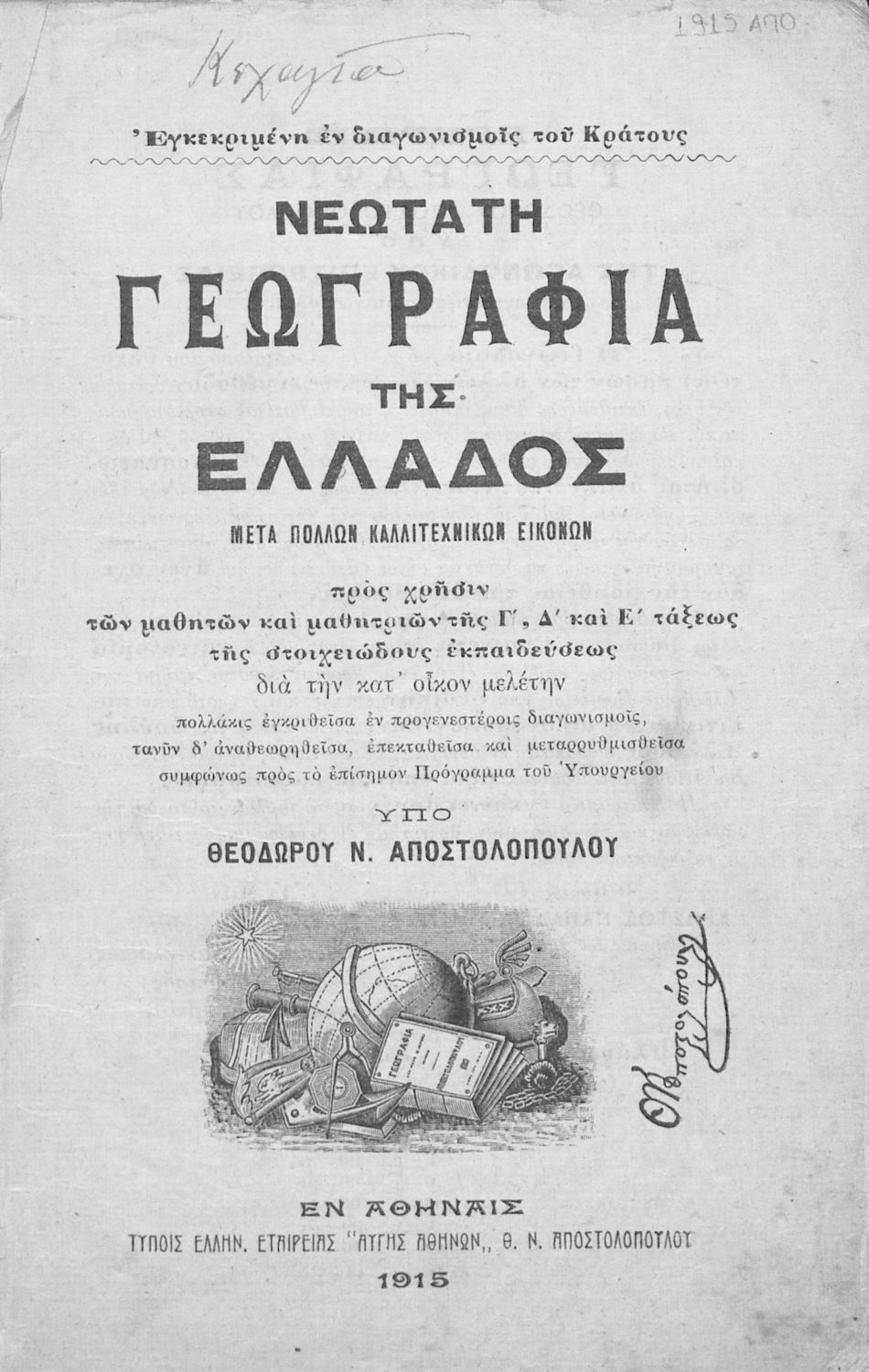 Πρόκειται για μαθητικό βοήθημα, με πλούσια εικονογράφηση, ενισχυτικό της διδασκαλίας και κατανόησης του μαθήματος της γεωγραφίας της Ελλάδας στη Γ΄, Δ΄ και Ε΄ Δημοτικού. Φέρει λίγες προσωπικές σημειώσεις του μαθητή και σημειώνεται πως οι τελευταίες σελίδες εμφανίζονται μερικώς σχισμένες.