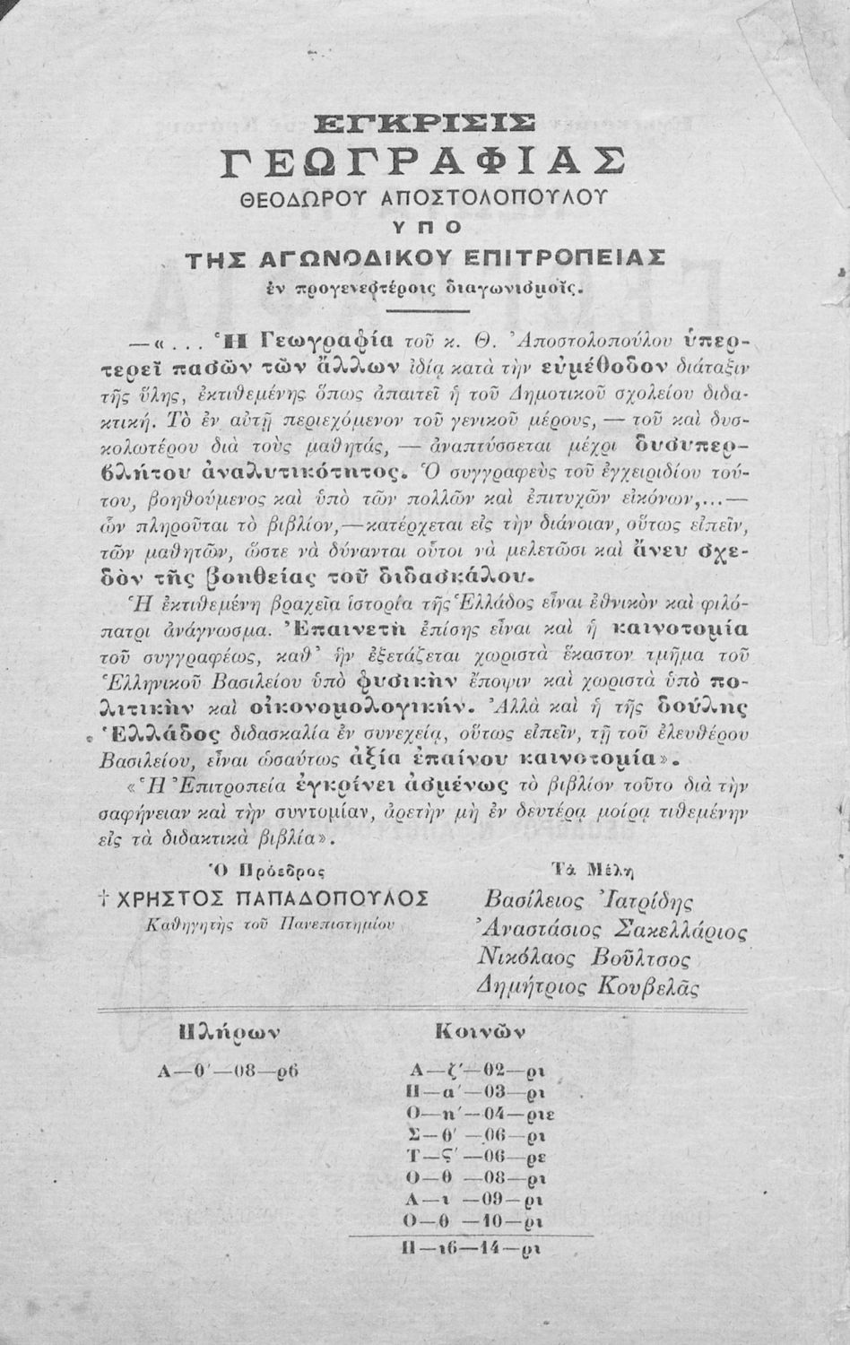 Κωδικός αναγνώρισης: 02-02085 Τίτλος: Νεωτάτη γεωγραφία της Ελλάδος : μετά πολλών καλλιτεχνικών εικόνων : προς χρήσιν των μαθητών και μαθητριών της Γ΄, Δ΄ και Ε΄ τάξεως της στοιχειώδους εκπαιδεύσεως : διά την κατ΄ οίκον μελέτη Συγγραφέας: Θεόδωρος Ν. Αποστολόπουλος Μέγεθος και υπόστρωμα: Μαθητικό βοήθημα, μαλακό εξώφυλλο, 96 σελίδες. Εικόνες (ασπρόμαυρες), σκίτσα (ασπρόμαυρα). |