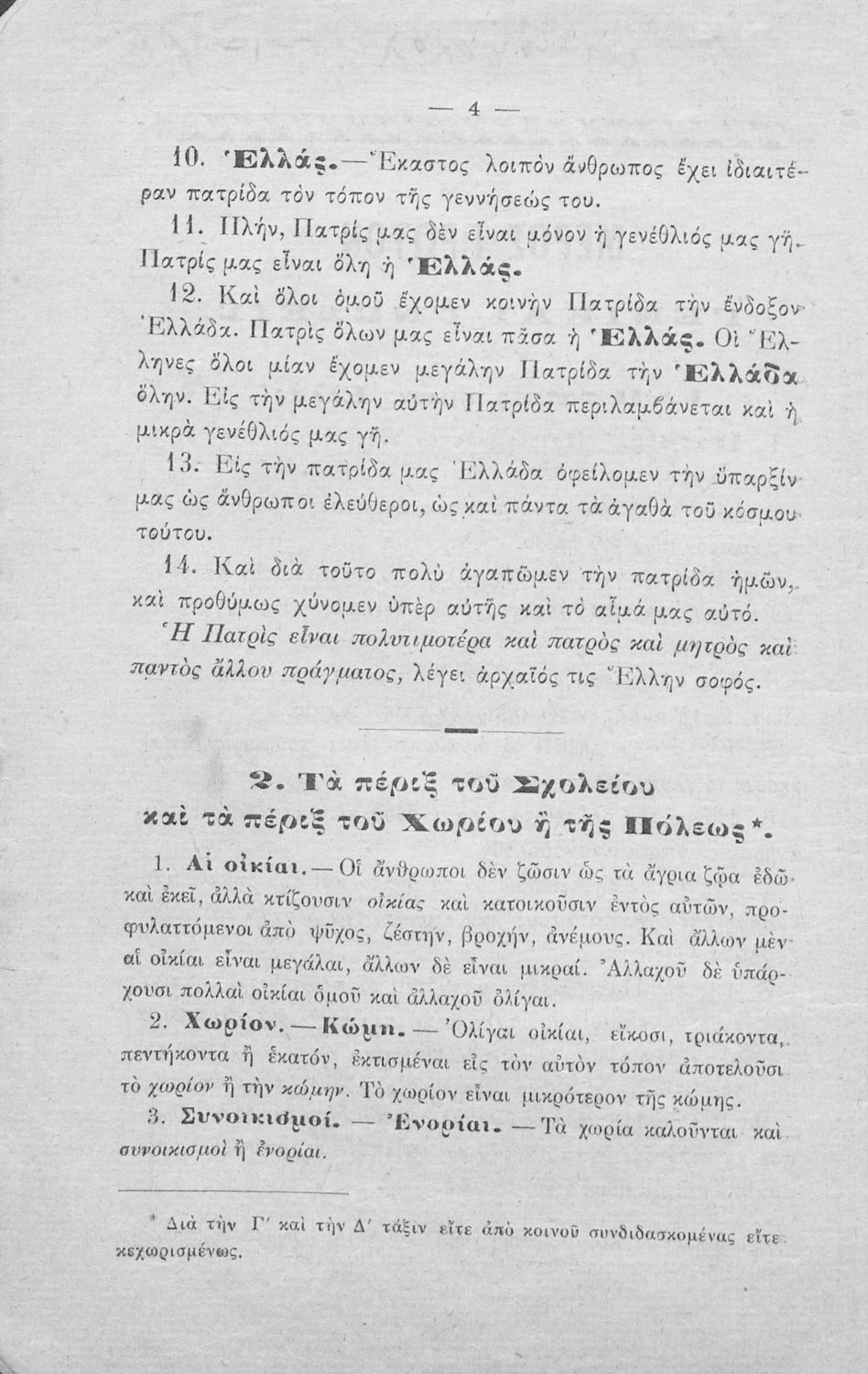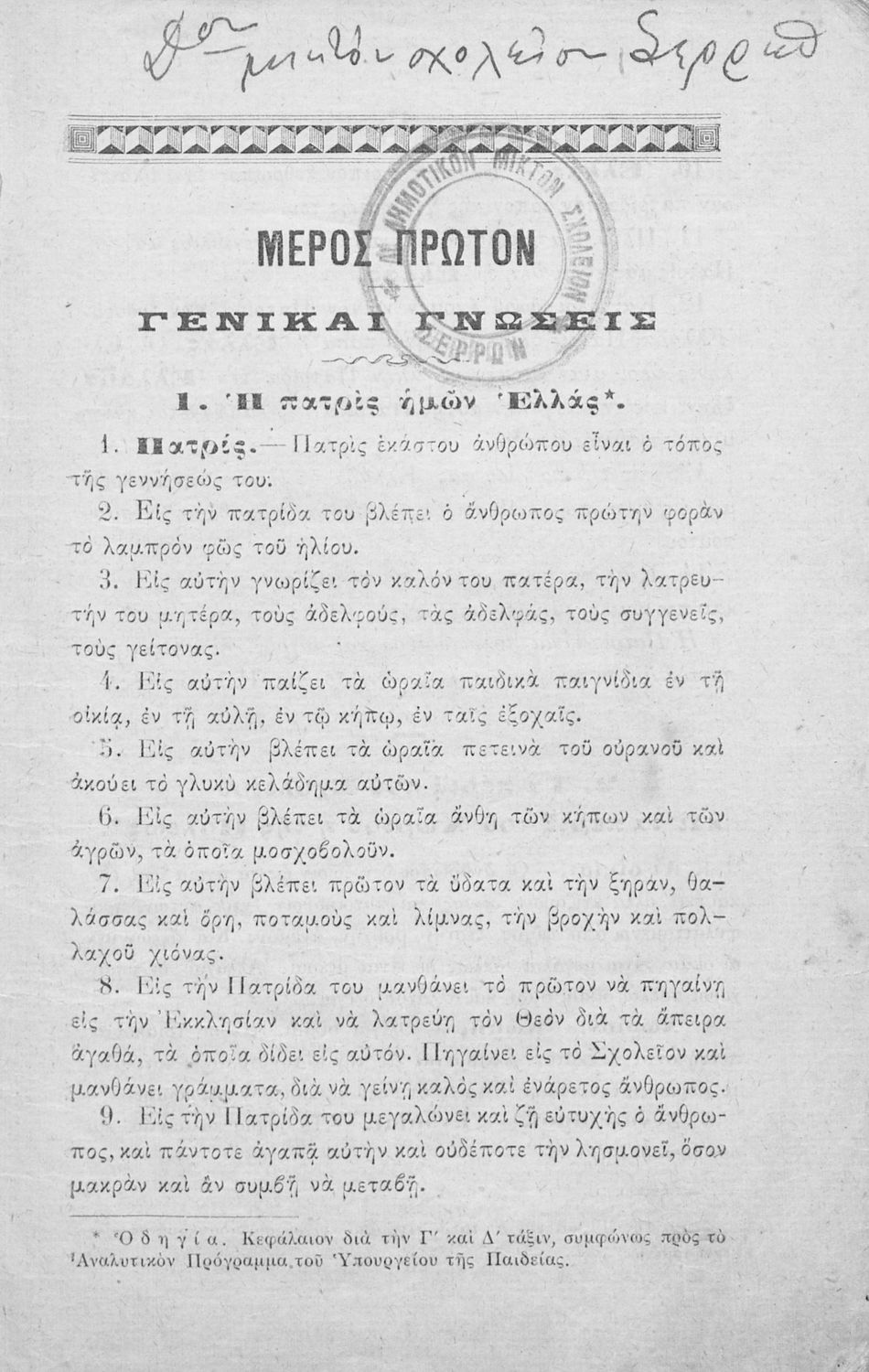 Βαθμίδα εκπαίδευσης: Πρωτοβάθμια Τάξη: Γ' Δημοτικού / Δ' Δημοτικού / Ε' Δημοτικού Μάθημα: Γεωγραφία Γλώσσα: Καθαρεύουσα Παρουσίαση περιεχομένου: Πρόκειται για μαθητικό βοήθημα, με πλούσια εικονογράφηση, ενισχυτικό της διδασκαλίας και κατανόησης του μαθήματος της γεωγραφίας της Ελλάδας στη Γ΄, Δ΄ και Ε΄ Δημοτικού. Φέρει λίγες προσωπικές σημειώσεις του μαθητή και σημειώνεται πως οι τελευταίες σελίδες εμφανίζονται μερικώς σχισμένες. |