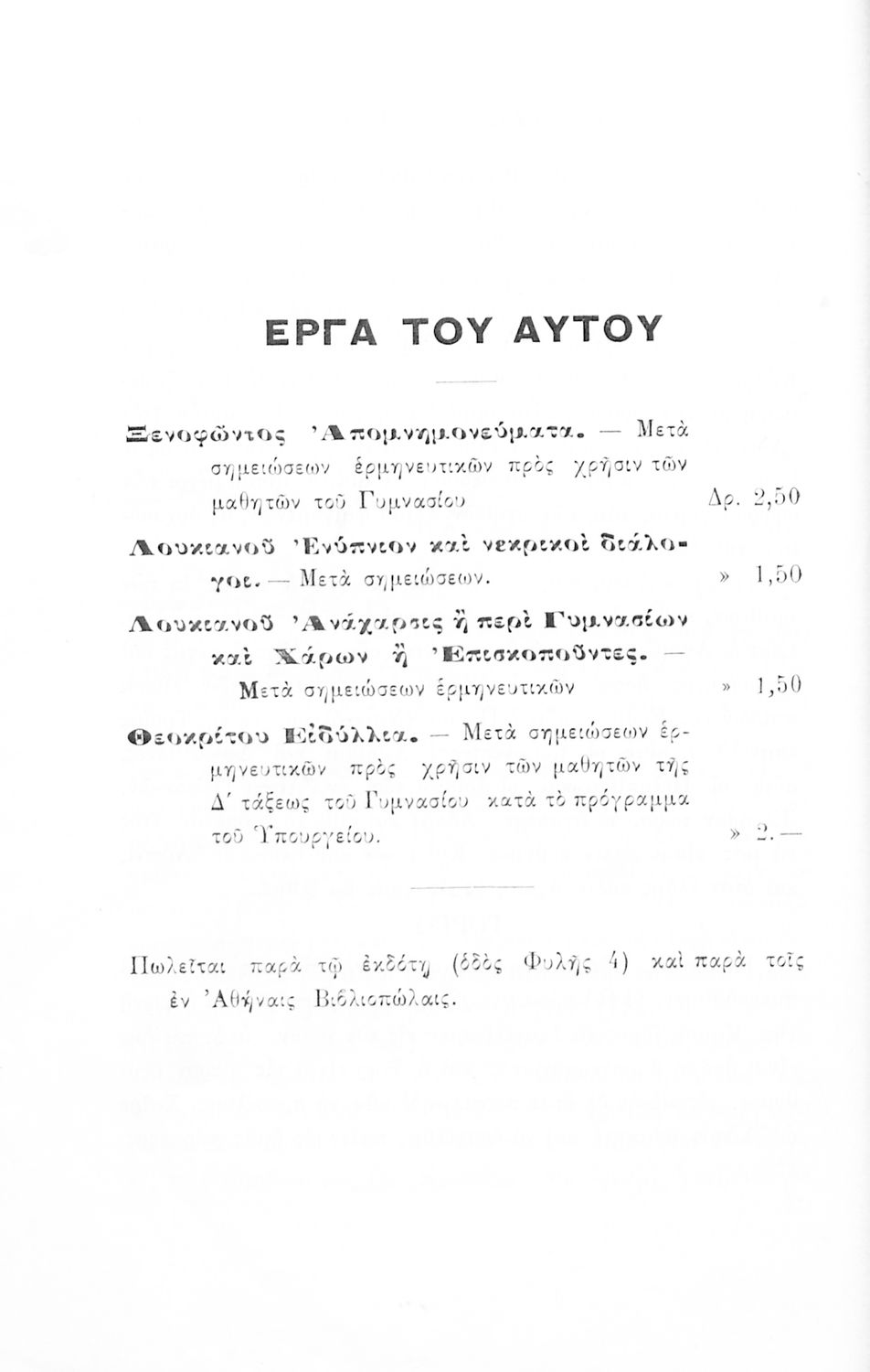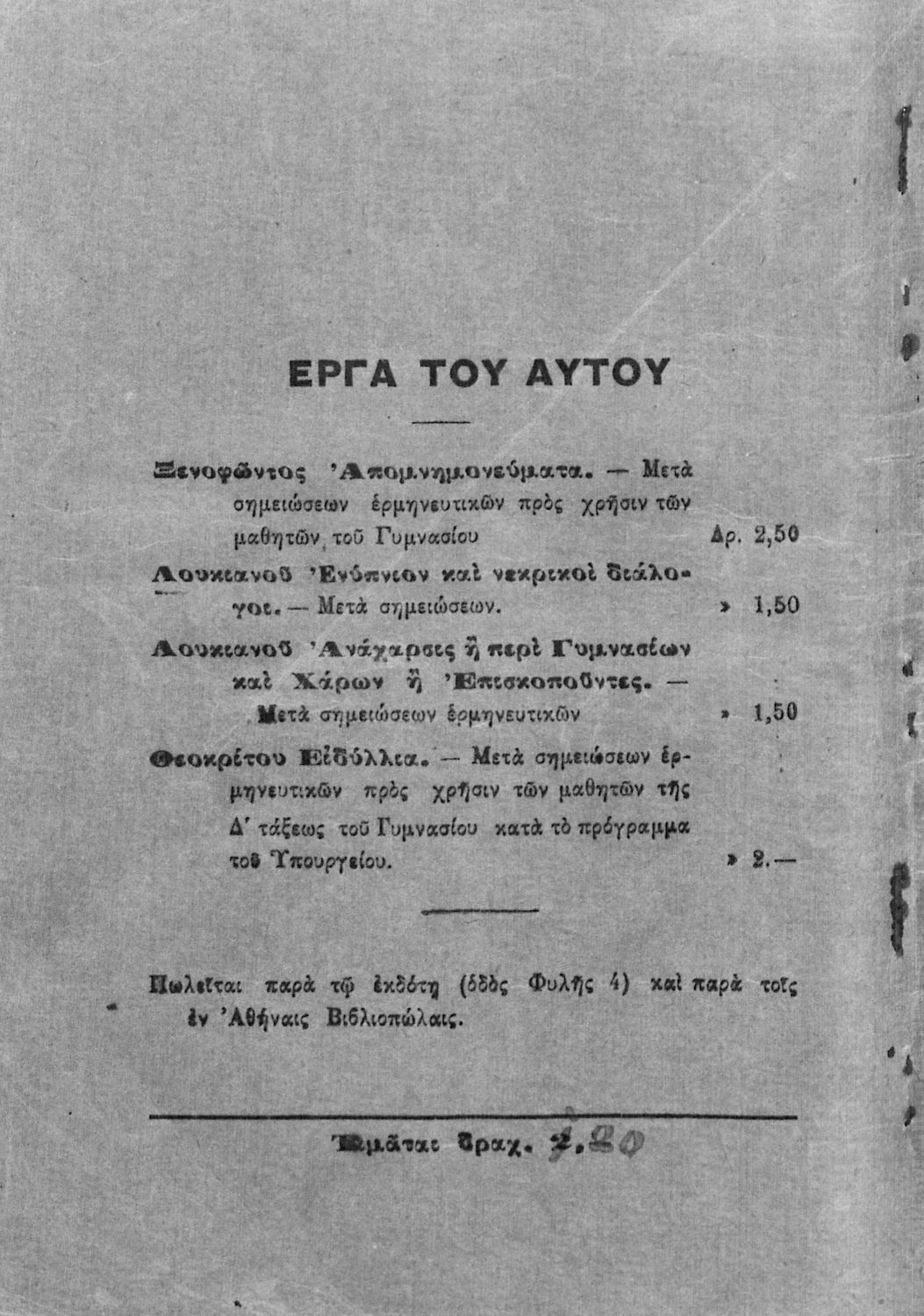 Τίτλος: Θεοκρίτου Ειδύλλια μετά σημειώσεων ερμηνευτικών προς χρήσιν των μαθητών της Δ΄ τάξεως του Γυμνασίου
