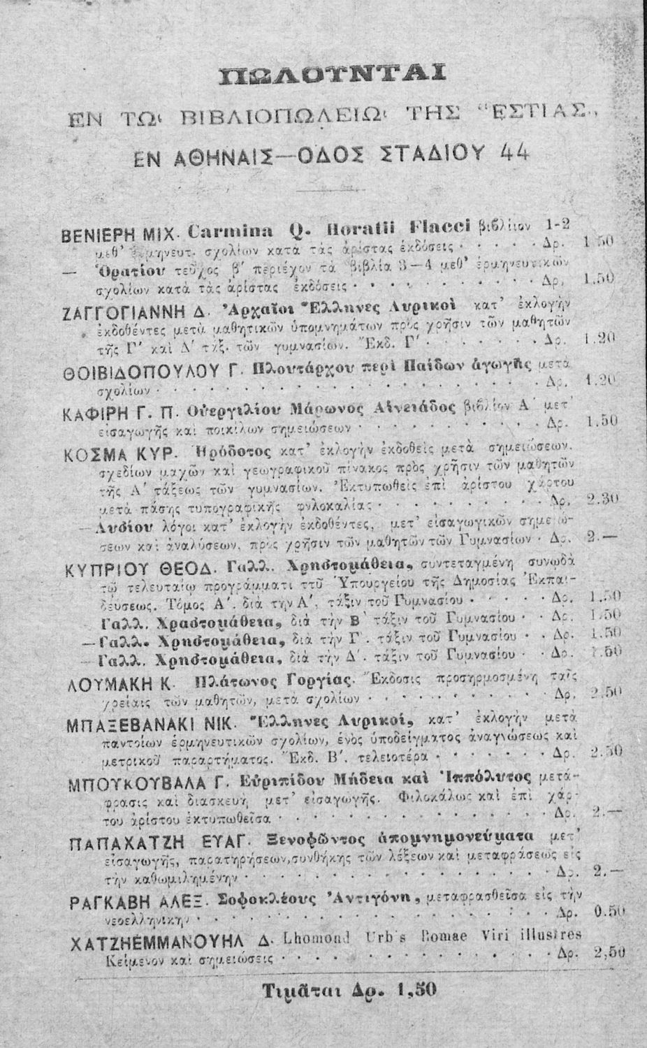 Τάξη:  Γ' Γυμνασίου / Α' Διδασκαλείου Αρρένων / Β' Διδασκαλείων Θηλέων