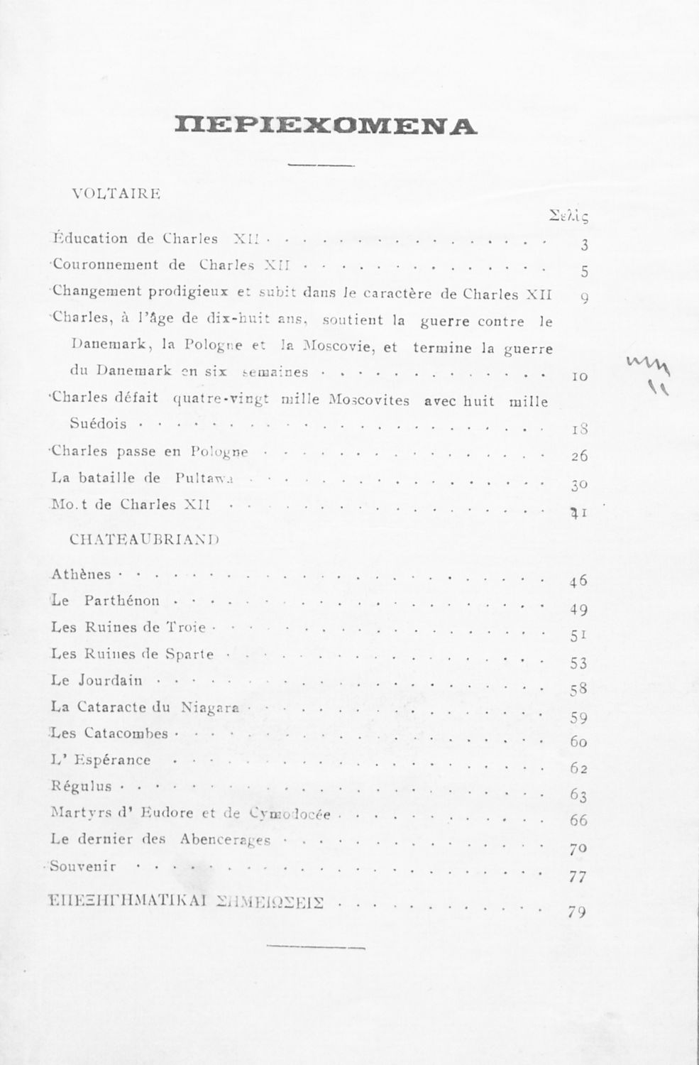 Σχολικό εγχειρίδιο Γαλλικών για τις Γ΄ Γυμνάσιου, Β΄ Διδασκαλείου Θηλέων και Α' Διδασκαλείου Αρρένων που περιέχει αποσπάσματα έργων Γάλλων συγγραφέων, και γλωσσικά και ερμηνευτικά σχόλια.