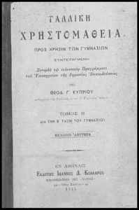 Κωδικός αναγνώρισης: 02-02091 Τίτλος: Γαλλική χρηστομάθεια προς χρήσιν των Γυμνασίων, Τόμος Β΄ δια την Β΄ τάξιν του Γυμνασίου Συγγραφέας: Θεόδωρος Γ. Κύπριος Μέγεθος και υπόστρωμα: Σχολικό εγχειρίδιο, σκληρό εξώφυλλο, 104 σελίδες. |