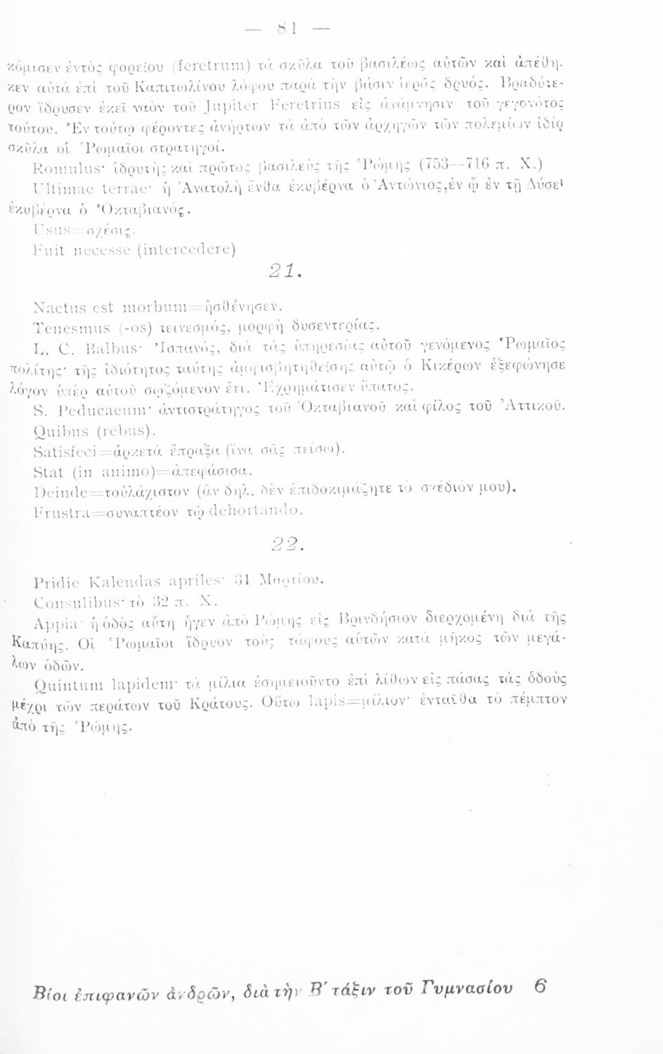 Κωδικός αναγνώρισης: 02-02096 Τίτλος: Κορνηλίου Νέπωτος Βίοι επιφανών ανδρών, Γ. Ιουλίου Καίσαρος Απομνημονεύματα περί του εμφυλίου πολέμου (Βιβλ. ΙΙΙ, Κεφ. 82-104), Κ. Κούρτιου Ρούφου Περί των κατορθωμάτων του Μ. Αλεξάνδρου μετά πλείστων σημειώσεων, γραμματικών, πραγματικών, ιστορικών, γεωγραφικών κ. λ. π. προς χρήσιν των μαθητών της Β΄ τάξεως του Γυμνασίου κατά το τελευταίο πρόγραμμα του Υπουργείου Παιδείας Συγγραφέας: Κορνήλιος Νέπως (Cornelius Nepos), Γεώργιος Μερκ. Οικονόμου (σχόλια) Μέγεθος και υπόστρωμα: Μαθητικό βοήθημα, σκληρό εξώφυλλο, 81 σελίδες. |