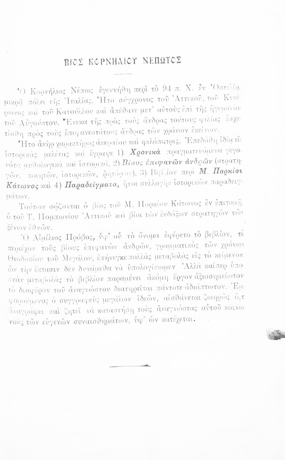 Μαθητικό βοήθημα Λατινικών Β΄ Γυμνασίου που περιλαμβάνει σύντονο βιογραφικό σημείωμα του Νέπωτα, αποσπάσματα από το έργο του Βίοι Επιφανών Ανδρών, και ερμηνευτικές σημειώσεις.