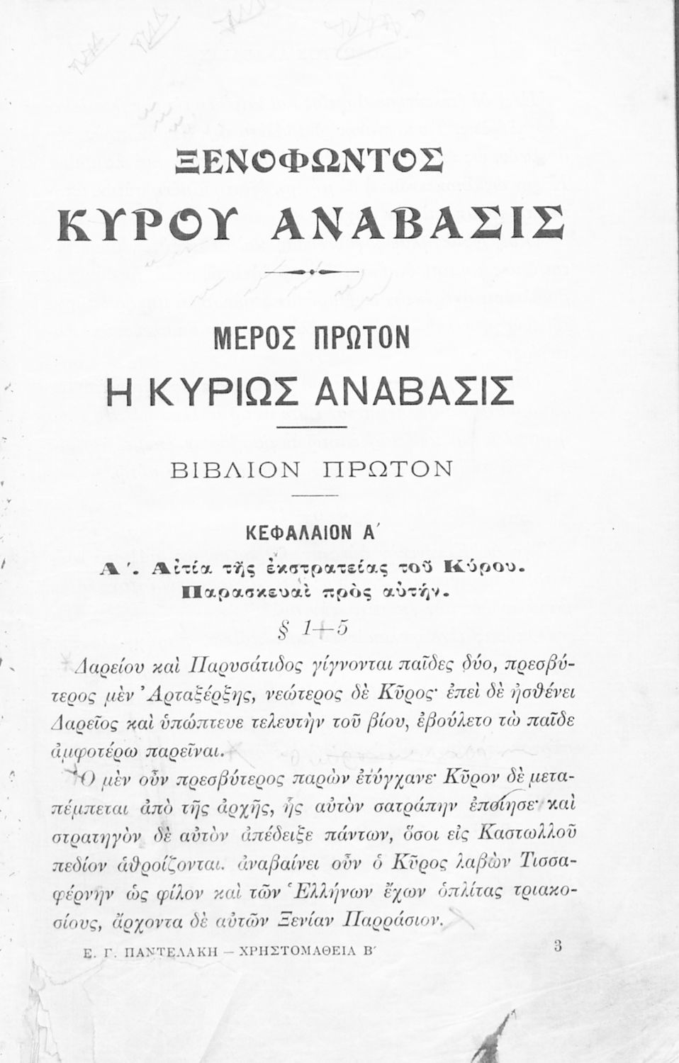 Ελληνική χρηστομάθεια κατά τας νεωτάτας διδακτικάς μεθόδους τόμος Β΄ Ξενοφώντος Κύρου Ανάβασις βιβλίον Α΄, Β΄, Γ΄ κατά το νέον πρόγραμμα του Υπουργείου της Παιδείας