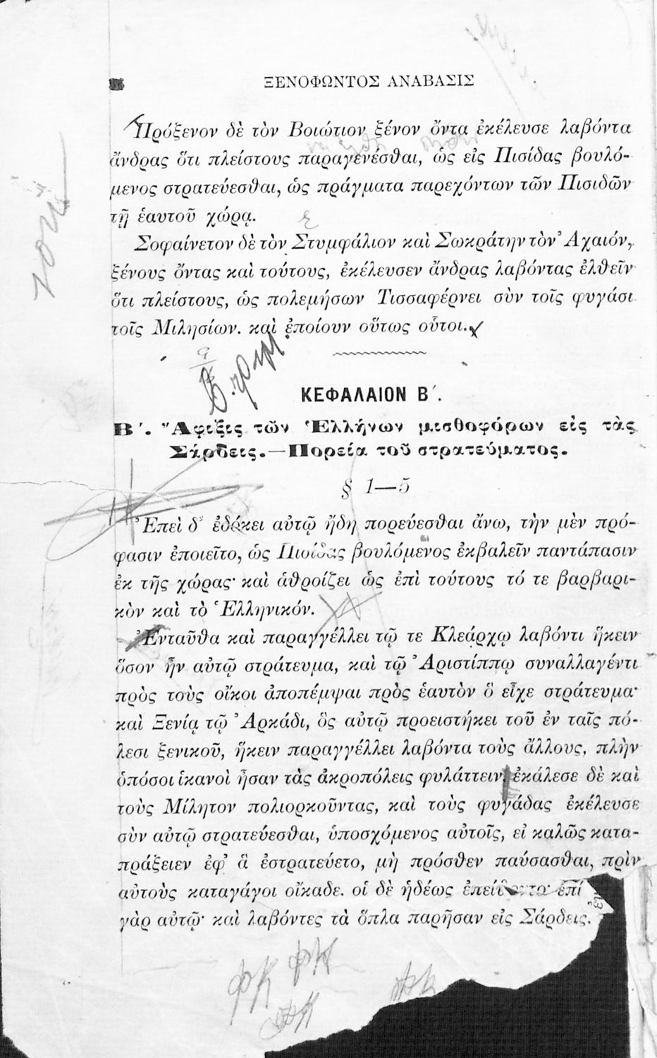 Σχολικό εγχειρίδιο Αρχαίων Ελληνικών Β' Ελληνικού Σχολείου που περιλαμβάνει αποσπάσματα από το έργο του Ξενοφώντα Κύρου Ανάβασις, ερμηνευτικές, γλωσσικές, γραμματικές και συντακτικές παρατηρήσεις, και ασκήσεις