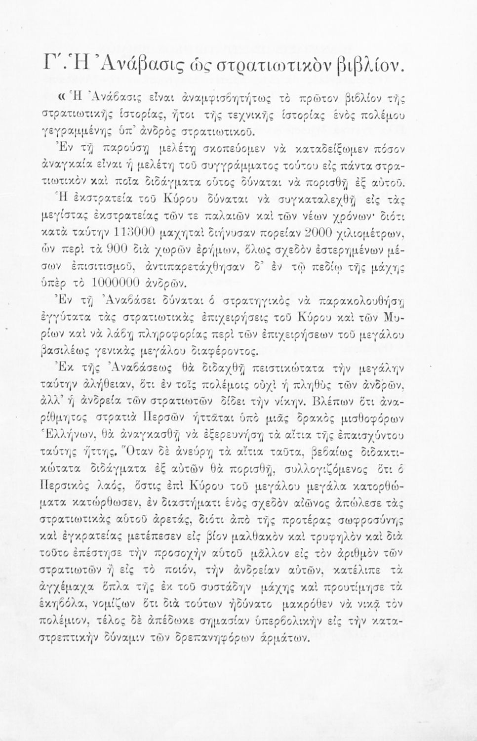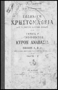 Σχολικό εγχειρίδιο Αρχαίων Ελληνικών για τα Ελληνικά Σχολεία και Παρθεναγωγεία που περιλαμβάνει αποσπάσματα από το έργο του Ξενοφώντα Κύρου Ανάβασις, και λεξικογραφικές παρατηρήσεις.