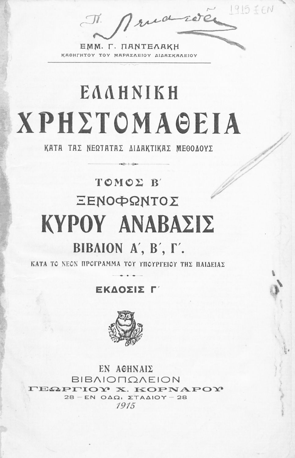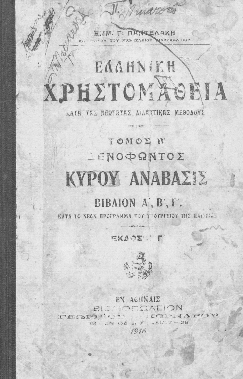 Ελληνική χρηστομάθεια κατά τας νεωτάτας διδακτικάς μεθόδους τόμος Β΄ Ξενοφώντος Κύρου Ανάβασις βιβλίον Α΄, Β΄, Γ΄ κατά το νέον πρόγραμμα του Υπουργείου της Παιδείας