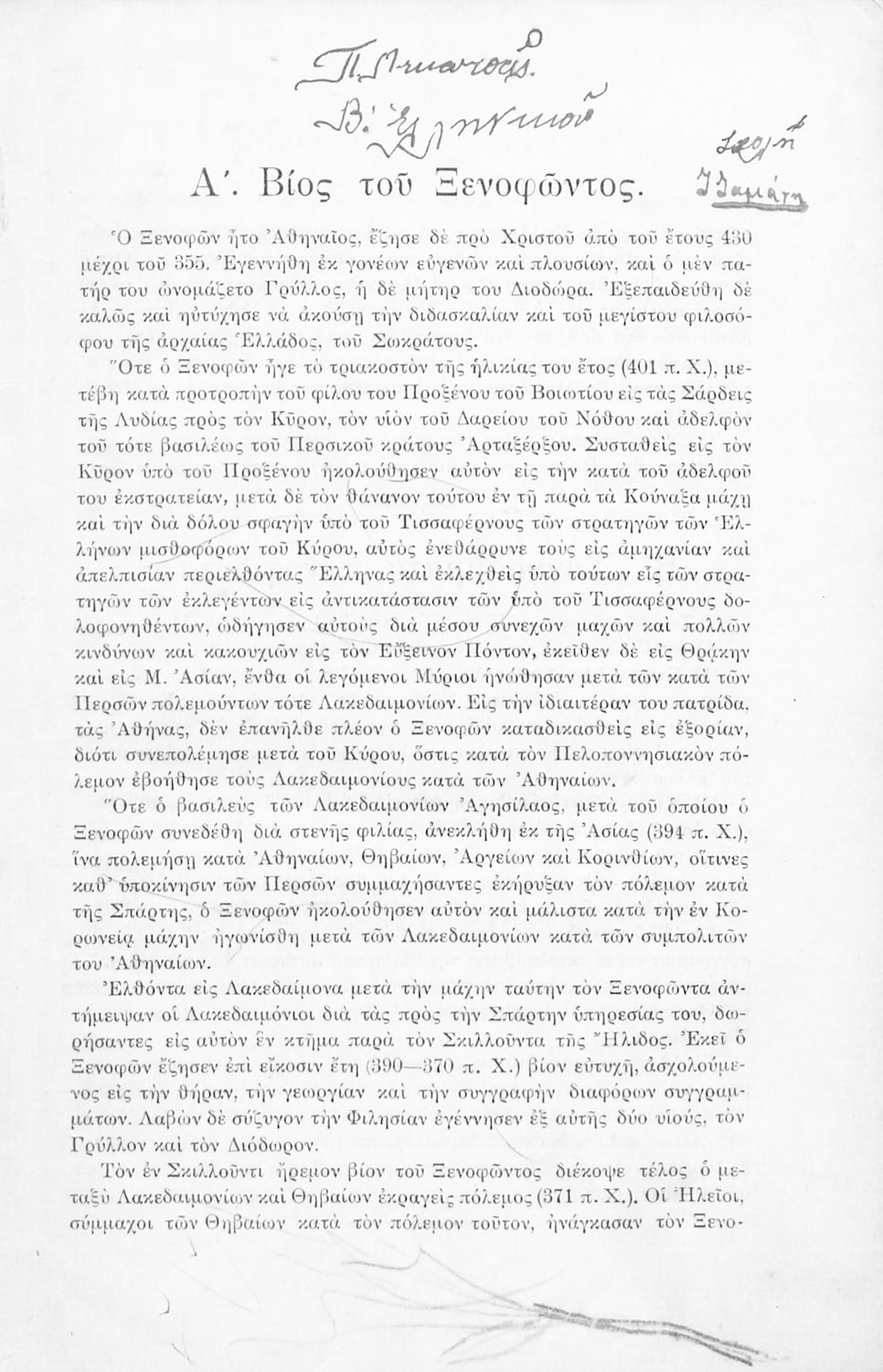 Σχολικό εγχειρίδιο Αρχαίων Ελληνικών Γ' Ελληνικού Σχολείου που περιλαμβάνει αποσπάσματα από το έργο του Ξενοφώντα Ελληνικά και τα έργα του Λουκιανού Ενύπνιον και Ανάχαρσις, βιογραφικά σημειώματα των ...