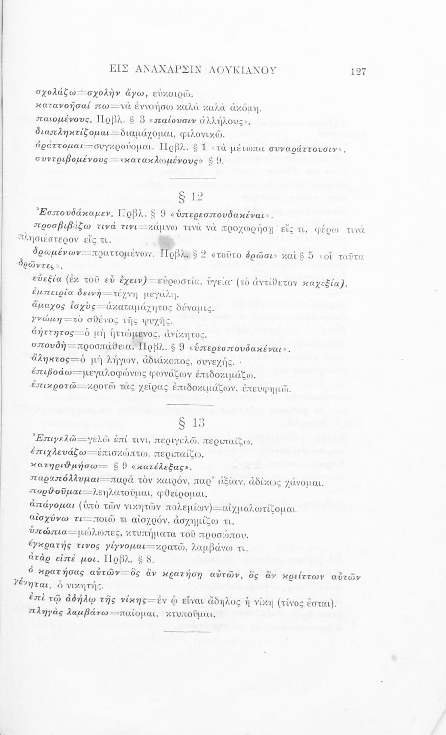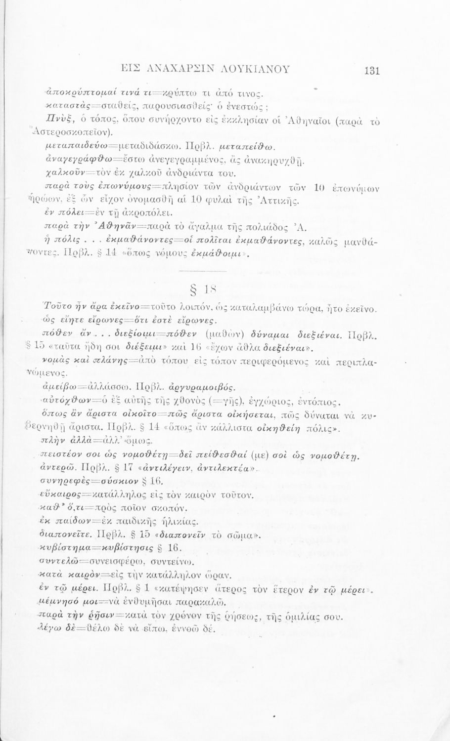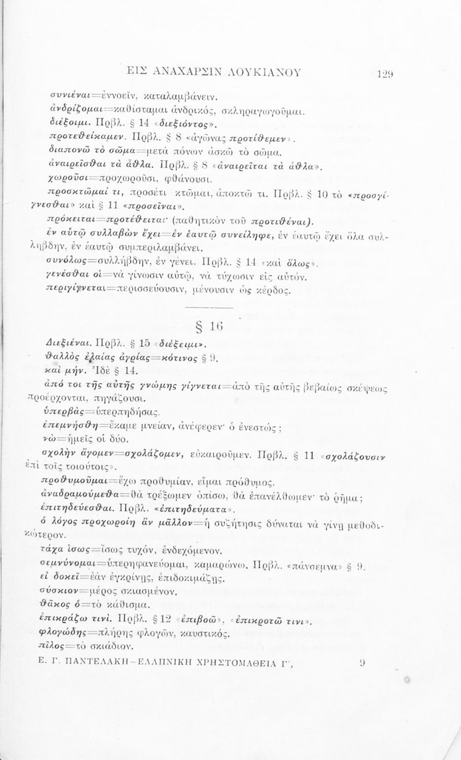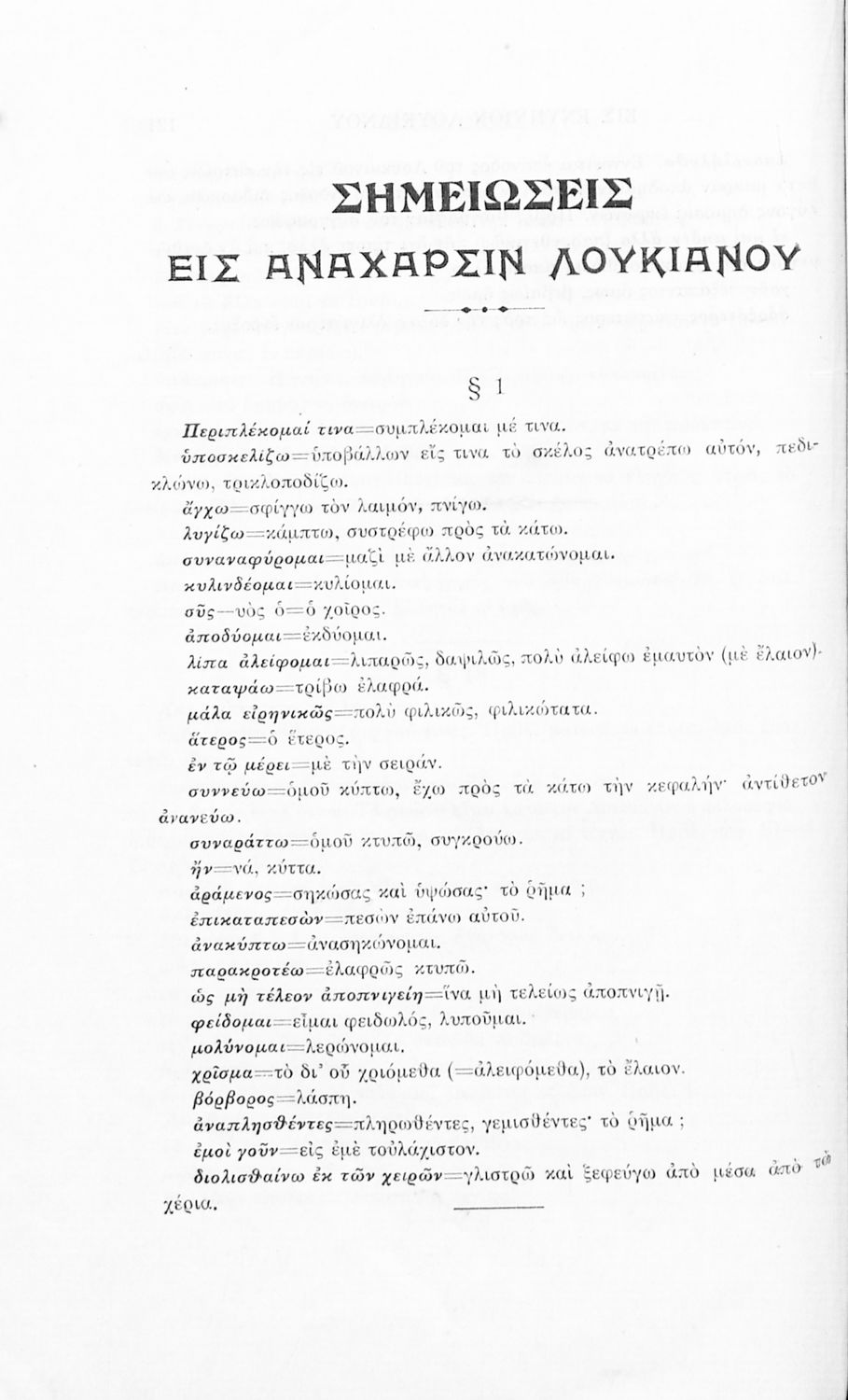 Σχολικό εγχειρίδιο Αρχαίων Ελληνικών Γ' Ελληνικού Σχολείου που περιλαμβάνει αποσπάσματα από το έργο του Ξενοφώντα Ελληνικά και τα έργα του Λουκιανού Ενύπνιον και Ανάχαρσις, βιογραφικά σημειώματα των συγγραφέων, ερμηνευτικές και πραγματολογικές σημειώσεις.