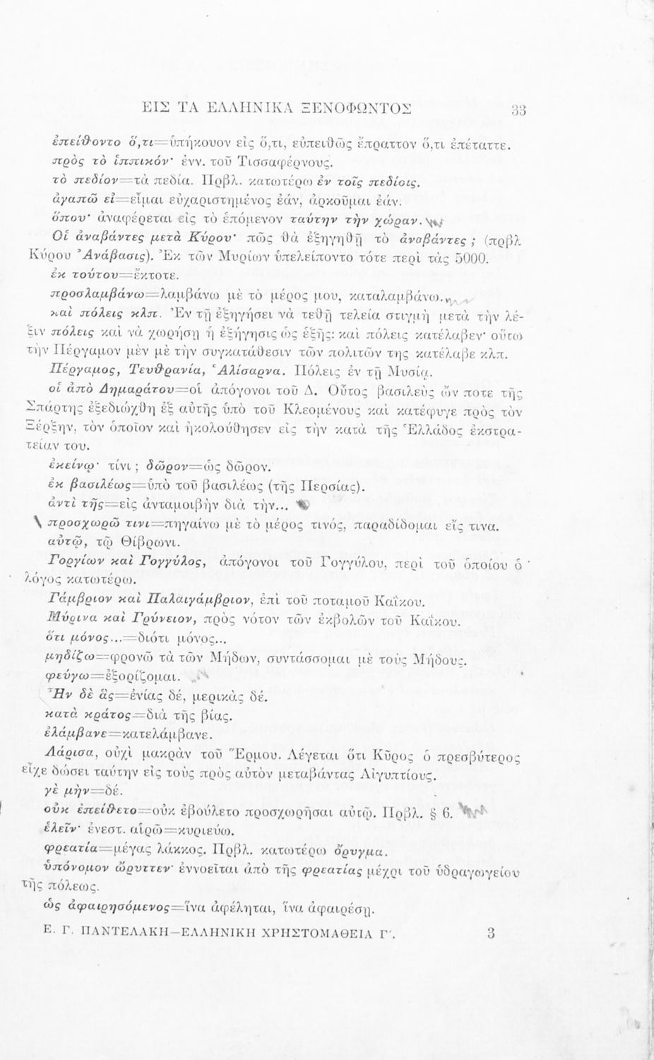 Σχολικό εγχειρίδιο Αρχαίων Ελληνικών για τα Ελληνικά Σχολεία και Παρθεναγωγεία που περιλαμβάνει αποσπάσματα από το έργο του Ξενοφώντα Κύρου Ανάβασις, και λεξικογραφικές παρατηρήσεις.