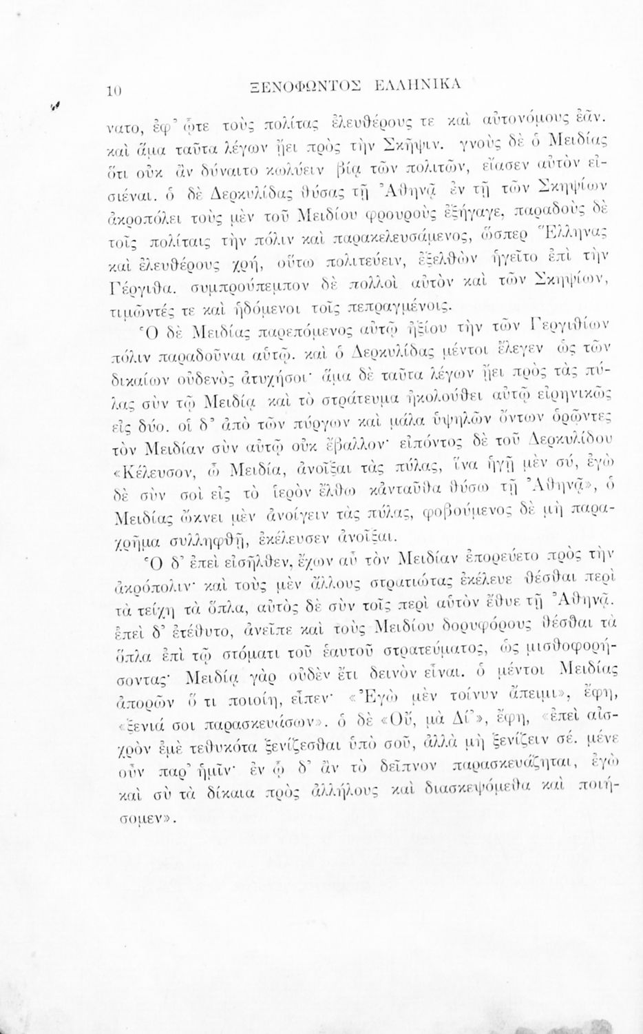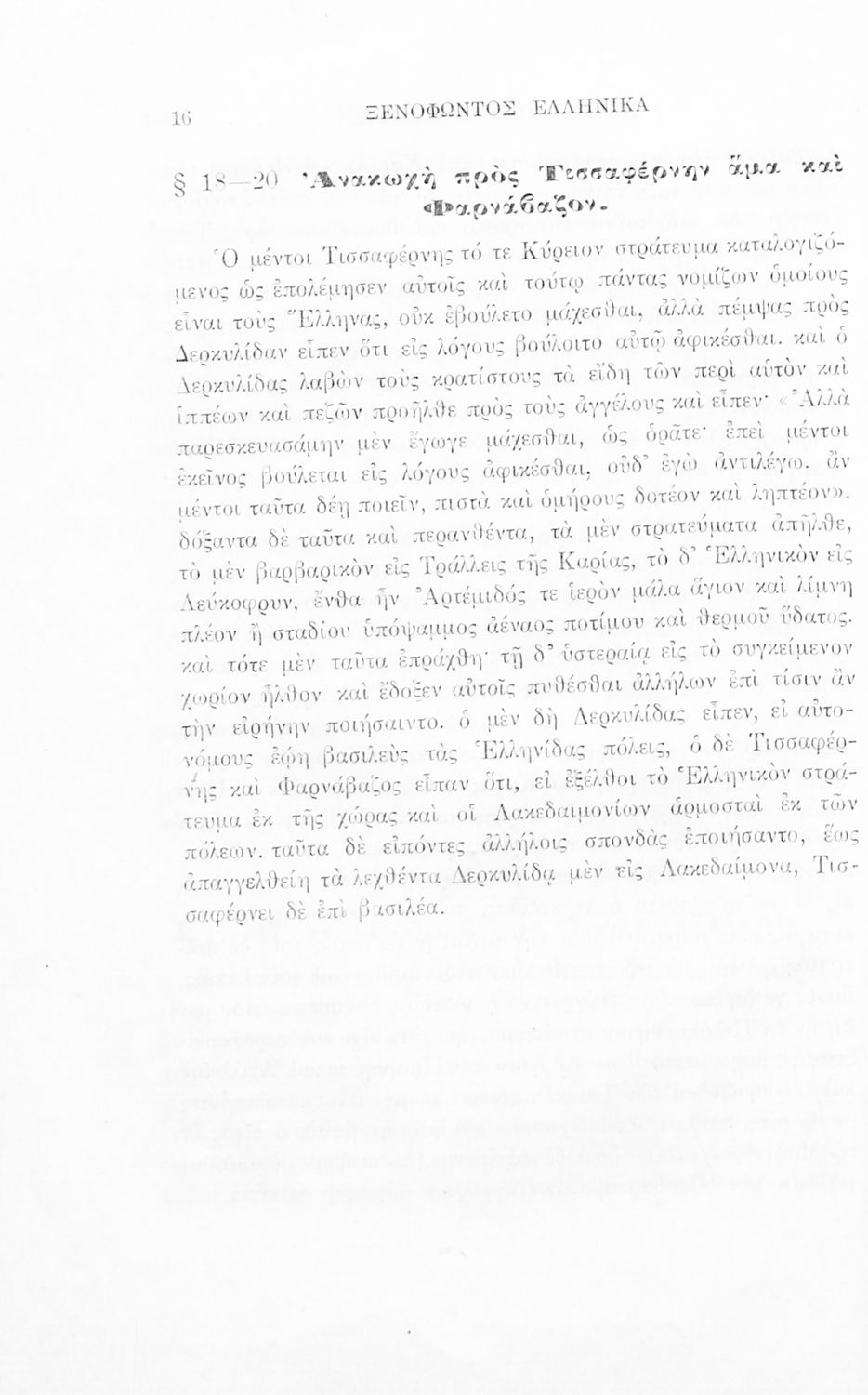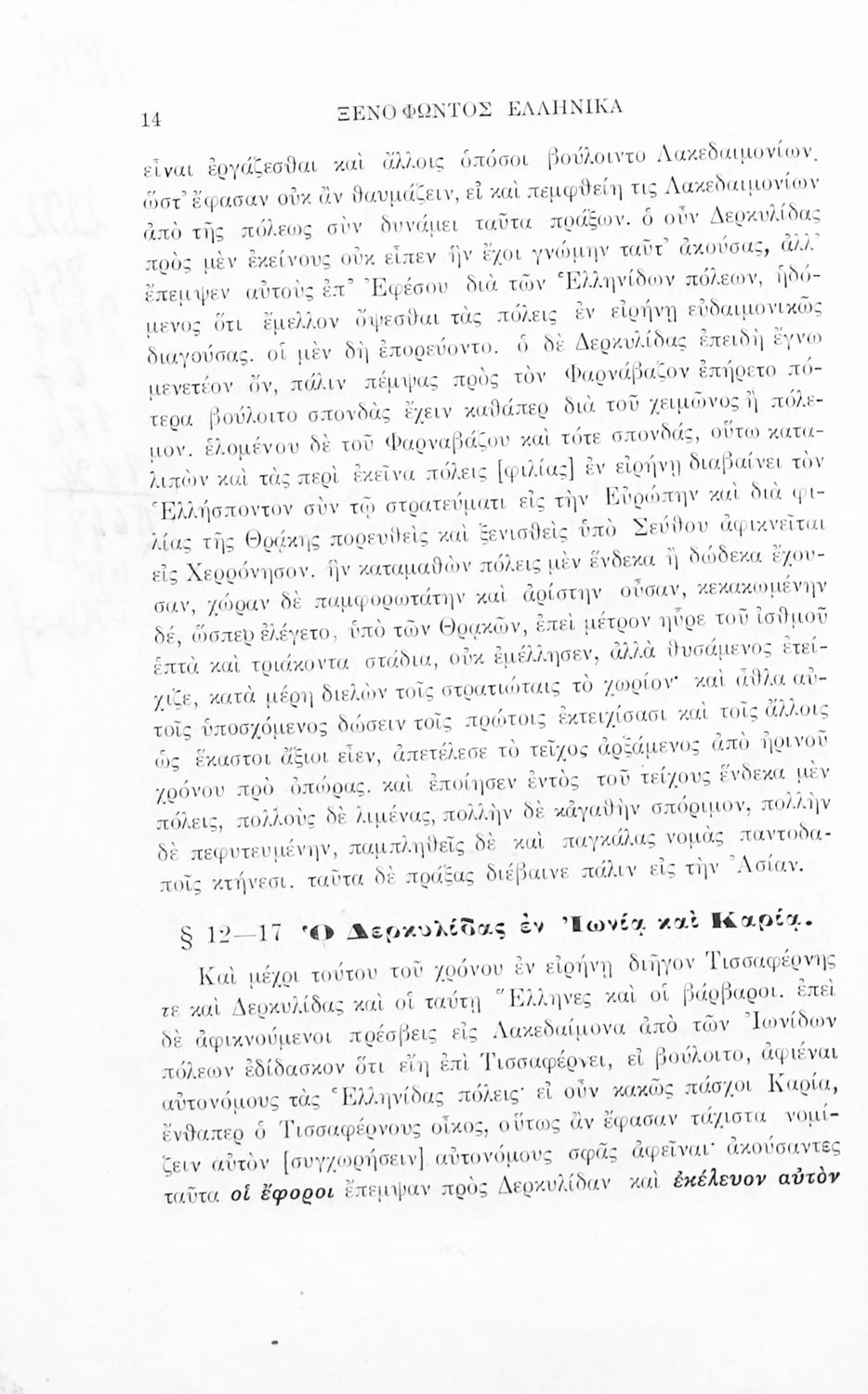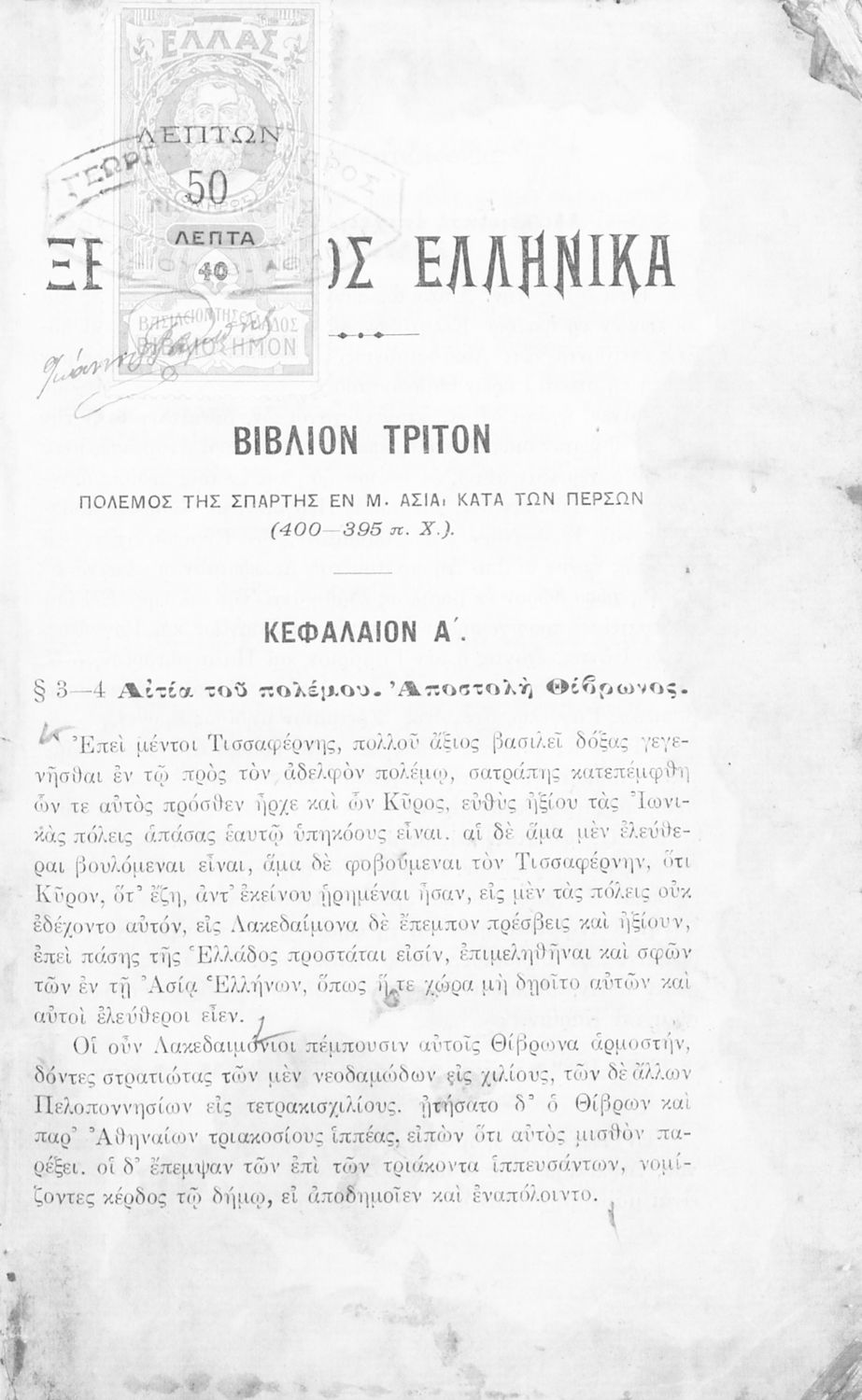 Σχολικό εγχειρίδιο Αρχαίων Ελληνικών Γ' Ελληνικού Σχολείου που περιλαμβάνει αποσπάσματα από το έργο του Ξενοφώντα Ελληνικά και τα έργα του Λουκιανού Ενύπνιον και Ανάχαρσις, βιογραφικά σημειώματα των συγγραφέων, ερμηνευτικές και πραγματολογικές σημειώσεις.