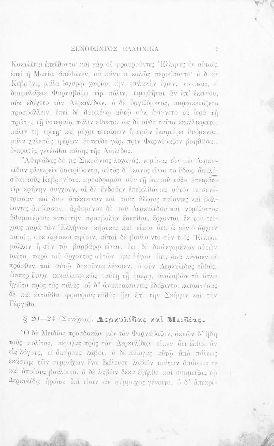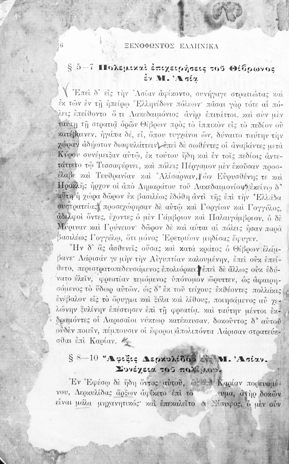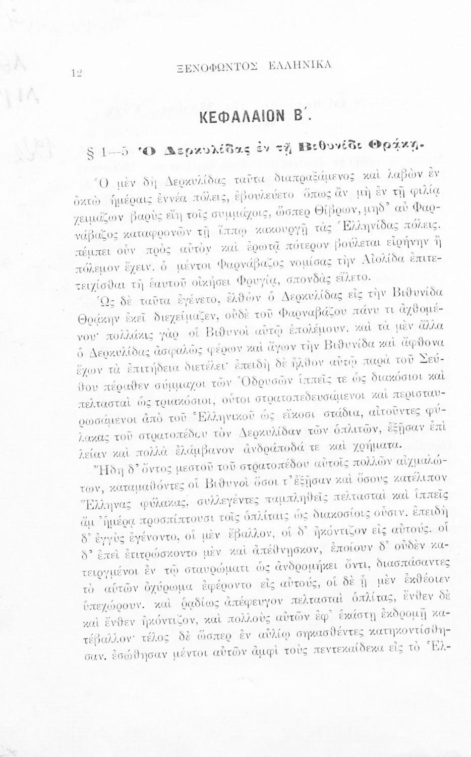 Σχολικό εγχειρίδιο Αρχαίων Ελληνικών Γ' Ελληνικού Σχολείου που περιλαμβάνει αποσπάσματα από το έργο του Ξενοφώντα Ελληνικά και τα έργα του Λουκιανού Ενύπνιον και Ανάχαρσις, βιογραφικά σημειώματα των συγγραφέων, ερμηνευτικές και πραγματολογικές σημειώσεις.