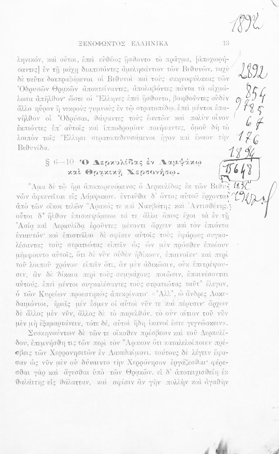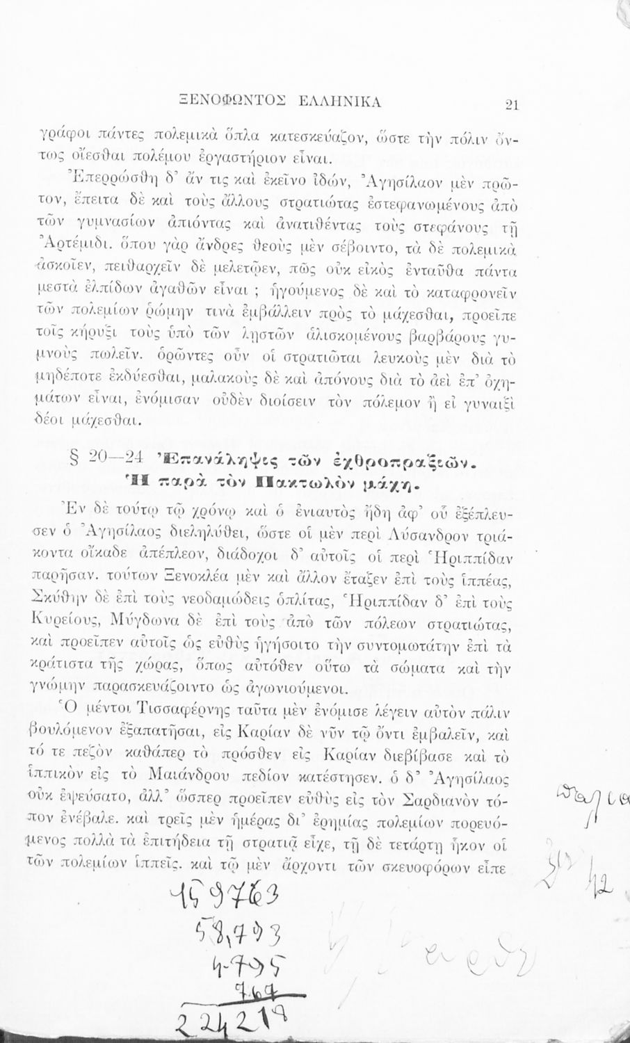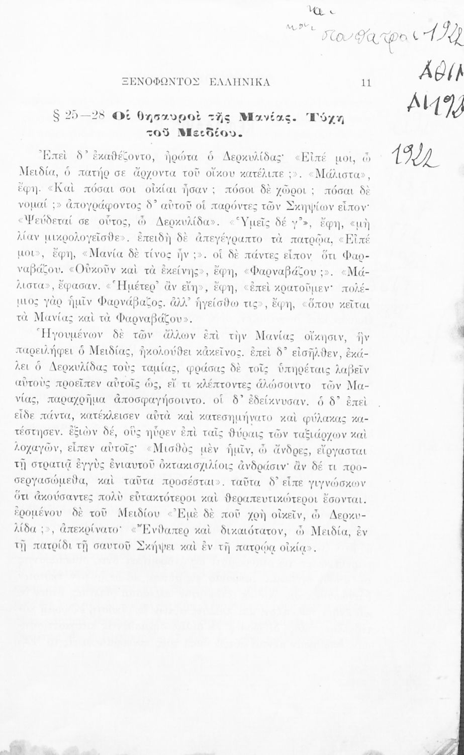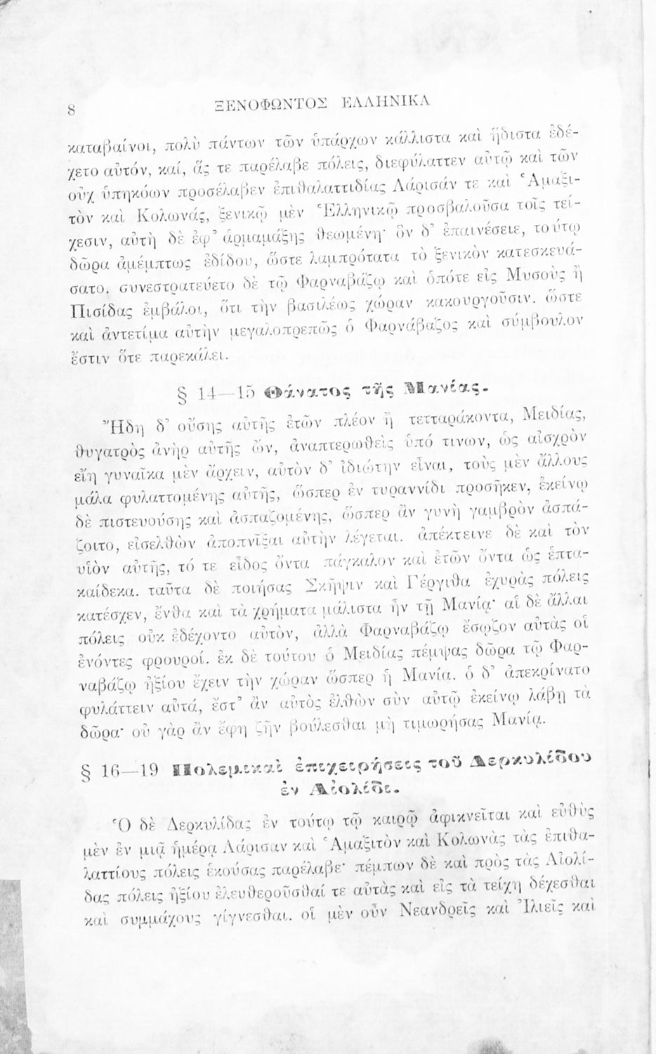 Σχολικό εγχειρίδιο Αρχαίων Ελληνικών Γ' Ελληνικού Σχολείου που περιλαμβάνει αποσπάσματα από το έργο του Ξενοφώντα Ελληνικά και τα έργα του Λουκιανού Ενύπνιον και Ανάχαρσις, βιογραφικά σημειώματα των συγγραφέων, ερμηνευτικές και πραγματολογικές σημειώσεις.