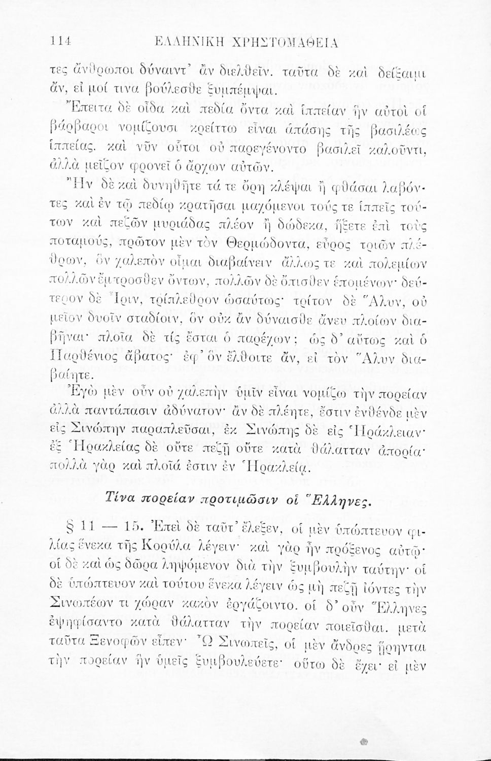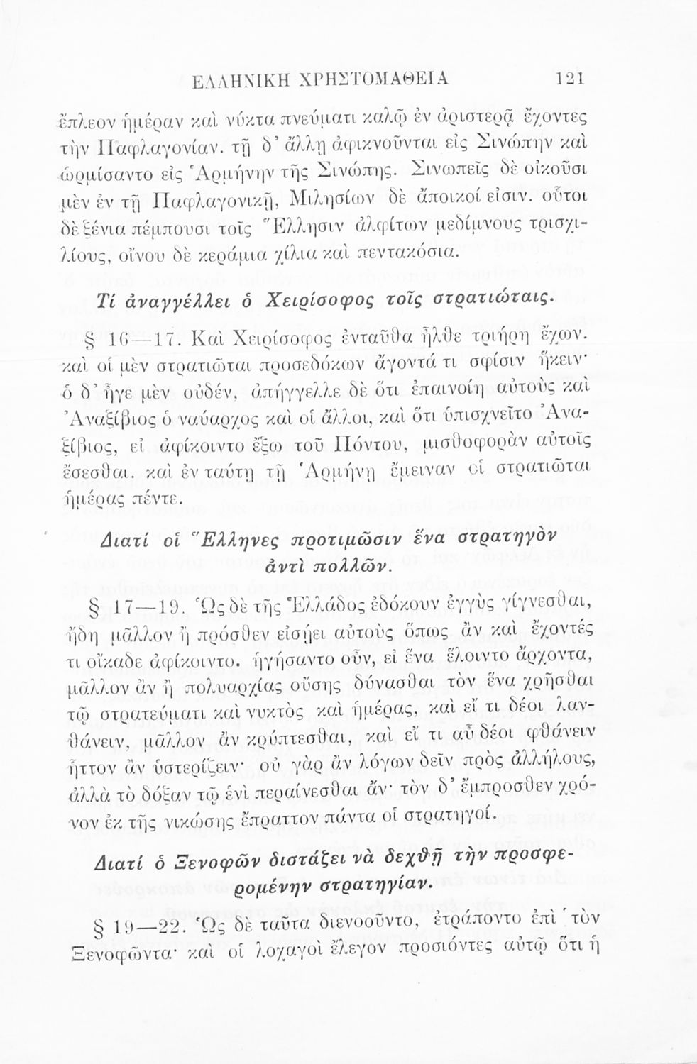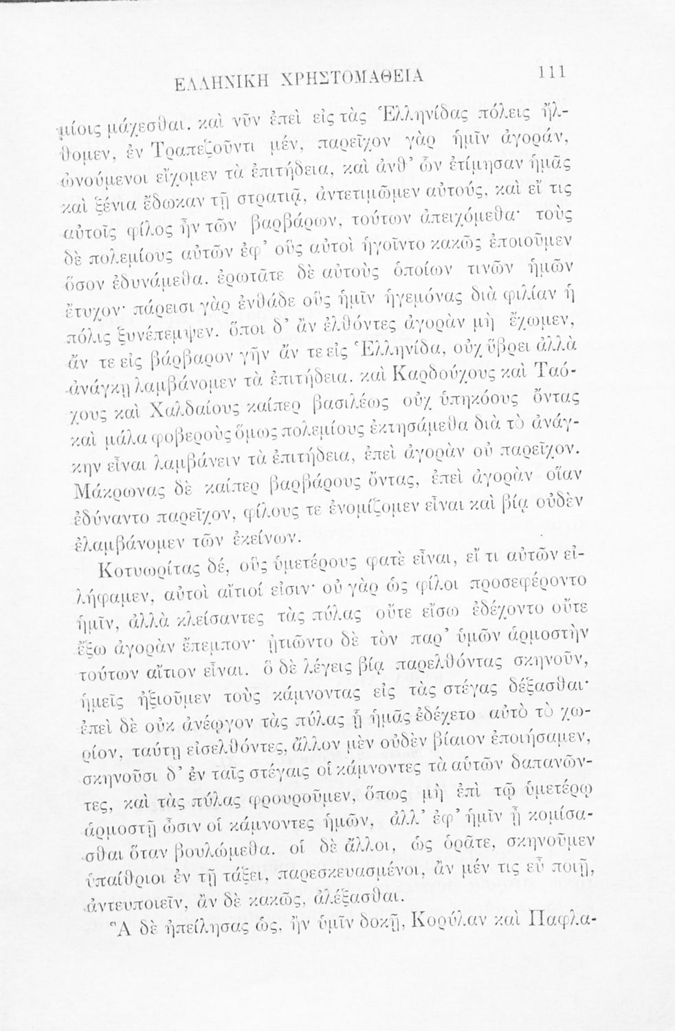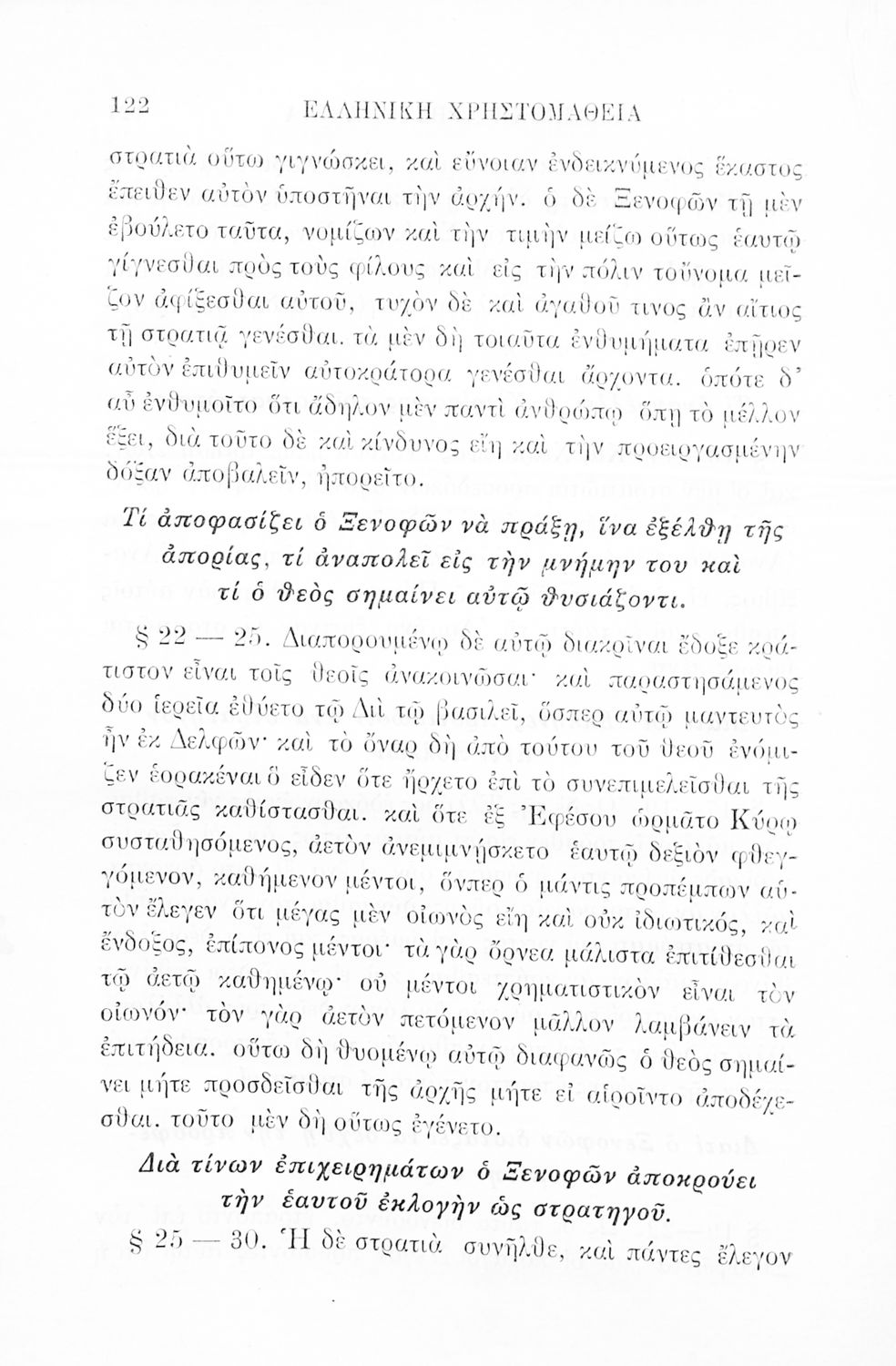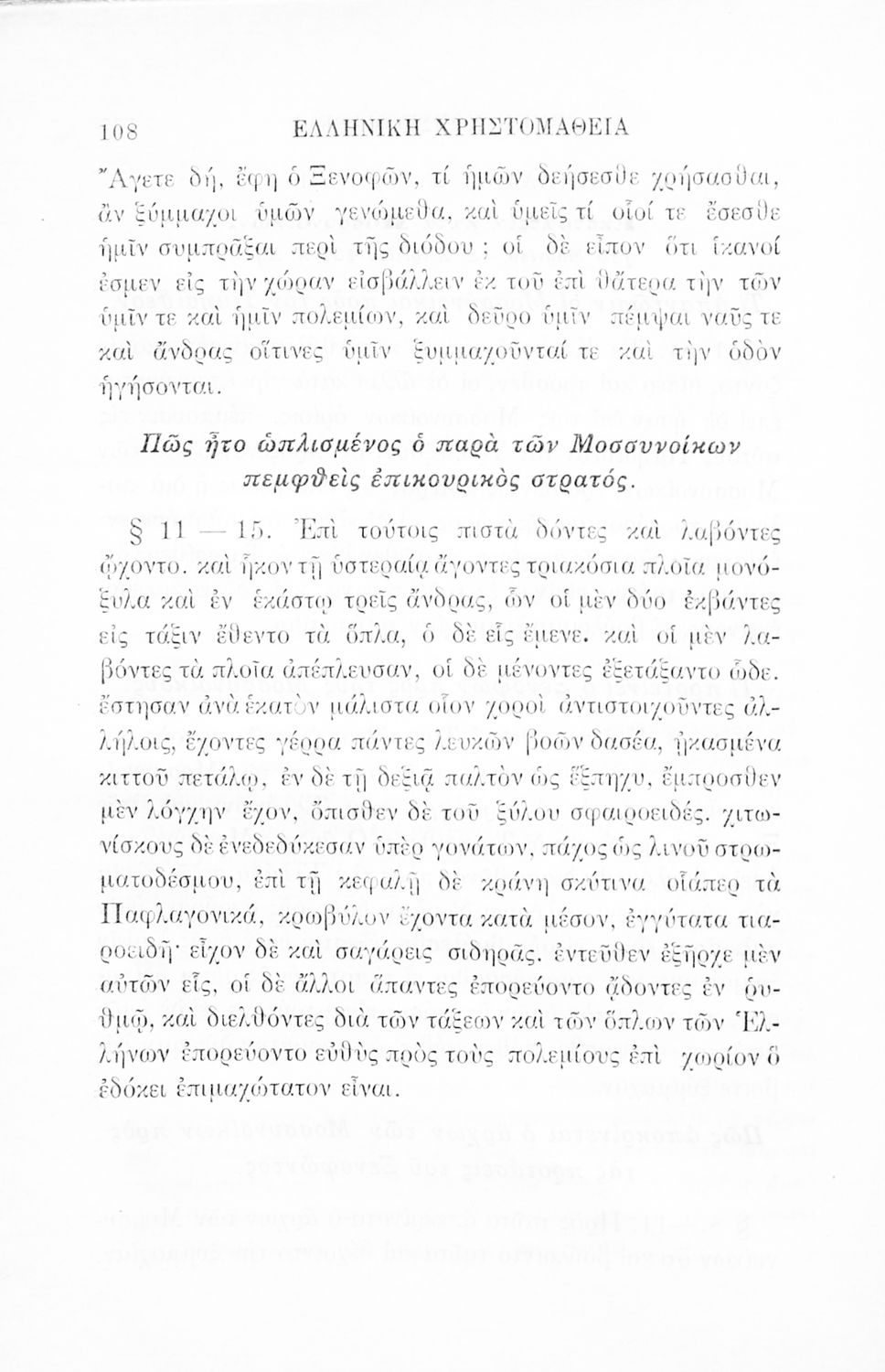 Ελληνική χρηστομάθεια τόμος Γ΄ εκλογαί εκ των τεσσάρων τελευταίων βιβλίων της Κύρου Αναβάσεως του Ξενοφώντος, εκ του Γ΄ και Δ΄ βιβλίου των Ελληνικών του αυτού και εκ του Λουκιανού το Ενύπνιον και Ανάχαρσιν προς χρήσιν των μαθητών της Γ΄ τάξεως του Ελληνικού Σχολείου
