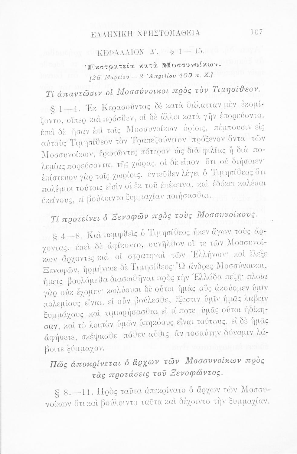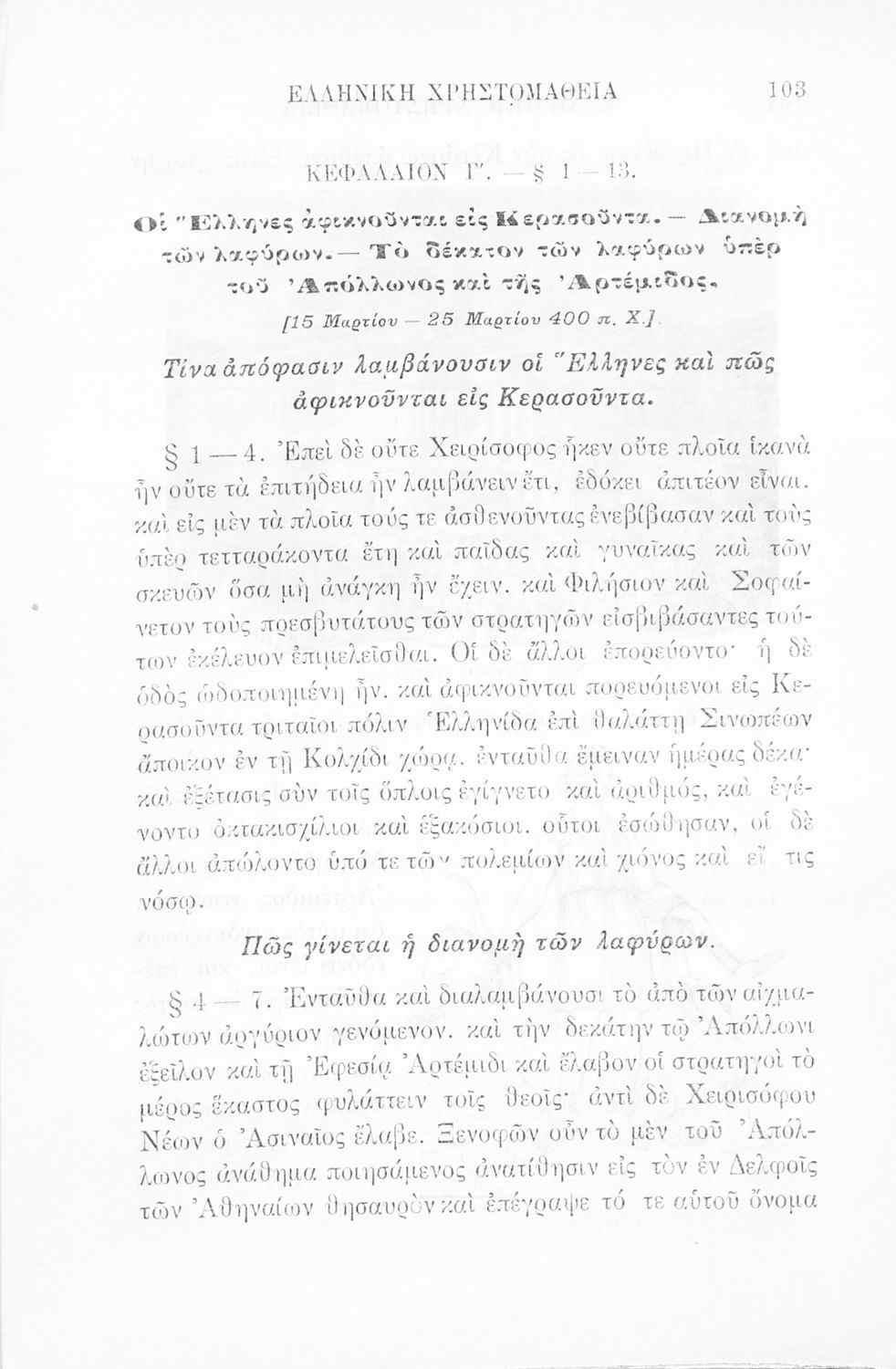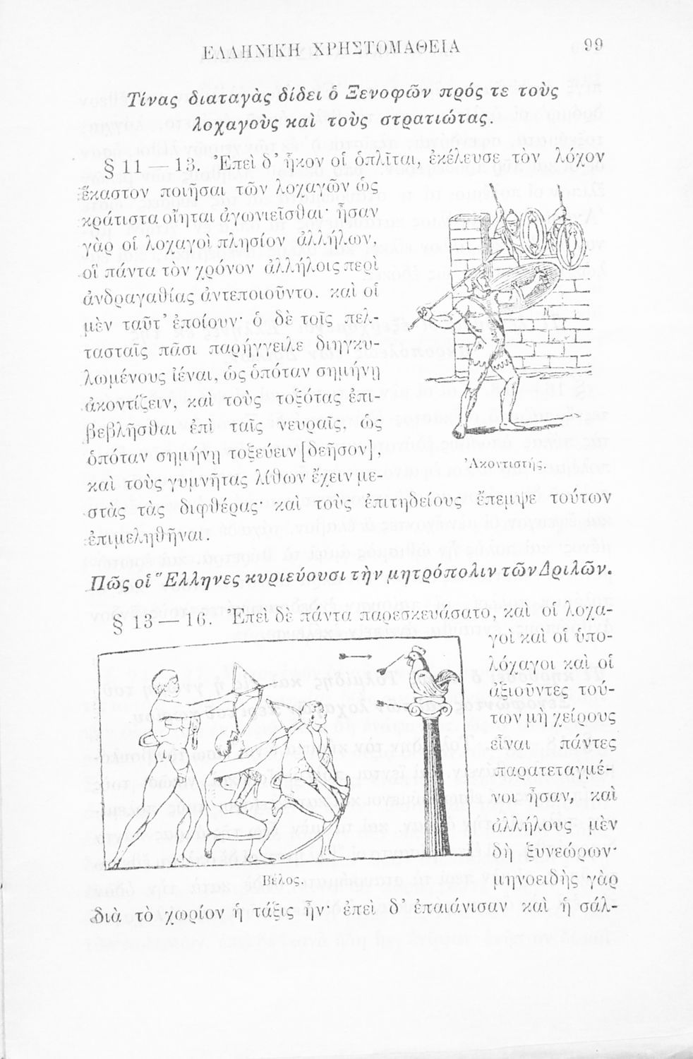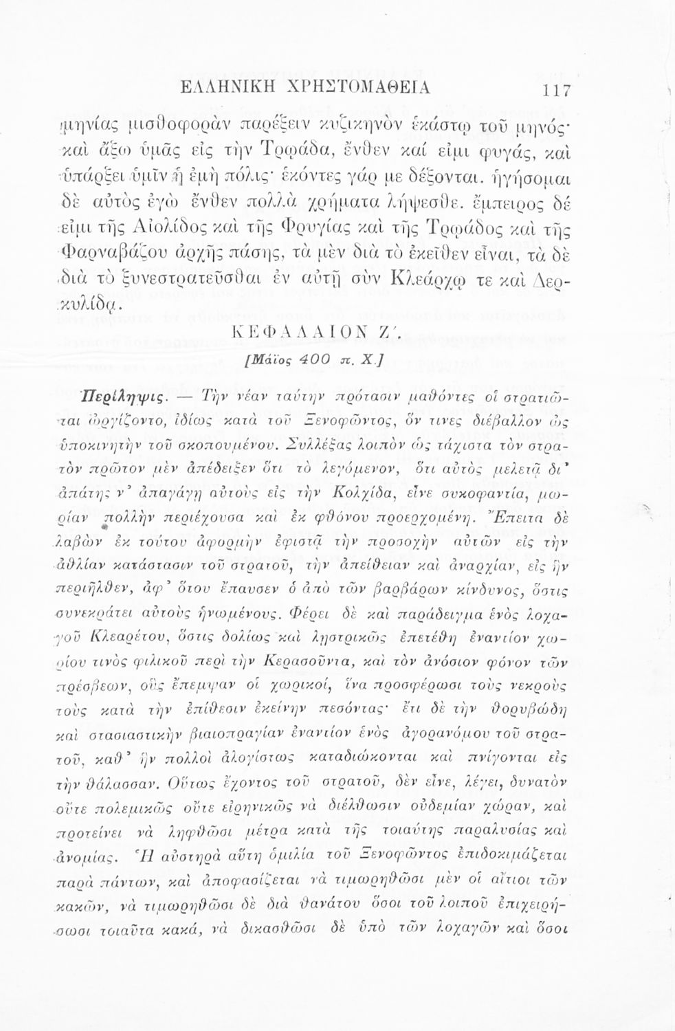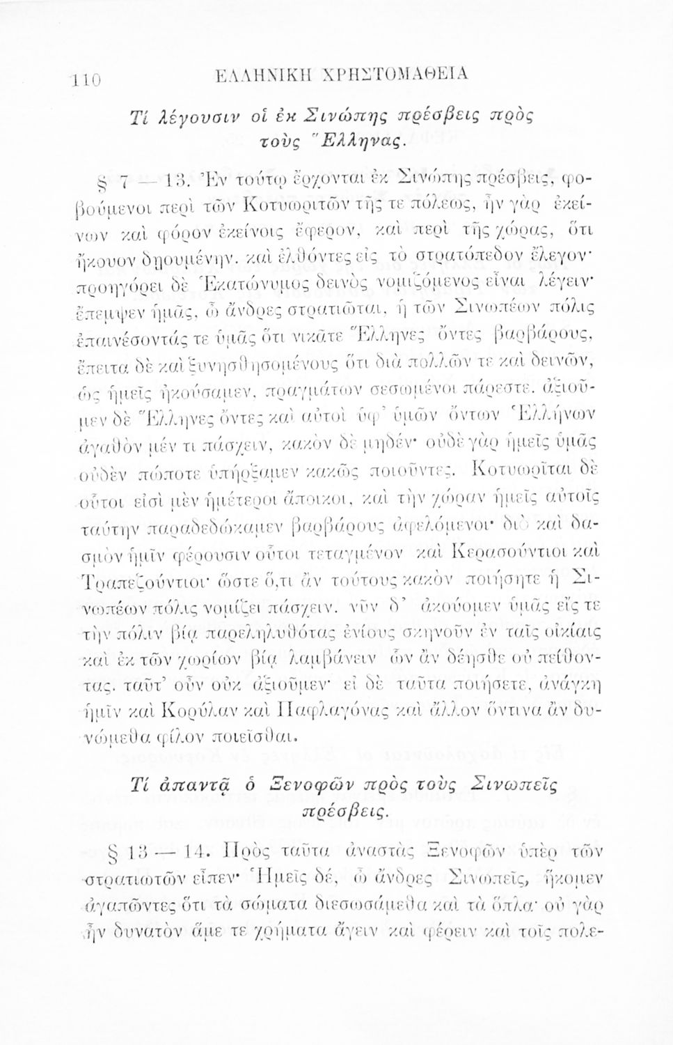 Ελληνική χρηστομάθεια τόμος Γ΄ εκλογαί εκ των τεσσάρων τελευταίων βιβλίων της Κύρου Αναβάσεως του Ξενοφώντος, εκ του Γ΄ και Δ΄ βιβλίου των Ελληνικών του αυτού και εκ του Λουκιανού το Ενύπνιον και Ανάχαρσιν προς χρήσιν των μαθητών της Γ΄ τάξεως του Ελληνικού Σχολείου