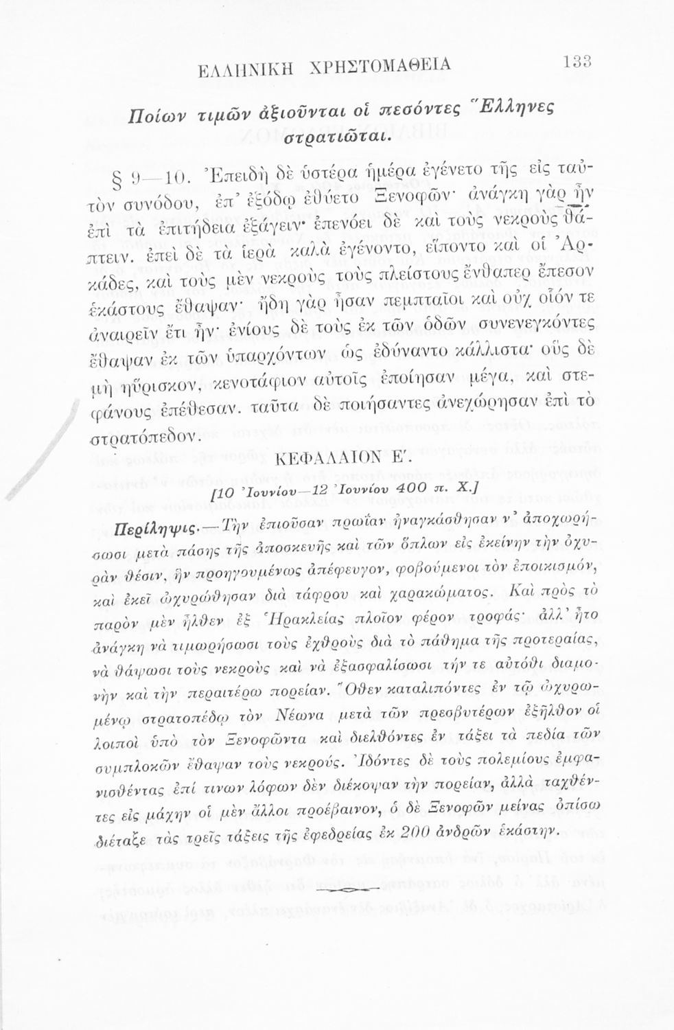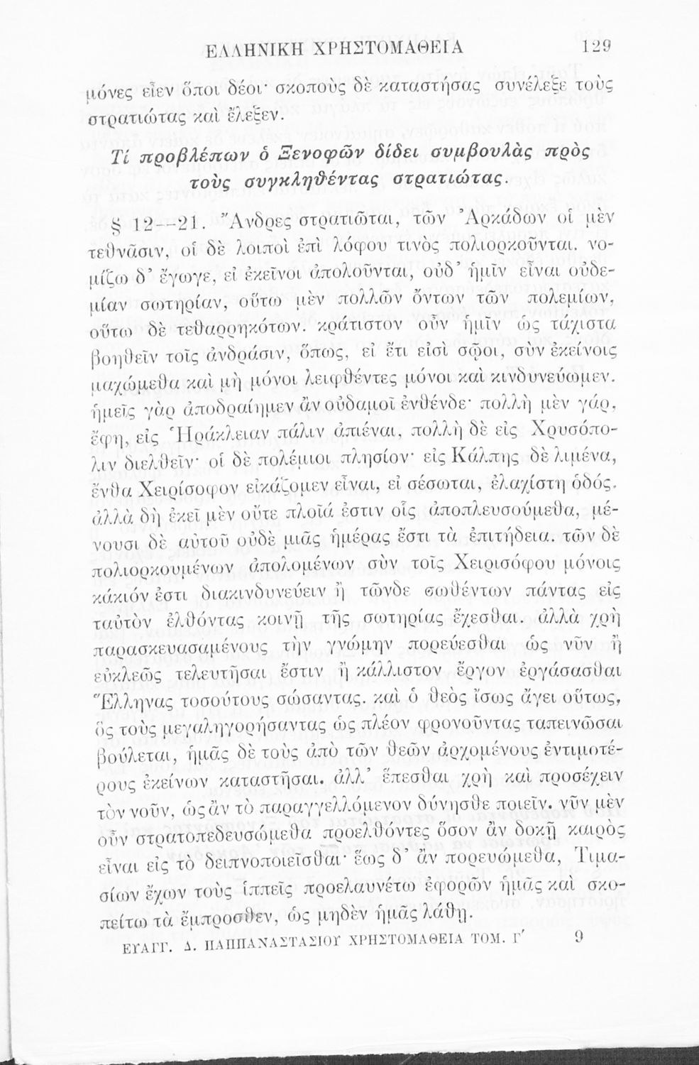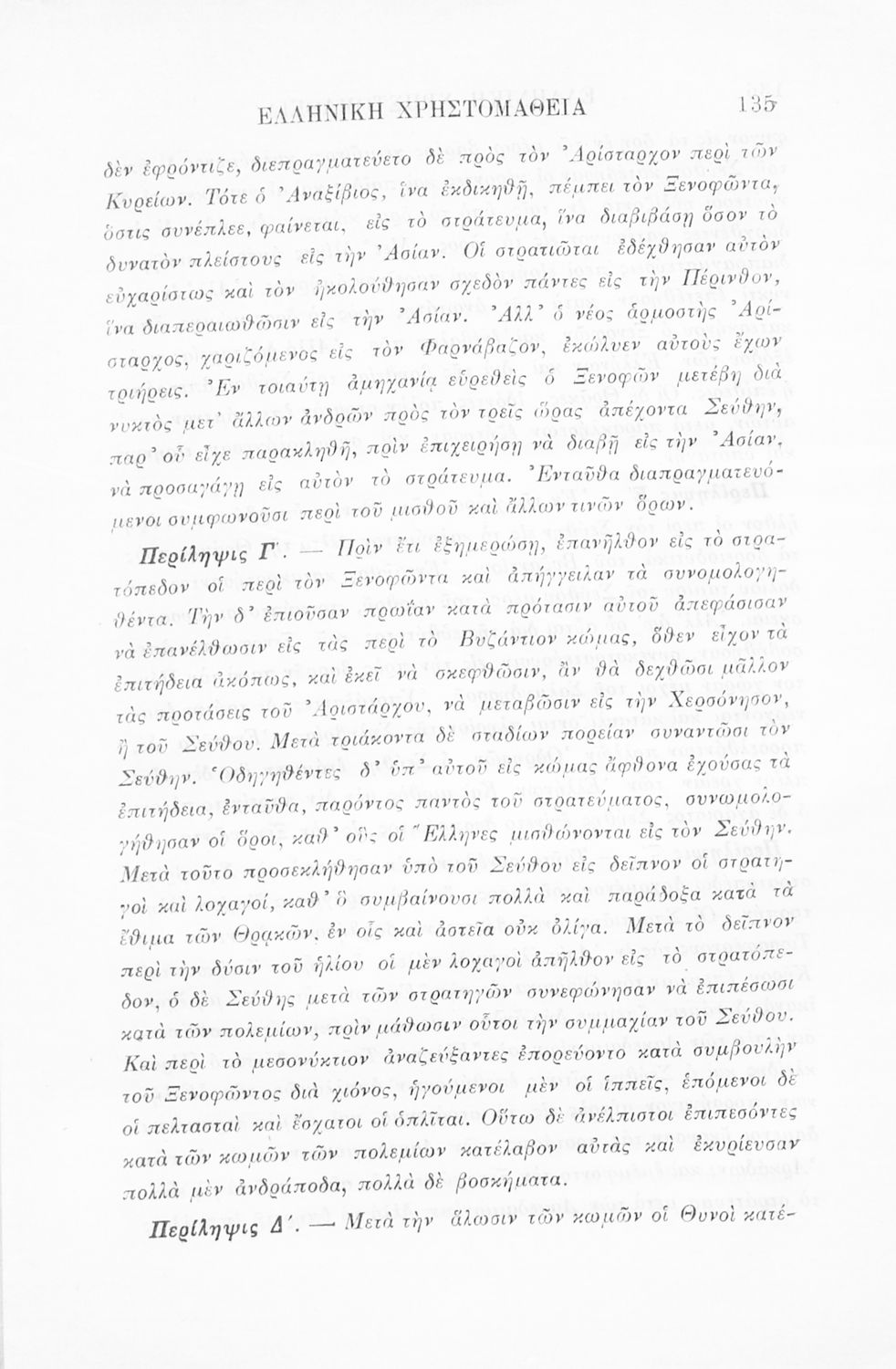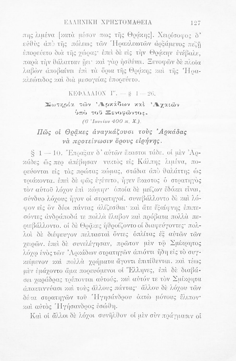 Σχολικό εγχειρίδιο Αρχαίων Ελληνικών Γ' Ελληνικού Σχολείου που περιλαμβάνει γραμματική της αρχαίας ελληνικής, αποσπάσματα από το έργο του Ξενοφώντα Ελληνικά και τα έργα του Λουκιανού Ενύπνιον και Ανάχαρσις, βιογραφικά σημειώματα των συγγραφέων, ερμηνευτικές και πραγματολογικές σημειώσεις.