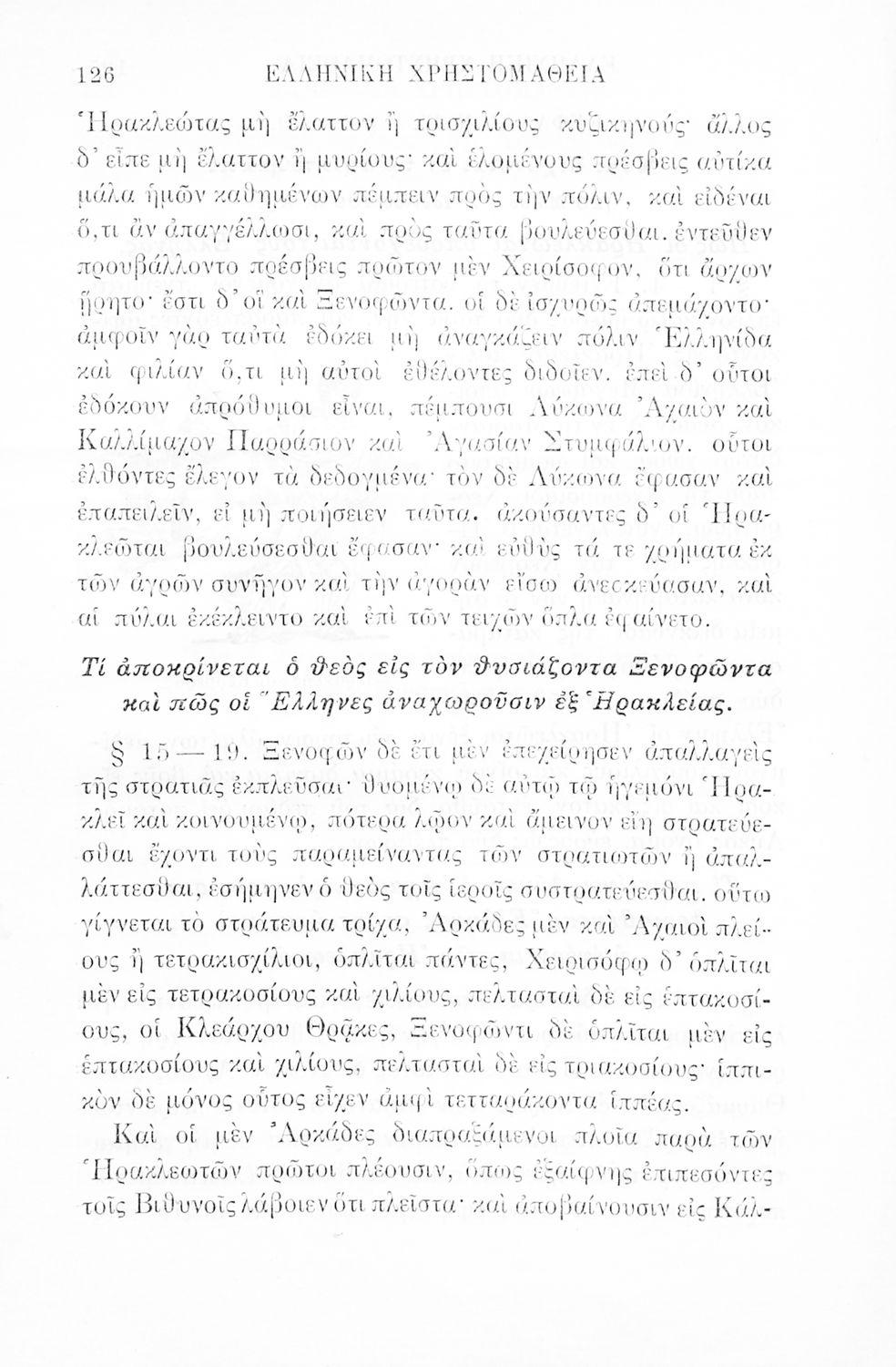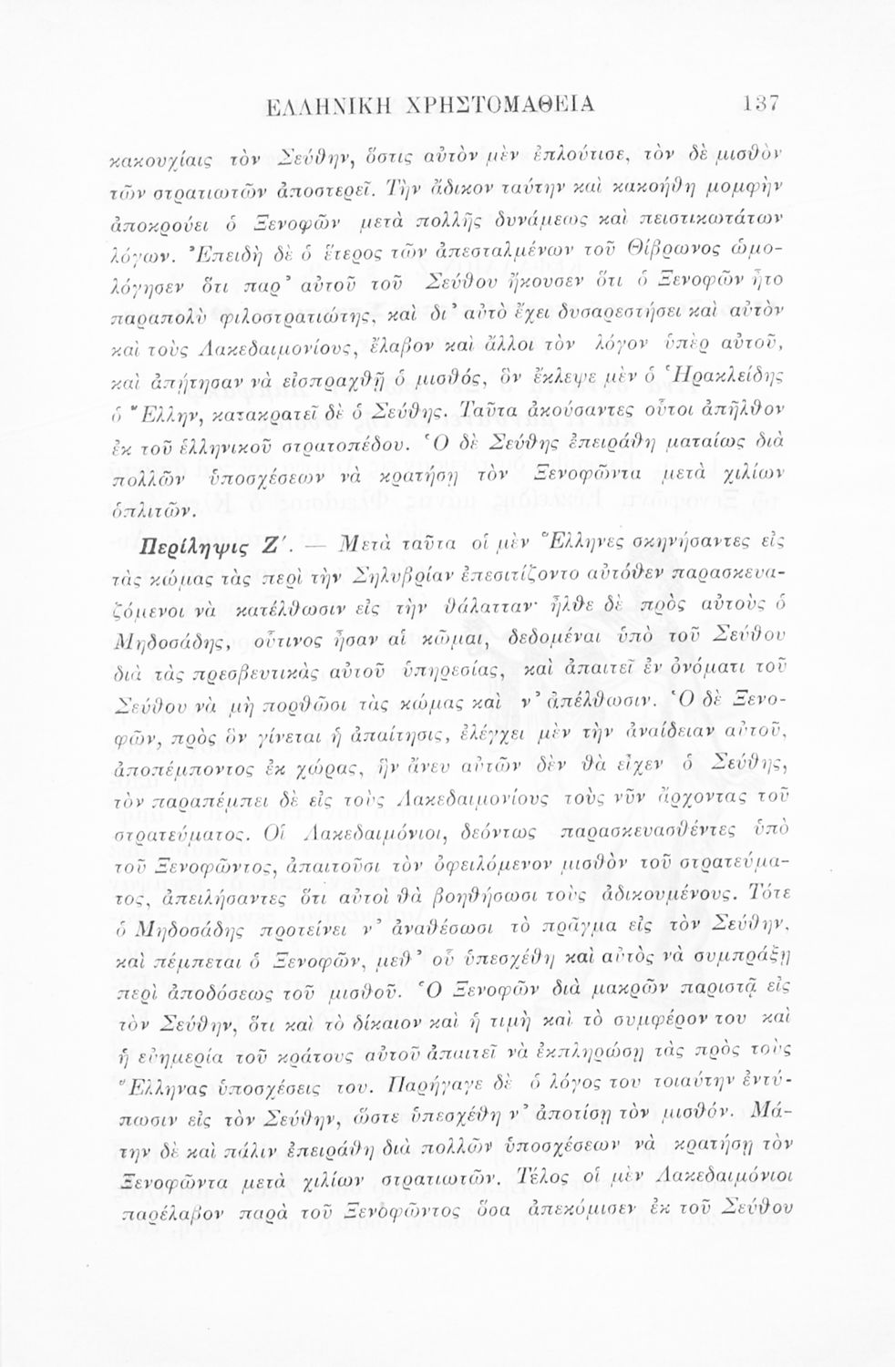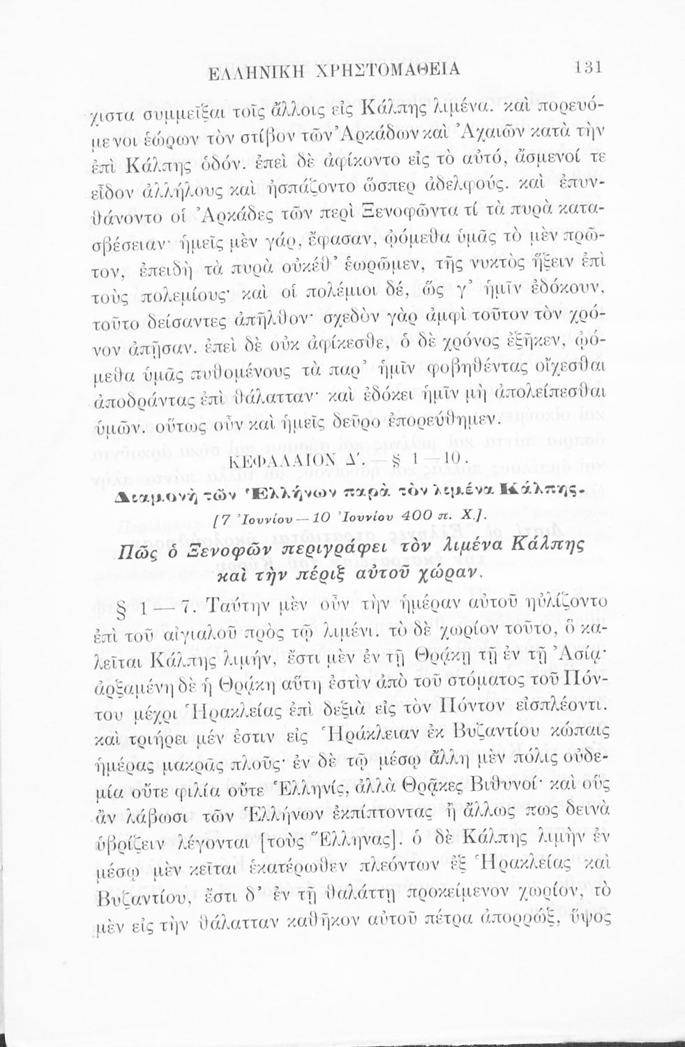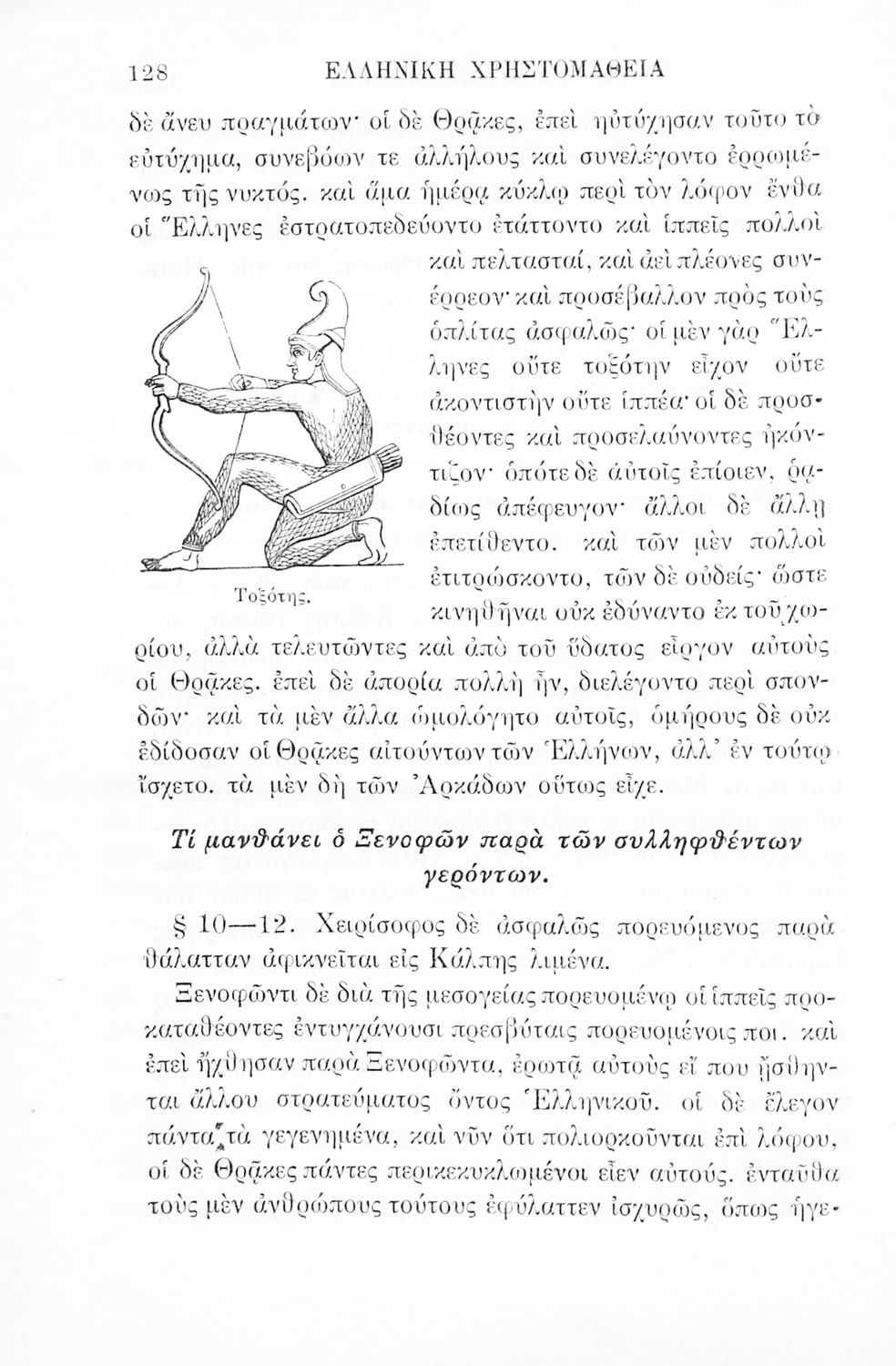Σχολικό εγχειρίδιο Αρχαίων Ελληνικών Γ' Ελληνικού Σχολείου που περιλαμβάνει γραμματική της αρχαίας ελληνικής, αποσπάσματα από το έργο του Ξενοφώντα Ελληνικά και τα έργα του Λουκιανού Ενύπνιον και Ανάχαρσις, βιογραφικά σημειώματα των συγγραφέων, ερμηνευτικές και πραγματολογικές σημειώσεις.