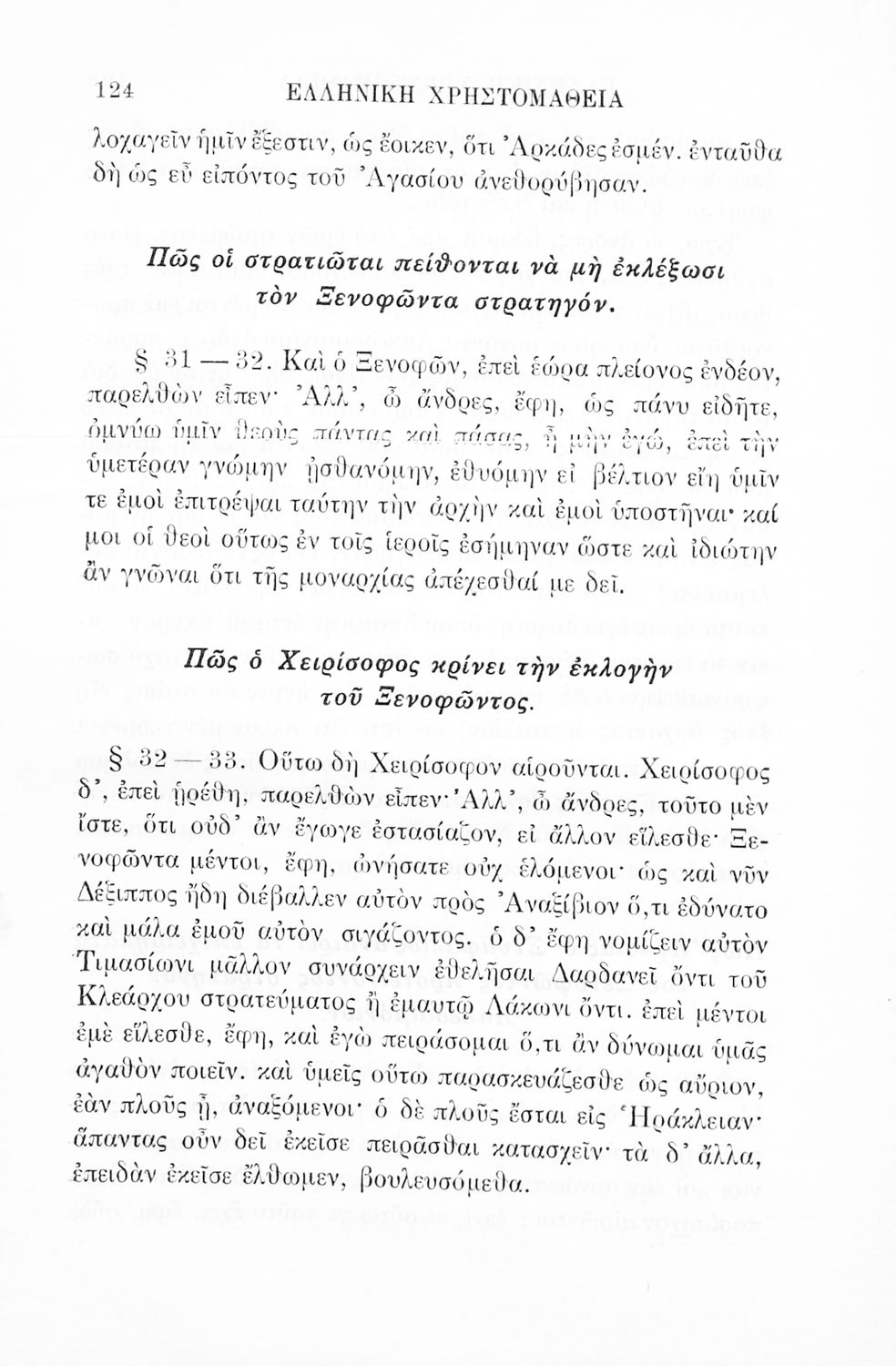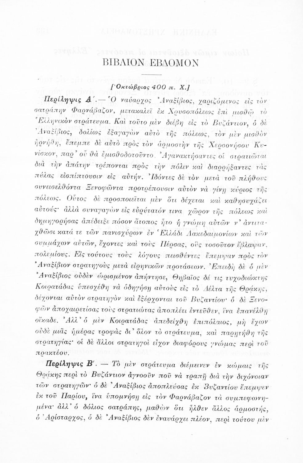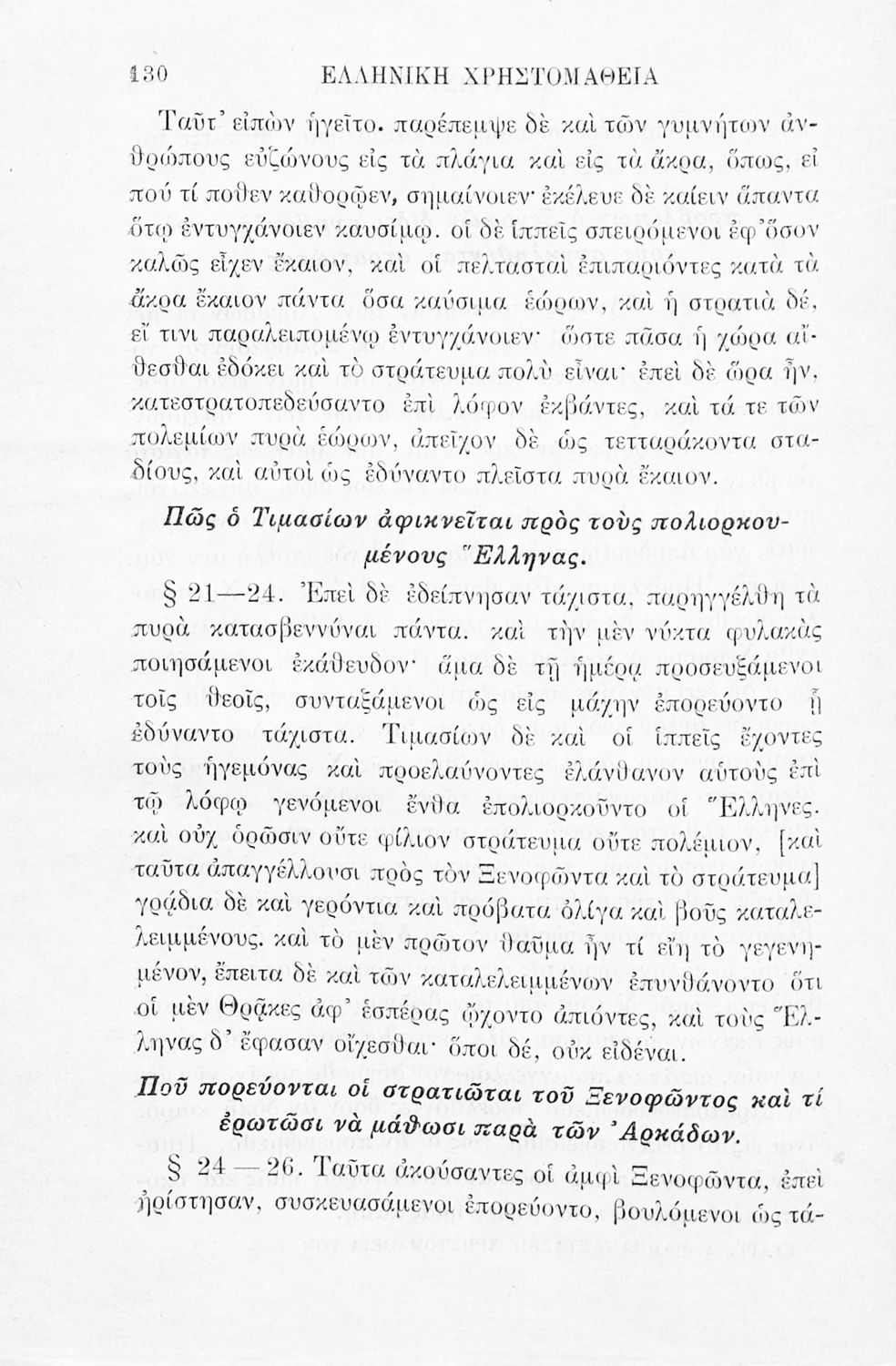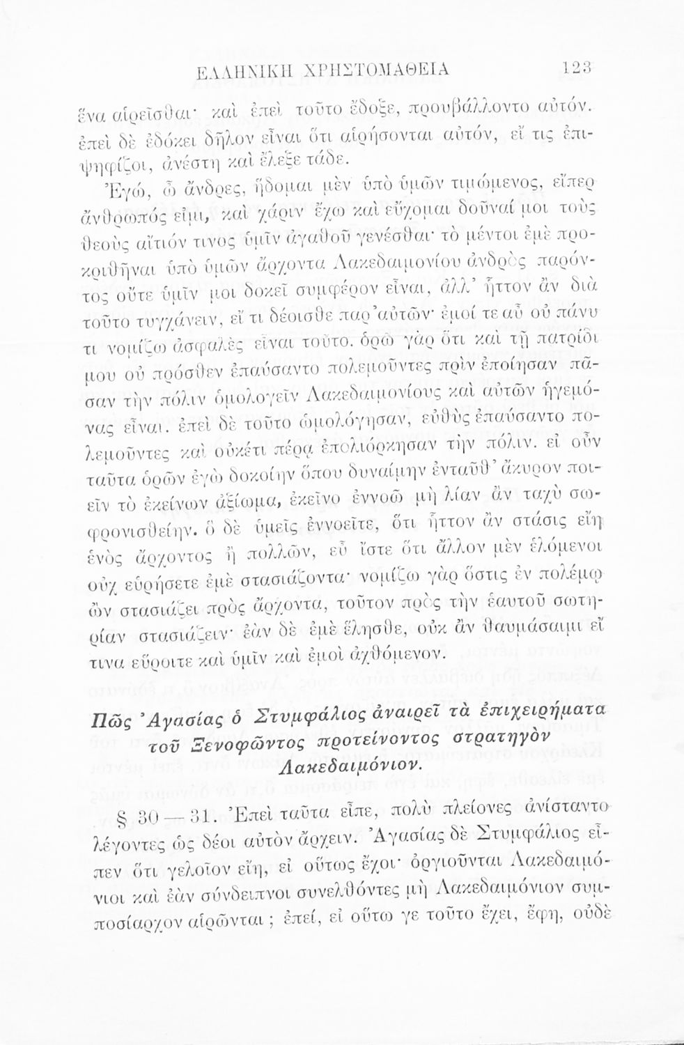 Σχολικό εγχειρίδιο Αρχαίων Ελληνικών Γ' Ελληνικού Σχολείου που περιλαμβάνει γραμματική της αρχαίας ελληνικής, αποσπάσματα από το έργο του Ξενοφώντα Ελληνικά και τα έργα του Λουκιανού Ενύπνιον και Ανάχαρσις, βιογραφικά σημειώματα των συγγραφέων, ερμηνευτικές και πραγματολογικές σημειώσεις.
