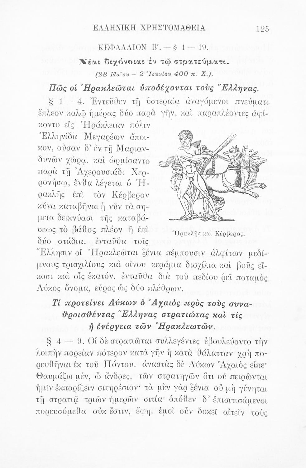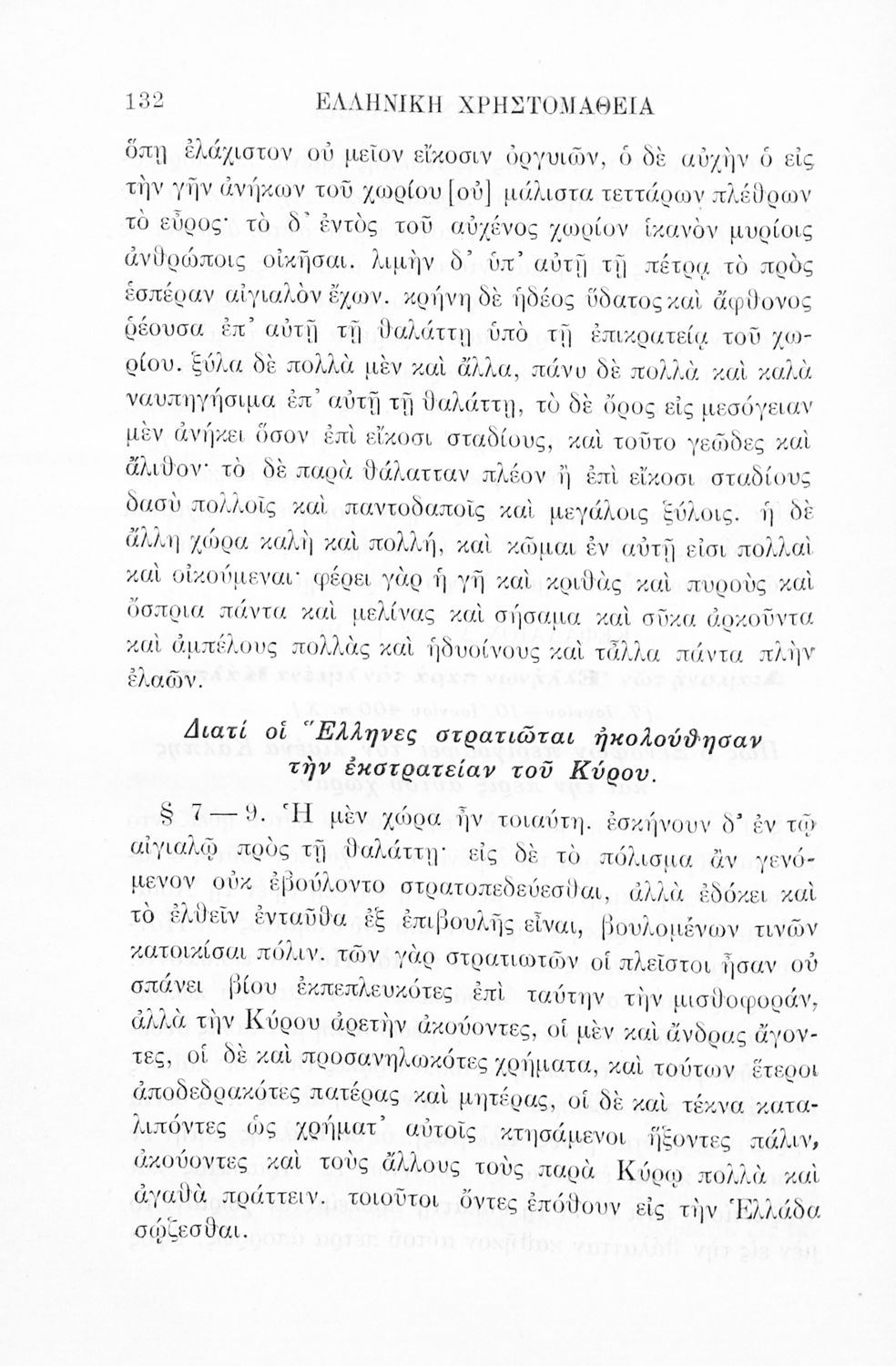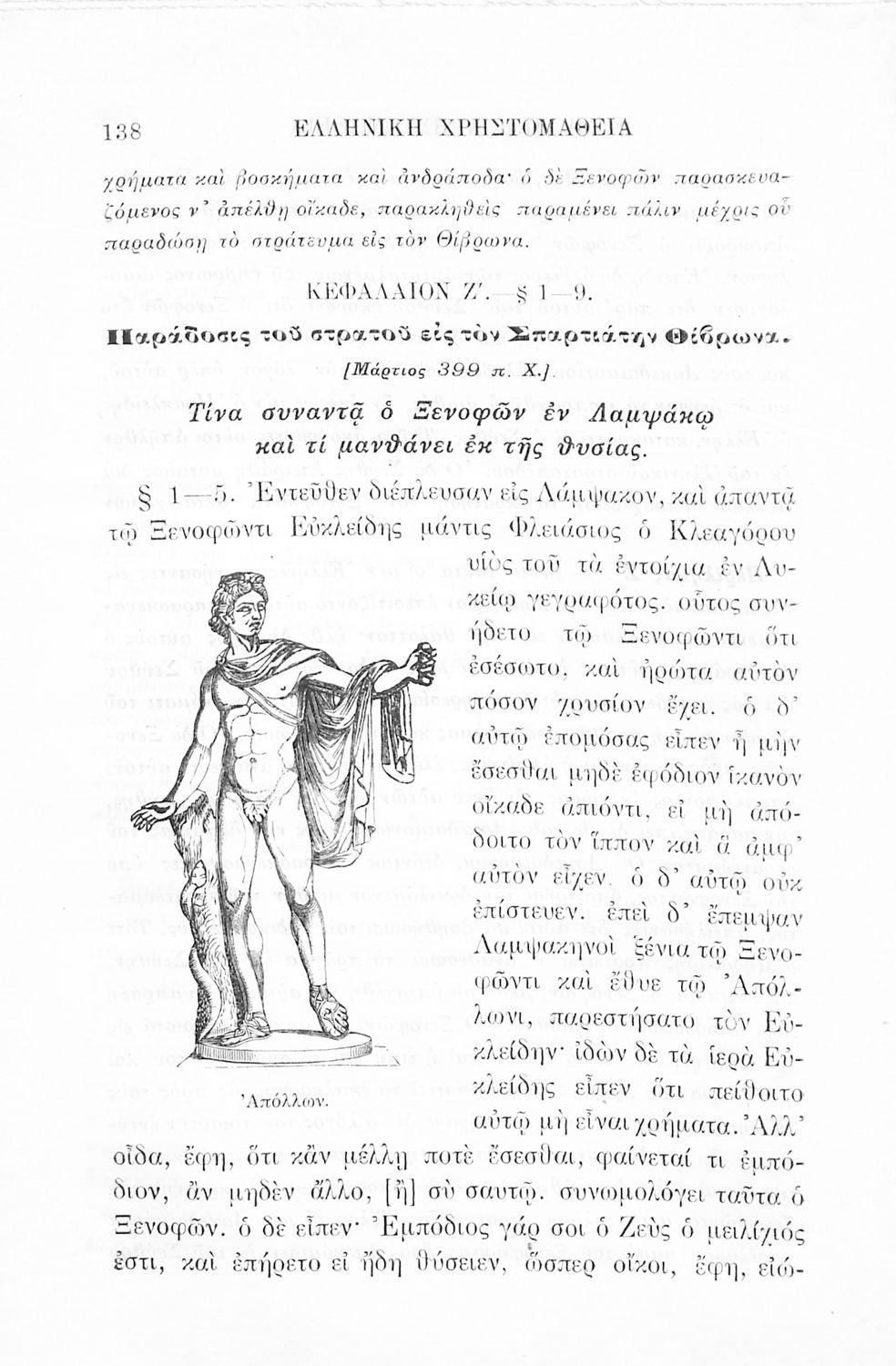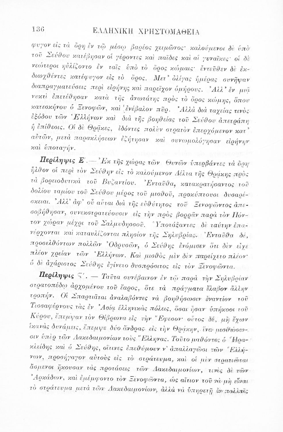 Σχολικό εγχειρίδιο Αρχαίων Ελληνικών Γ' Ελληνικού Σχολείου που περιλαμβάνει γραμματική της αρχαίας ελληνικής, αποσπάσματα από το έργο του Ξενοφώντα Ελληνικά και τα έργα του Λουκιανού Ενύπνιον και Ανάχαρσις, βιογραφικά σημειώματα των συγγραφέων, ερμηνευτικές και πραγματολογικές σημειώσεις.