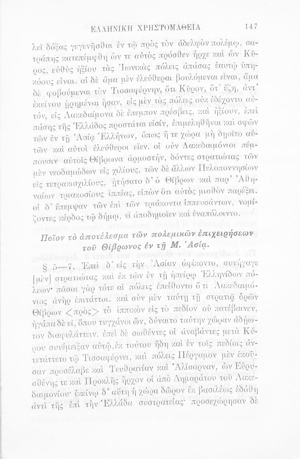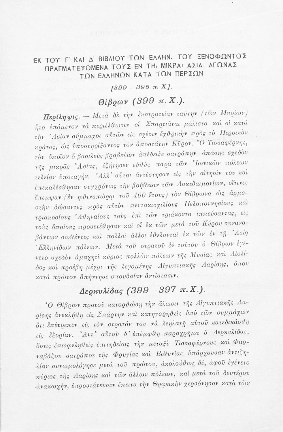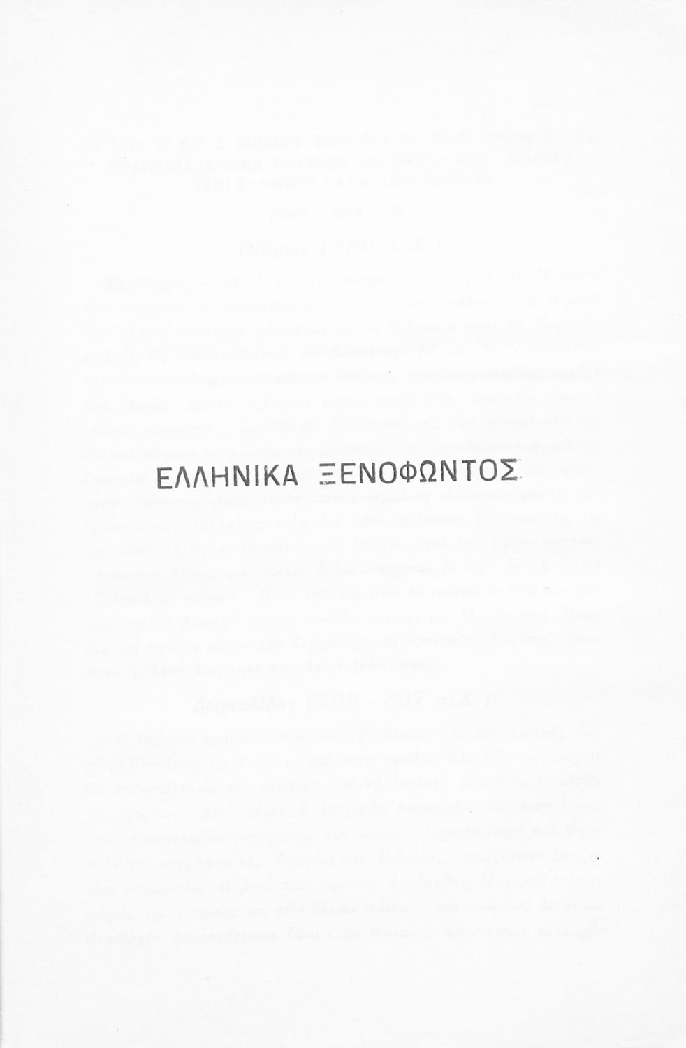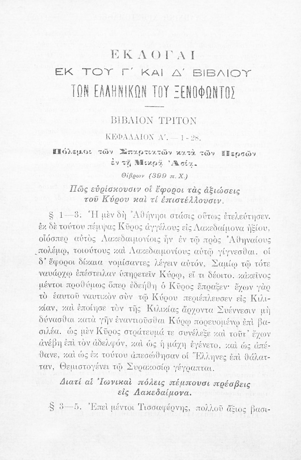 Σχολικό εγχειρίδιο Αρχαίων Ελληνικών Γ' Ελληνικού Σχολείου που περιλαμβάνει γραμματική της αρχαίας ελληνικής, αποσπάσματα από το έργο του Ξενοφώντα Ελληνικά και τα έργα του Λουκιανού Ενύπνιον και Ανάχαρσις, βιογραφικά σημειώματα των συγγραφέων, ερμηνευτικές και πραγματολογικές σημειώσεις.