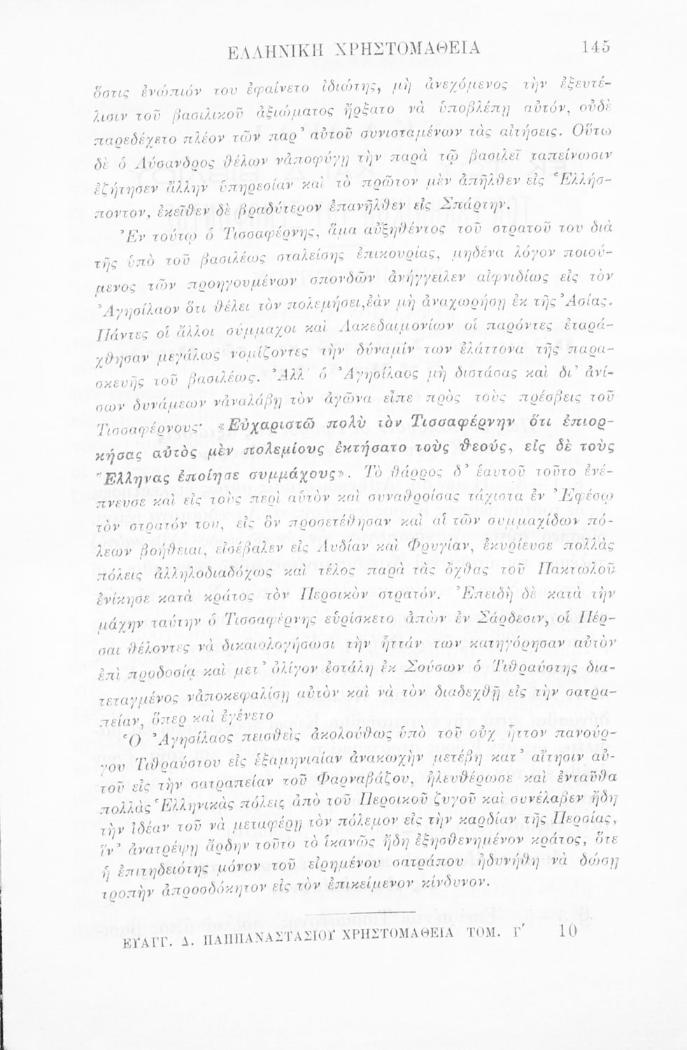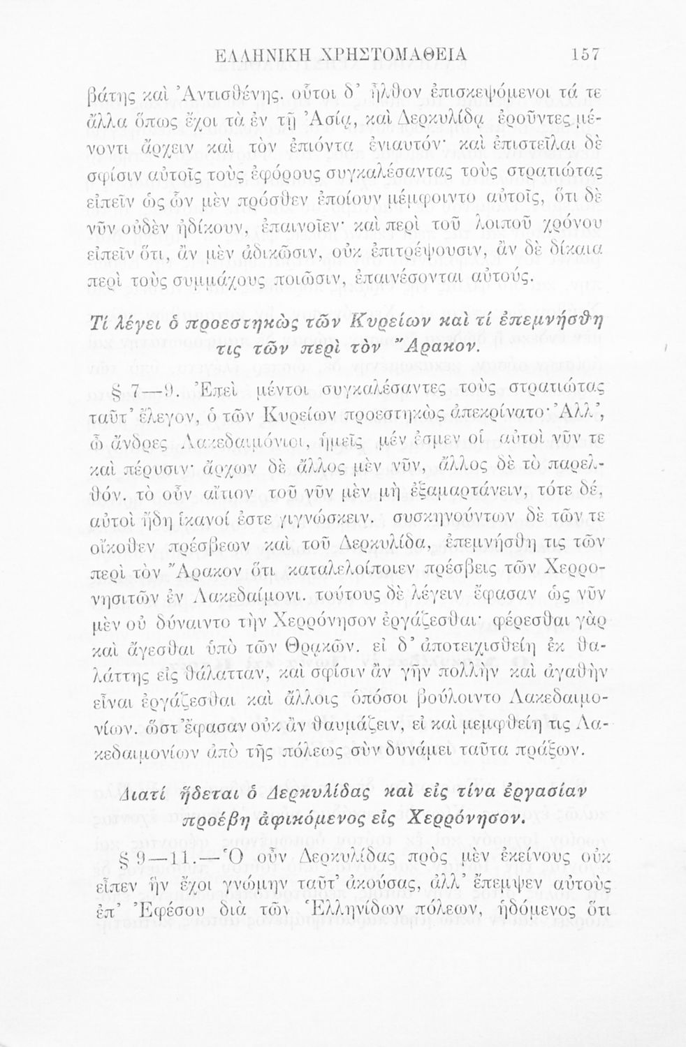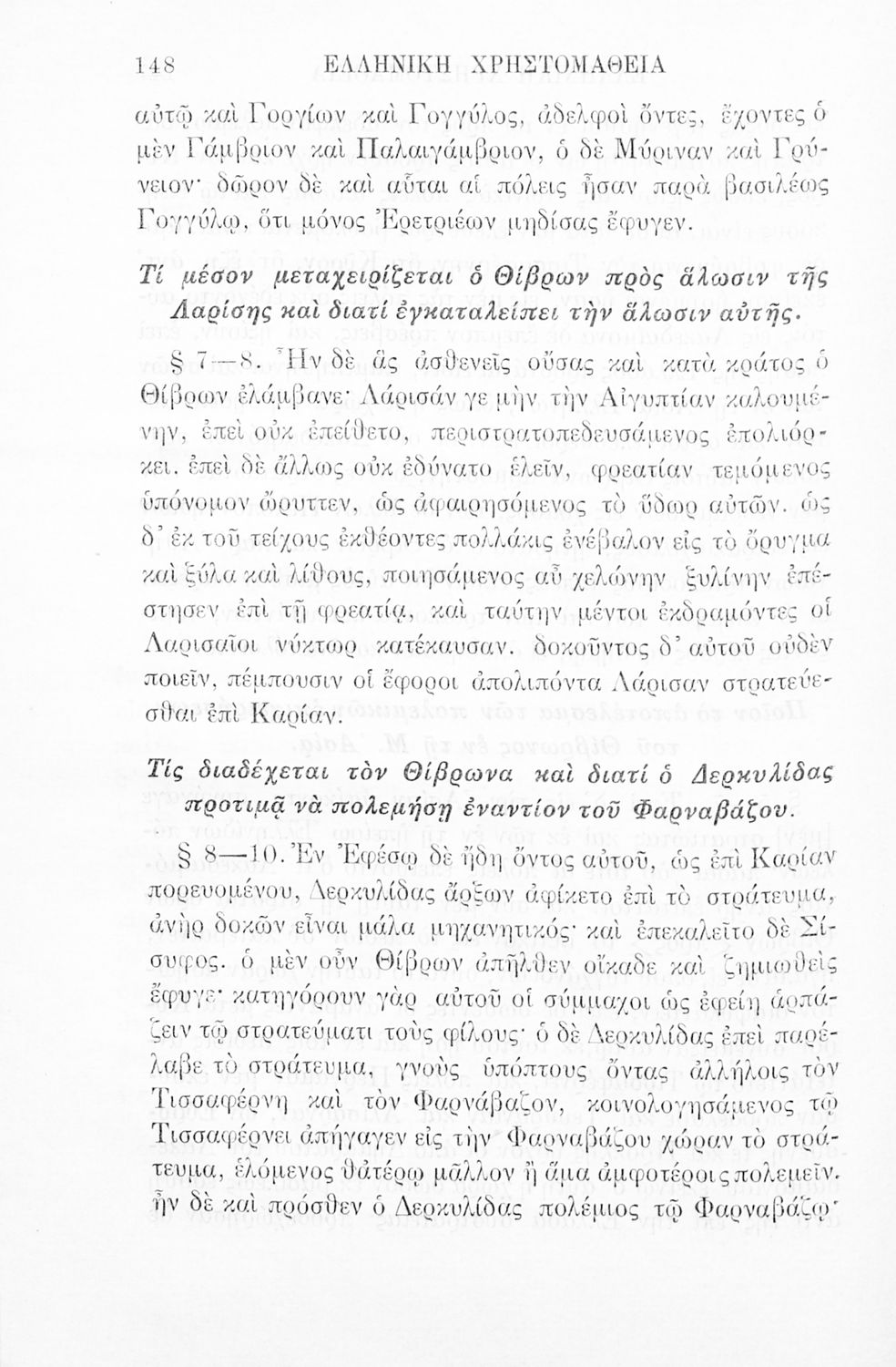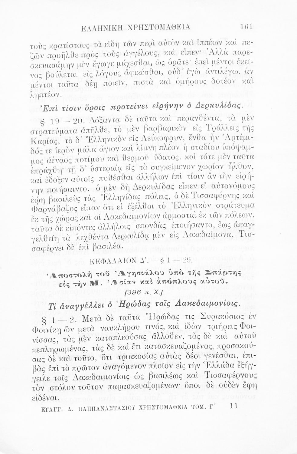 Σχολικό εγχειρίδιο Αρχαίων Ελληνικών Γ' Ελληνικού Σχολείου που περιλαμβάνει γραμματική της αρχαίας ελληνικής, αποσπάσματα από το έργο του Ξενοφώντα Ελληνικά και τα έργα του Λουκιανού Ενύπνιον και Ανάχαρσις, βιογραφικά σημειώματα των συγγραφέων, ερμηνευτικές και πραγματολογικές σημειώσεις.