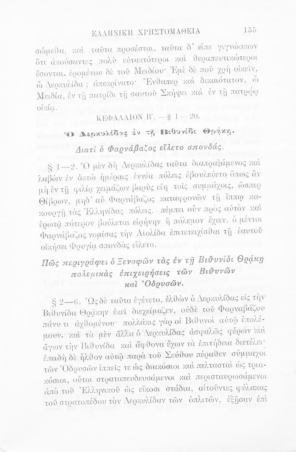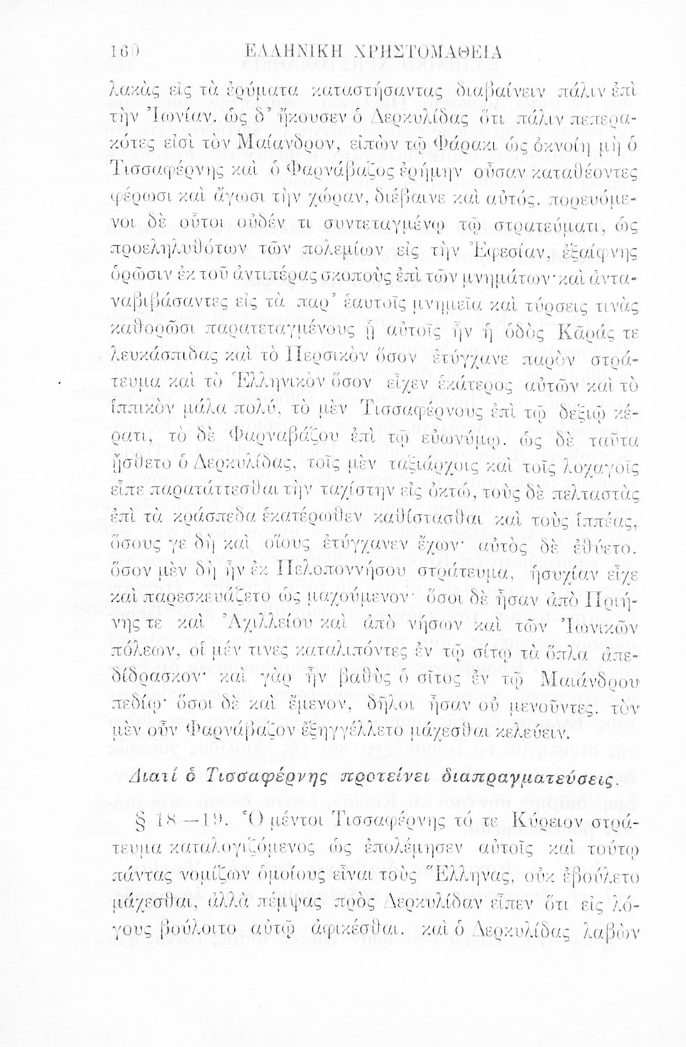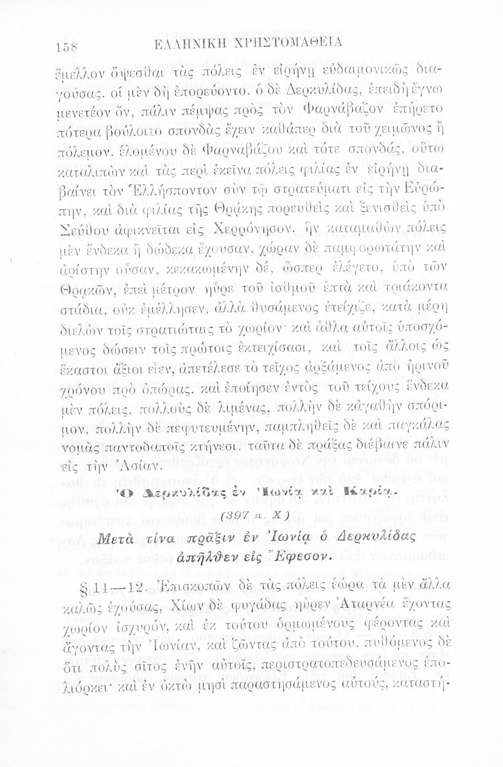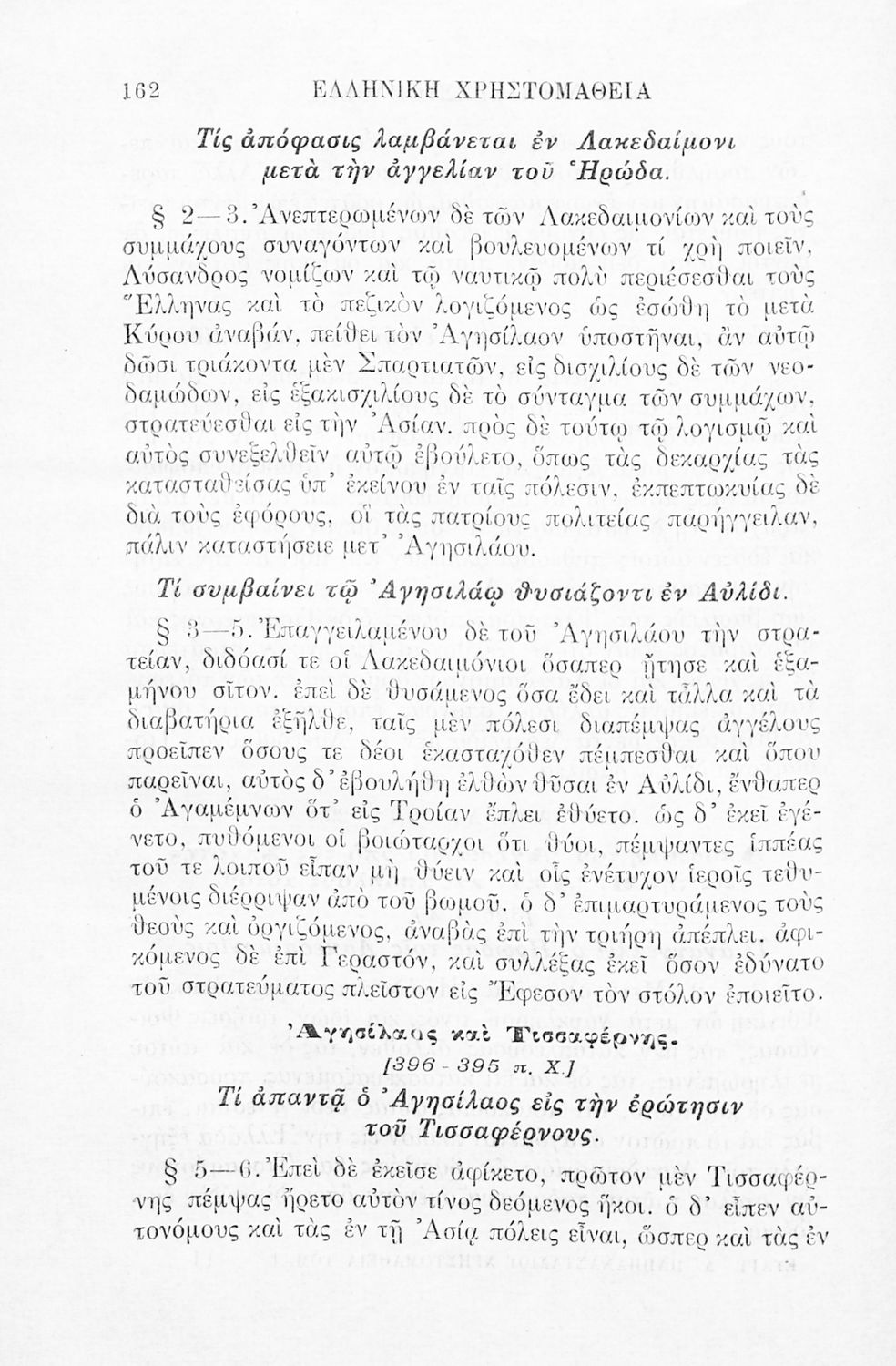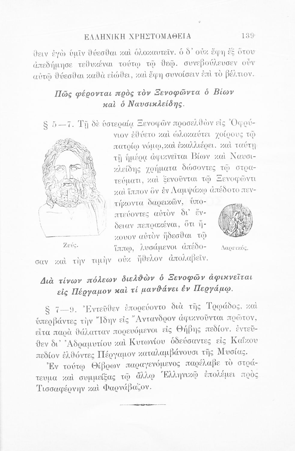 Σχολικό εγχειρίδιο Αρχαίων Ελληνικών Γ' Ελληνικού Σχολείου που περιλαμβάνει γραμματική της αρχαίας ελληνικής, αποσπάσματα από το έργο του Ξενοφώντα Ελληνικά και τα έργα του Λουκιανού Ενύπνιον και Ανάχαρσις, βιογραφικά σημειώματα των συγγραφέων, ερμηνευτικές και πραγματολογικές σημειώσεις.