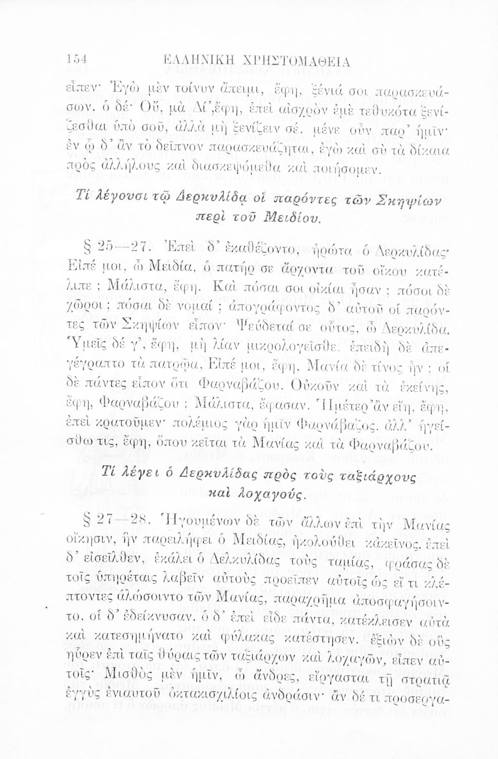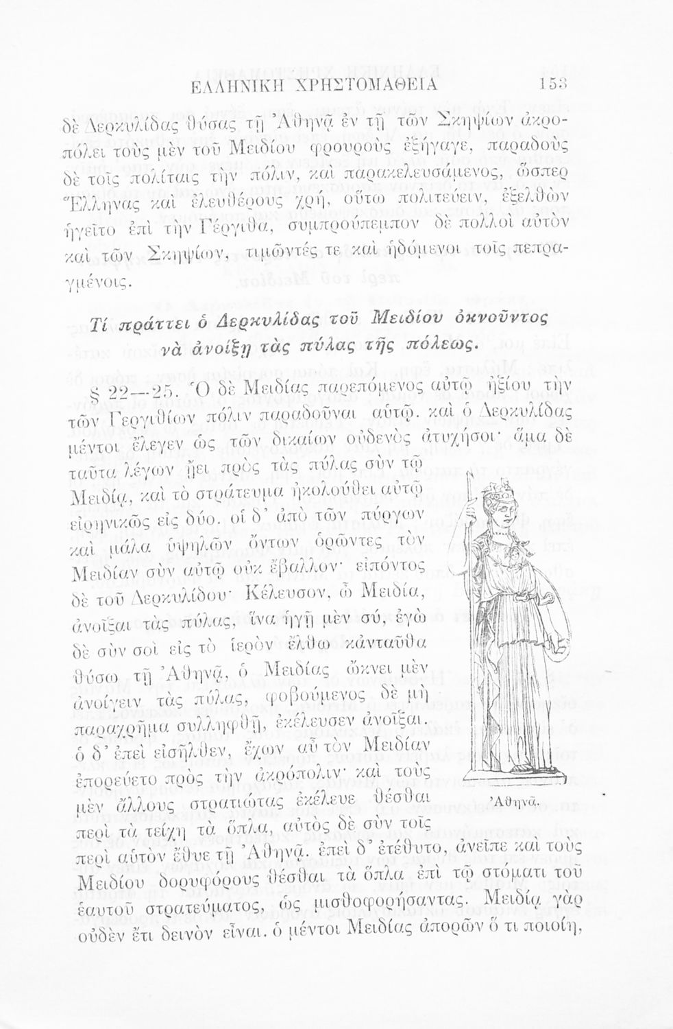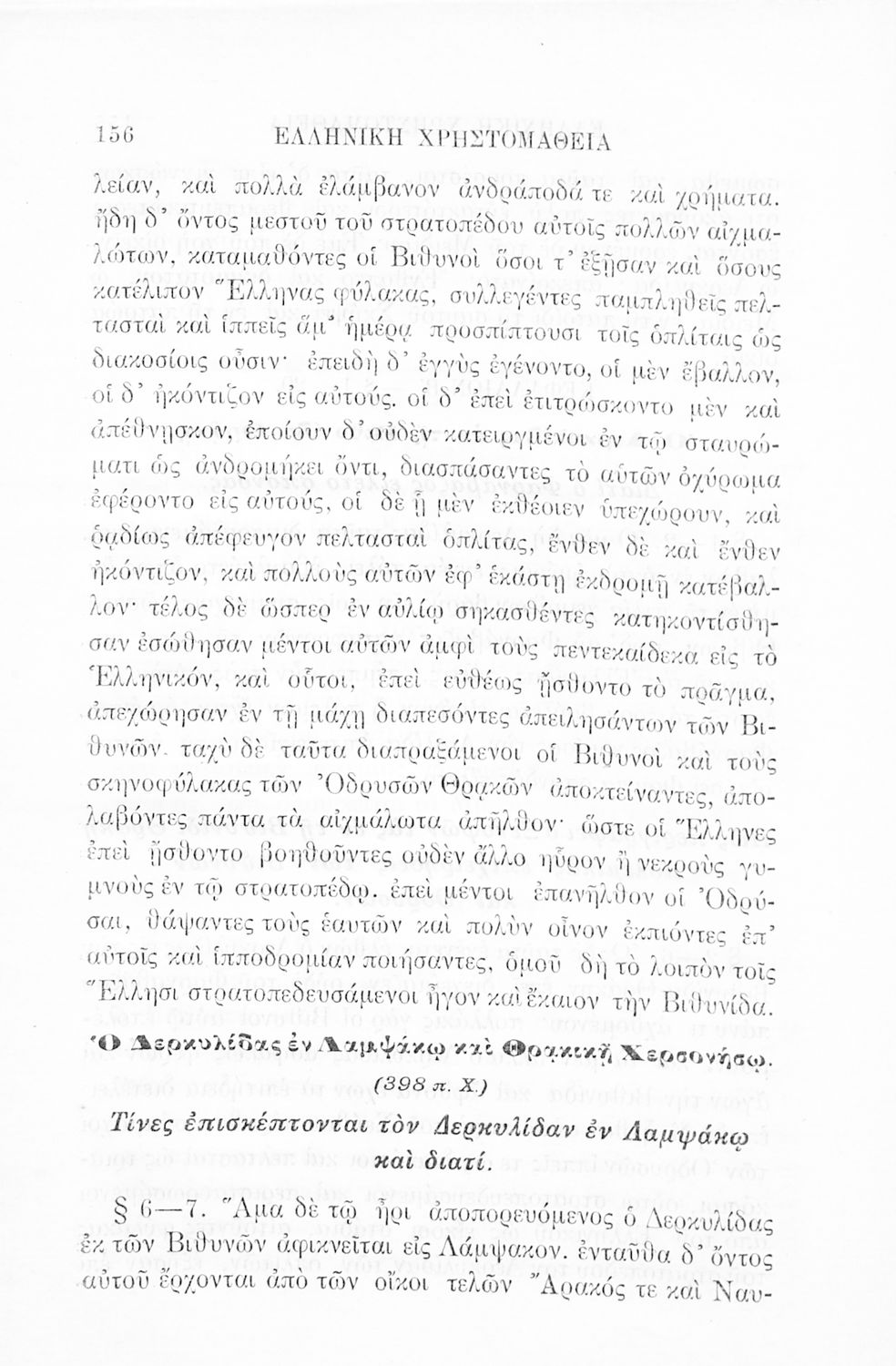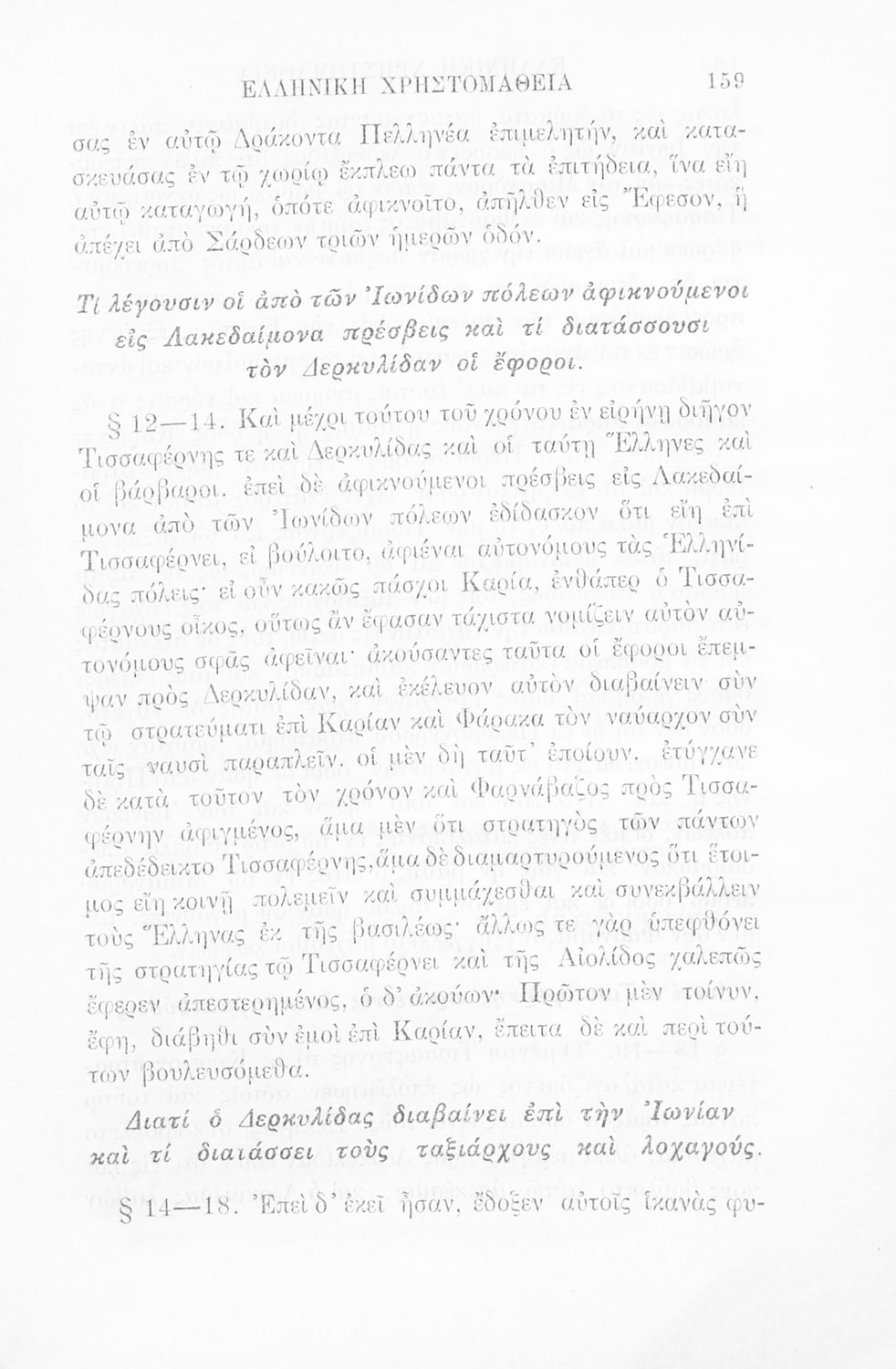 Σχολικό εγχειρίδιο Αρχαίων Ελληνικών Γ' Ελληνικού Σχολείου που περιλαμβάνει γραμματική της αρχαίας ελληνικής, αποσπάσματα από το έργο του Ξενοφώντα Ελληνικά και τα έργα του Λουκιανού Ενύπνιον και Ανάχαρσις, βιογραφικά σημειώματα των συγγραφέων, ερμηνευτικές και πραγματολογικές σημειώσεις.