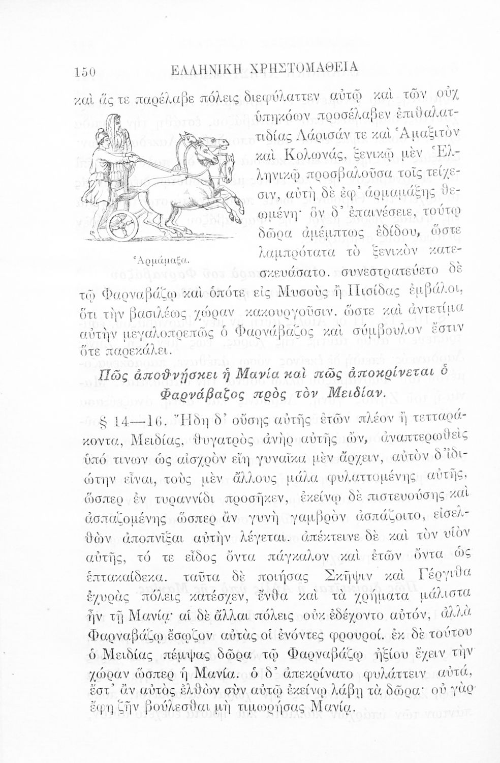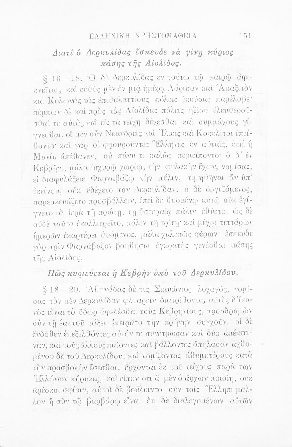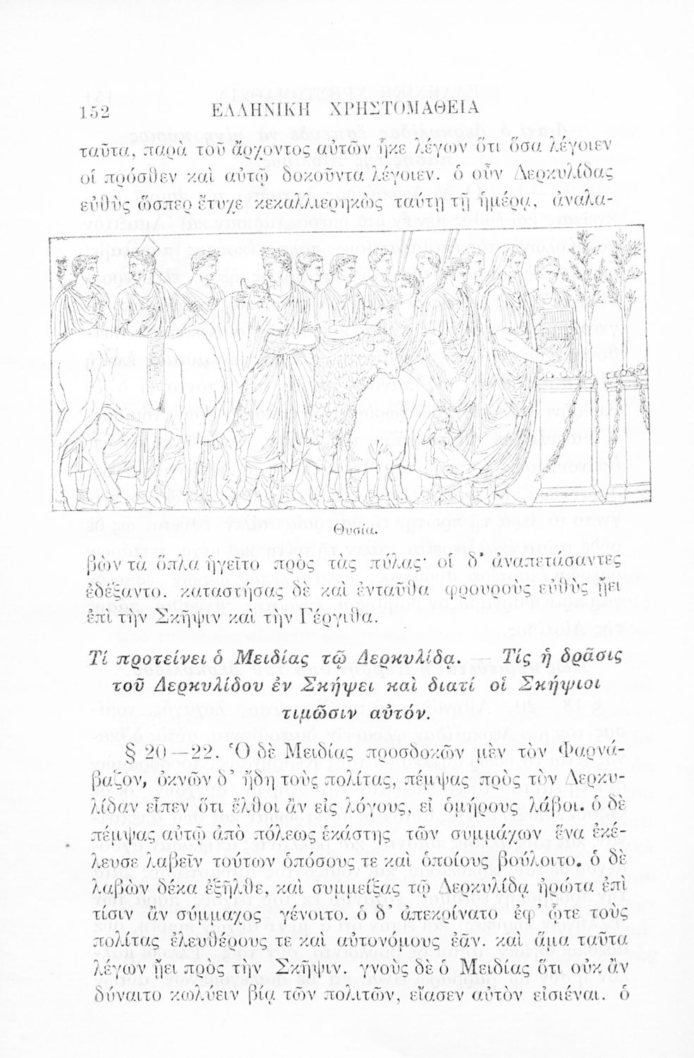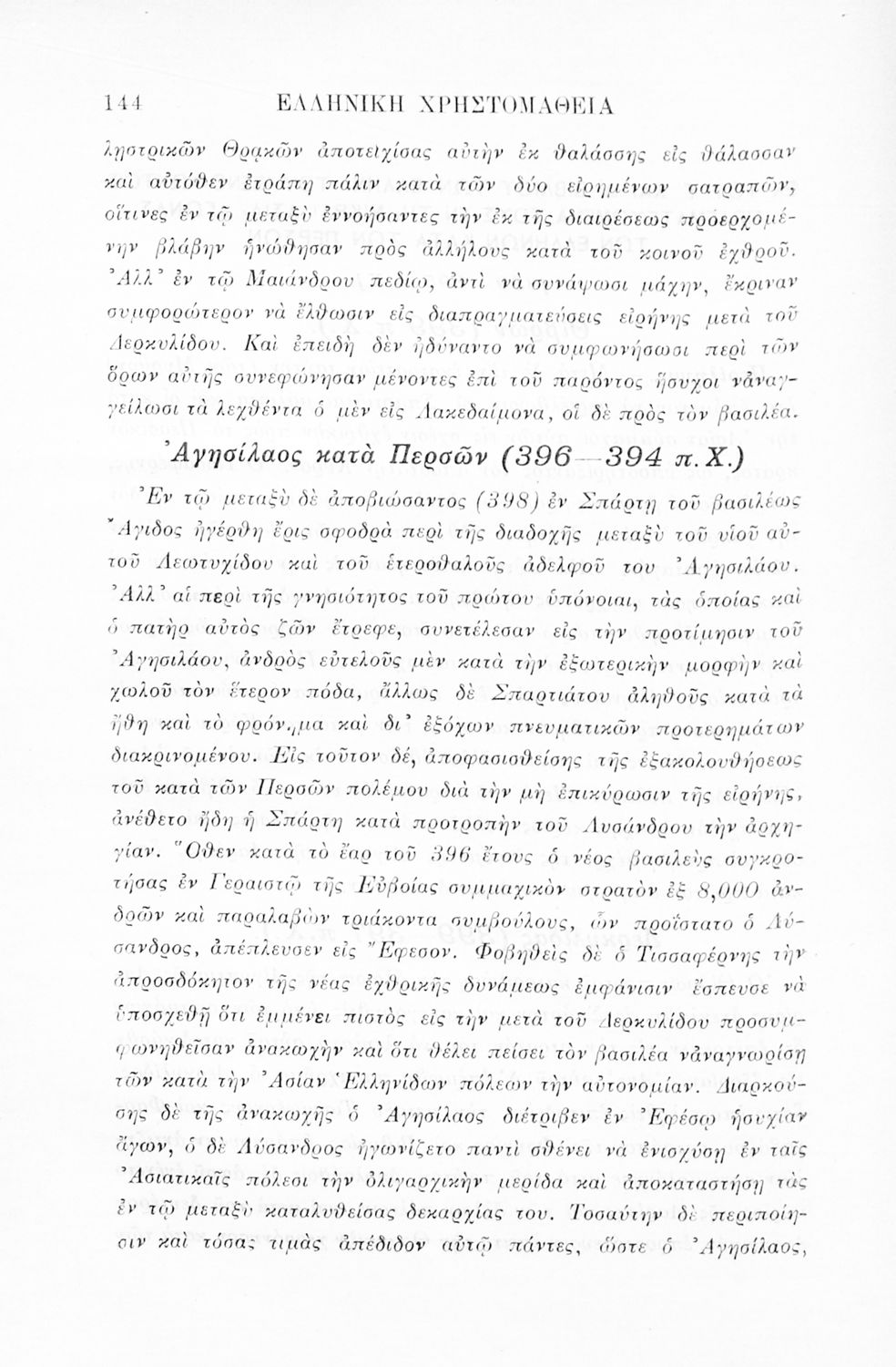 Σχολικό εγχειρίδιο Αρχαίων Ελληνικών Γ' Ελληνικού Σχολείου που περιλαμβάνει γραμματική της αρχαίας ελληνικής, αποσπάσματα από το έργο του Ξενοφώντα Ελληνικά και τα έργα του Λουκιανού Ενύπνιον και Ανάχαρσις, βιογραφικά σημειώματα των συγγραφέων, ερμηνευτικές και πραγματολογικές σημειώσεις.