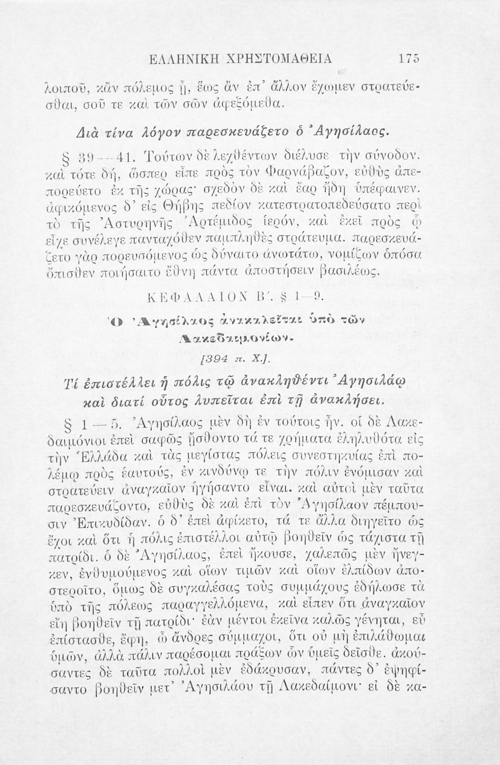 Σχολικό εγχειρίδιο Αρχαίων Ελληνικών Γ' Ελληνικού Σχολείου που περιλαμβάνει γραμματική της αρχαίας ελληνικής, αποσπάσματα από το έργο του Ξενοφώντα Ελληνικά και τα έργα του Λουκιανού Ενύπνιον και Ανάχαρσις, βιογραφικά σημειώματα των συγγραφέων, ερμηνευτικές και πραγματολογικές σημειώσεις.