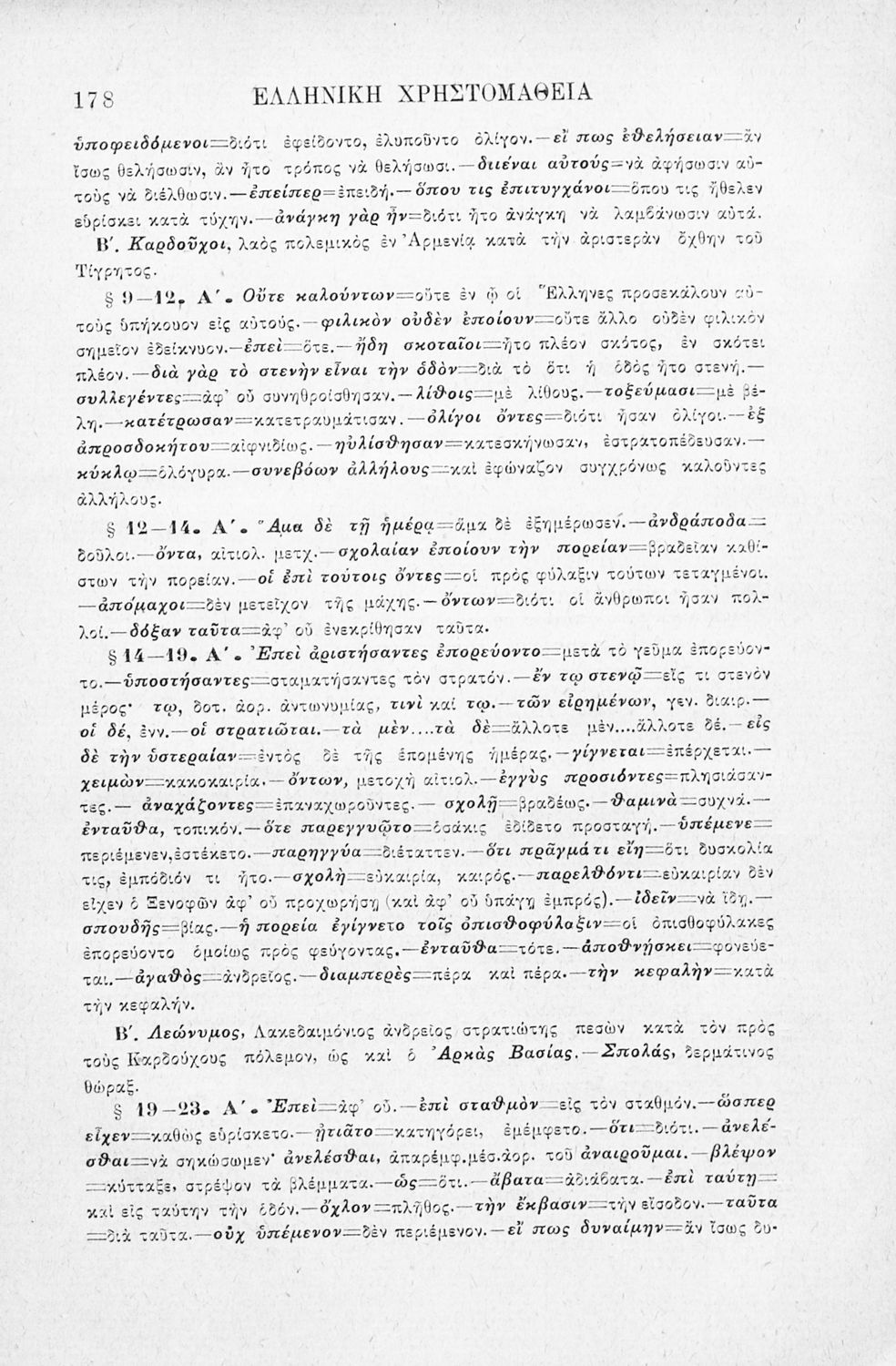 Σχολικό εγχειρίδιο Αρχαίων Ελληνικών Β' Ελληνικού Σχολείου που περιλαμβάνει αποσπάσματα από το έργο του Ξενοφώντα Κύρου Ανάβασις, ερμηνευτικές, γλωσσικές, γραμματικές και συντακτικές παρατηρήσεις, και ασκήσεις