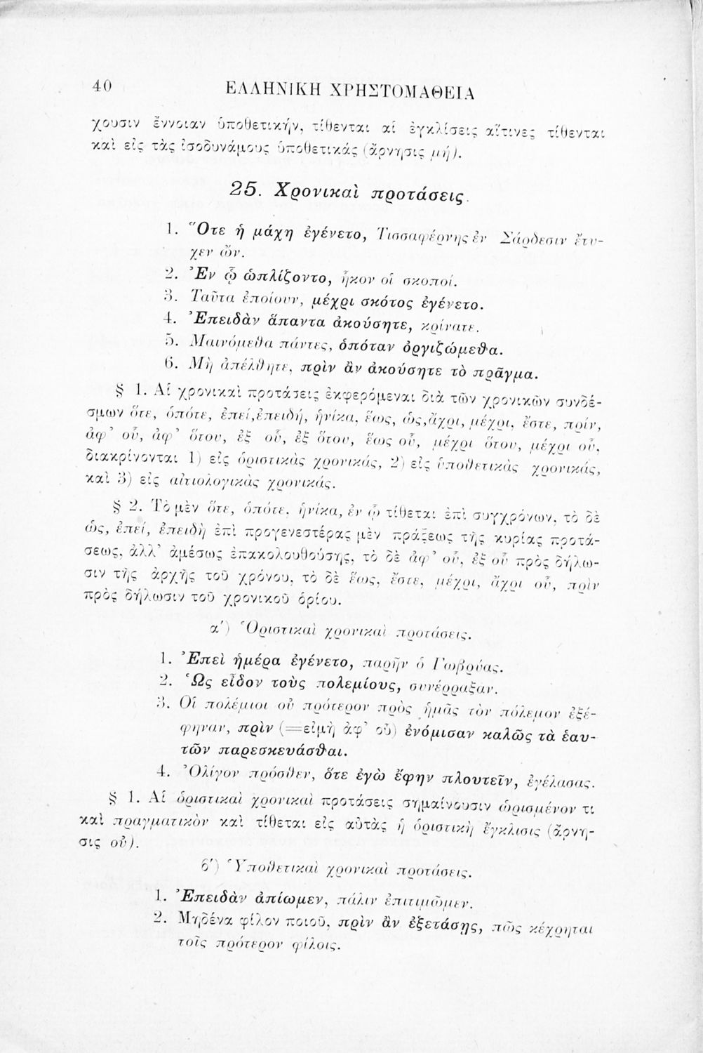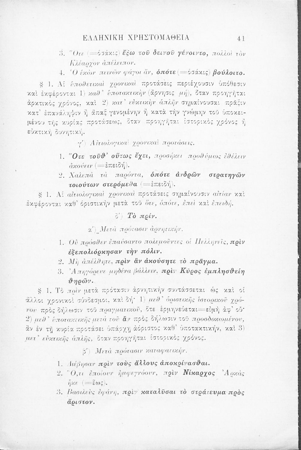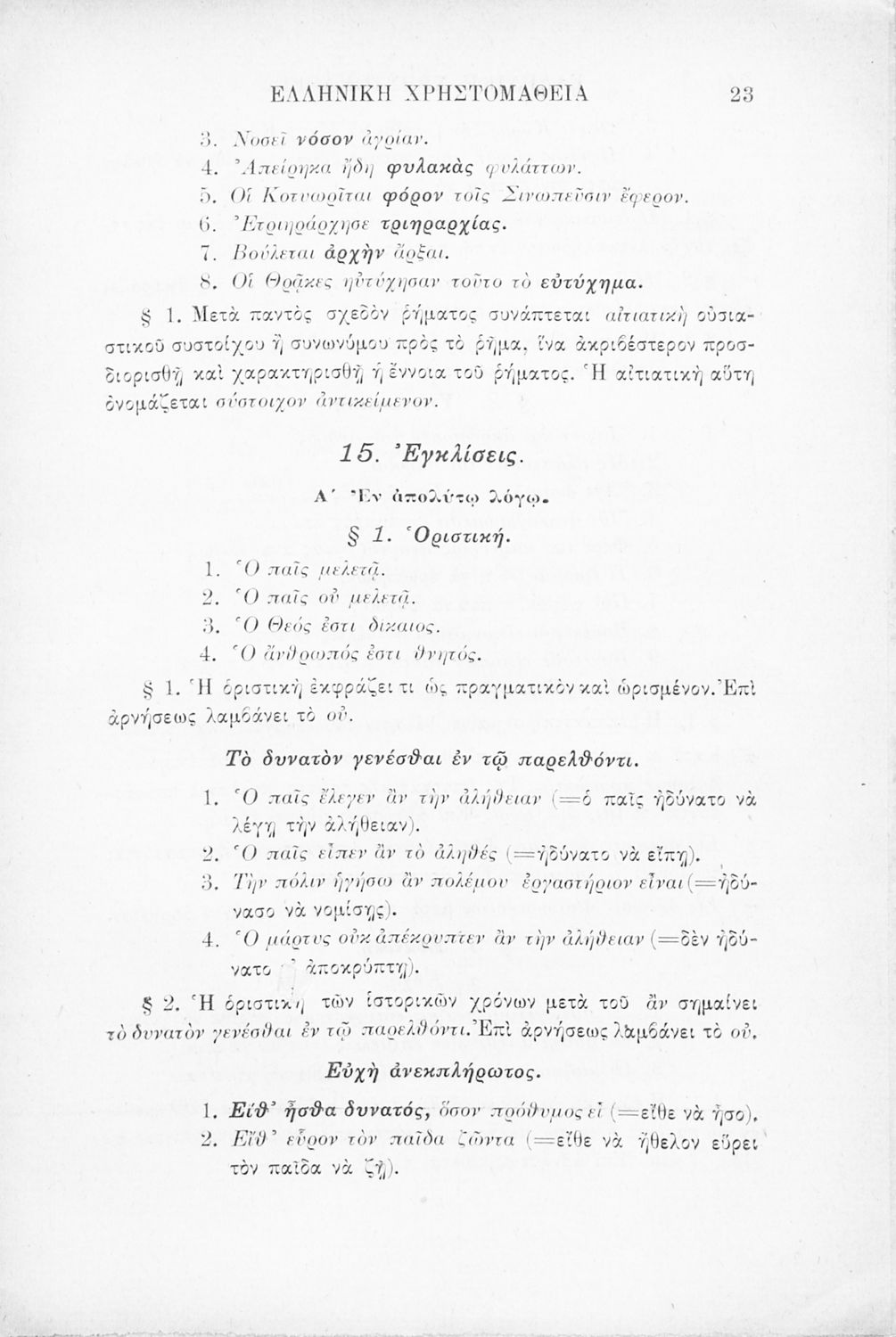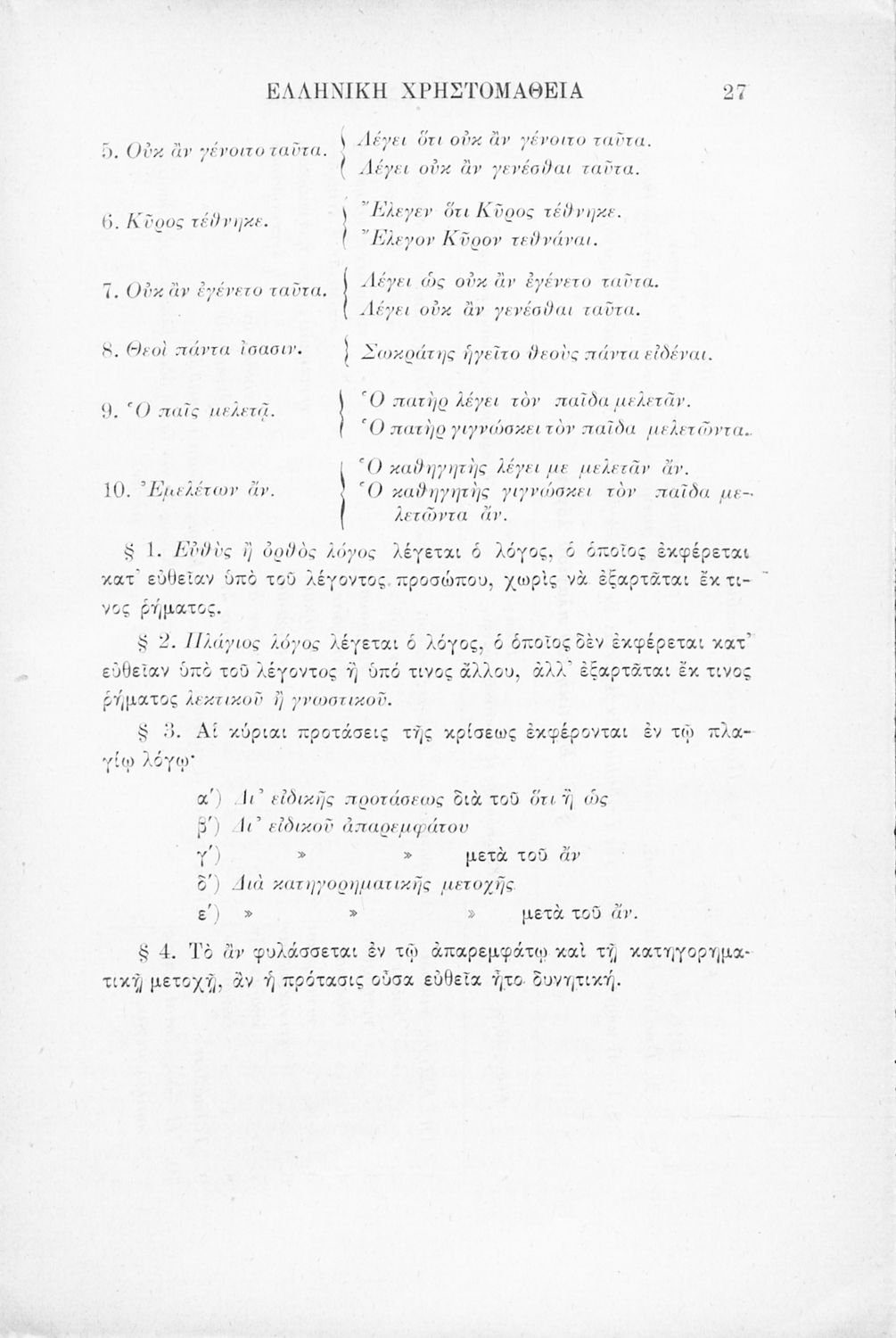 Σχολικό εγχειρίδιο Αρχαίων Ελληνικών Γ' Ελληνικού Σχολείου που περιλαμβάνει γραμματική της αρχαίας ελληνικής, αποσπάσματα από το έργο του Ξενοφώντα Ελληνικά και τα έργα του Λουκιανού Ενύπνιον και Ανάχαρσις, βιογραφικά σημειώματα των συγγραφέων, ερμηνευτικές και πραγματολογικές σημειώσεις.