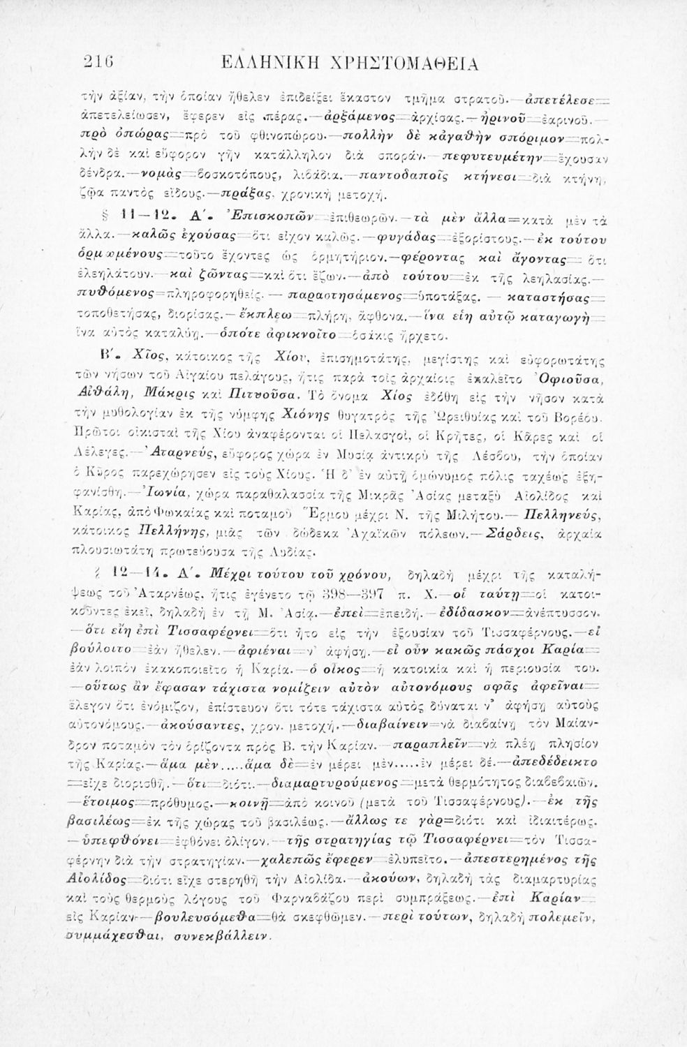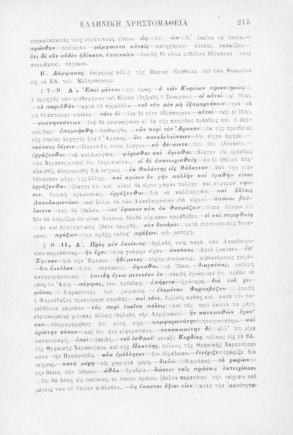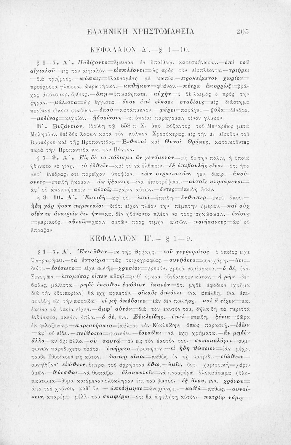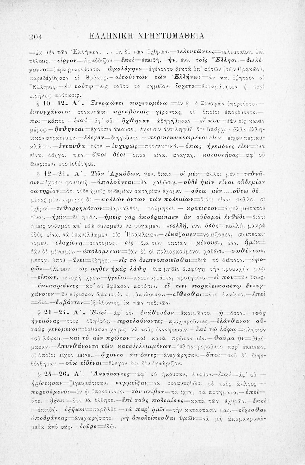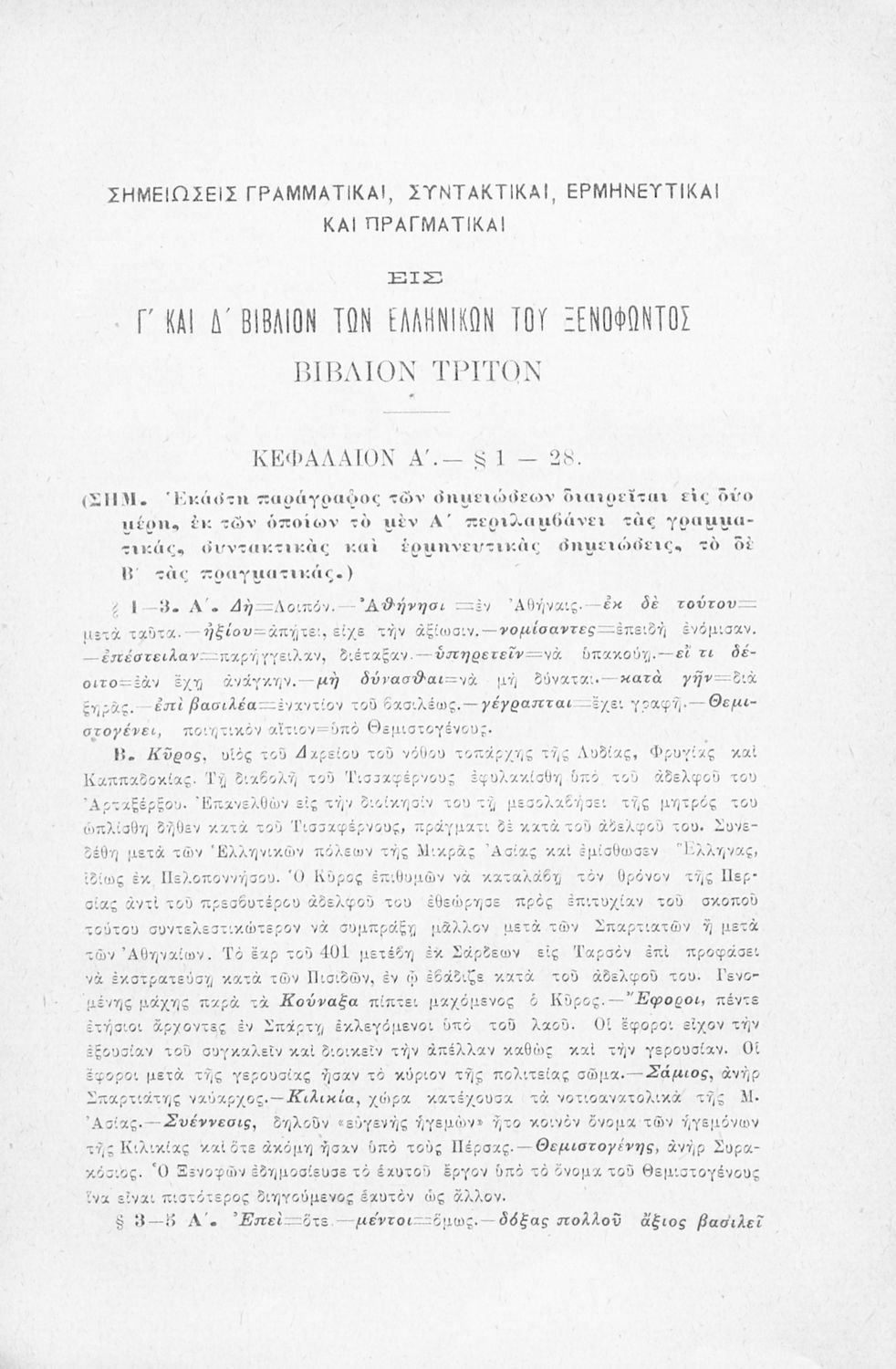Σχολικό εγχειρίδιο Αρχαίων Ελληνικών Γ' Ελληνικού Σχολείου που περιλαμβάνει γραμματική της αρχαίας ελληνικής, αποσπάσματα από το έργο του Ξενοφώντα Ελληνικά και τα έργα του Λουκιανού Ενύπνιον και Ανάχαρσις, βιογραφικά σημειώματα των συγγραφέων, ερμηνευτικές και πραγματολογικές σημειώσεις.