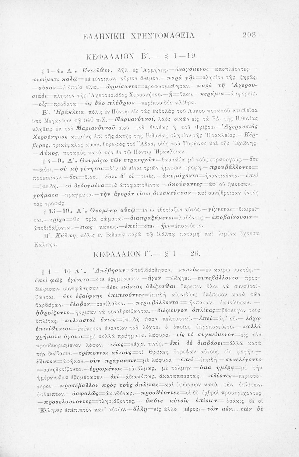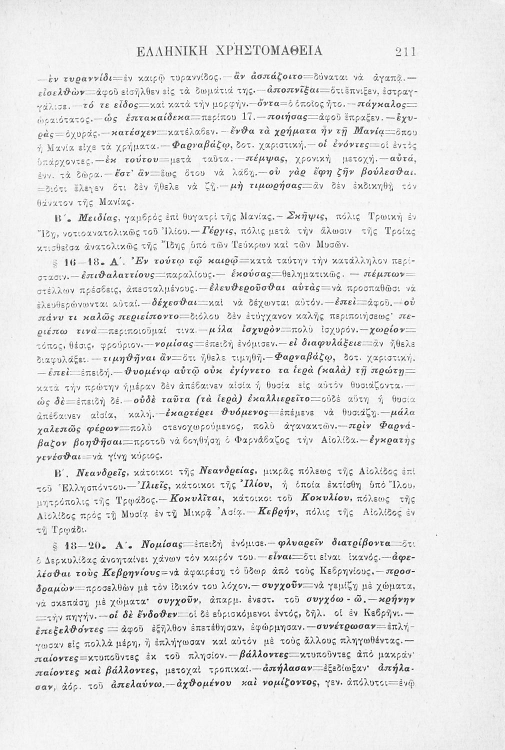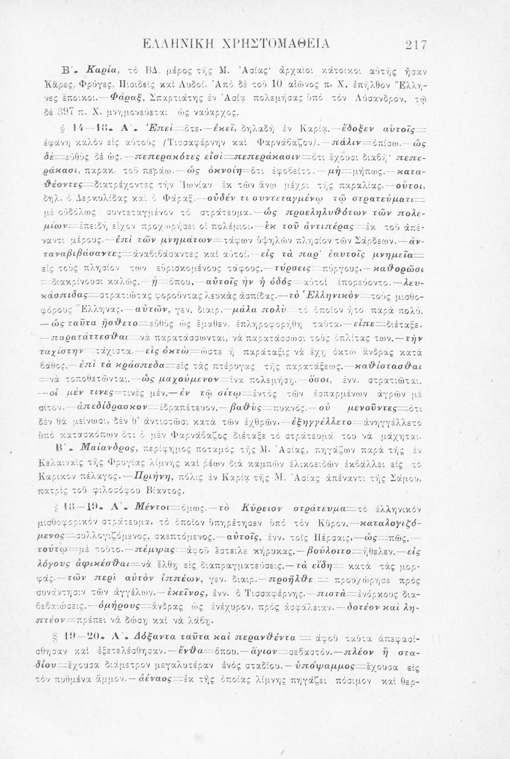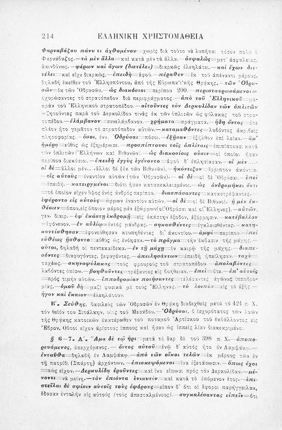 Σχολικό εγχειρίδιο Αρχαίων Ελληνικών Γ' Ελληνικού Σχολείου που περιλαμβάνει γραμματική της αρχαίας ελληνικής, αποσπάσματα από το έργο του Ξενοφώντα Ελληνικά και τα έργα του Λουκιανού Ενύπνιον και Ανάχαρσις, βιογραφικά σημειώματα των συγγραφέων, ερμηνευτικές και πραγματολογικές σημειώσεις.