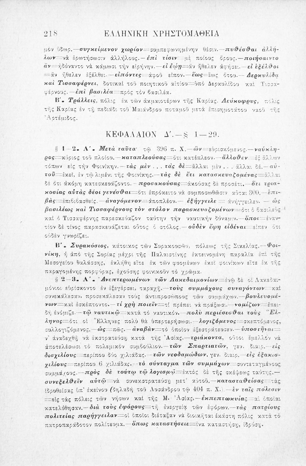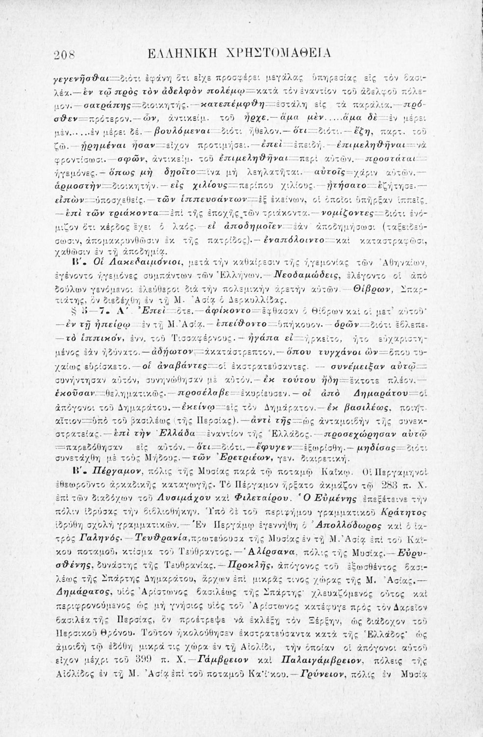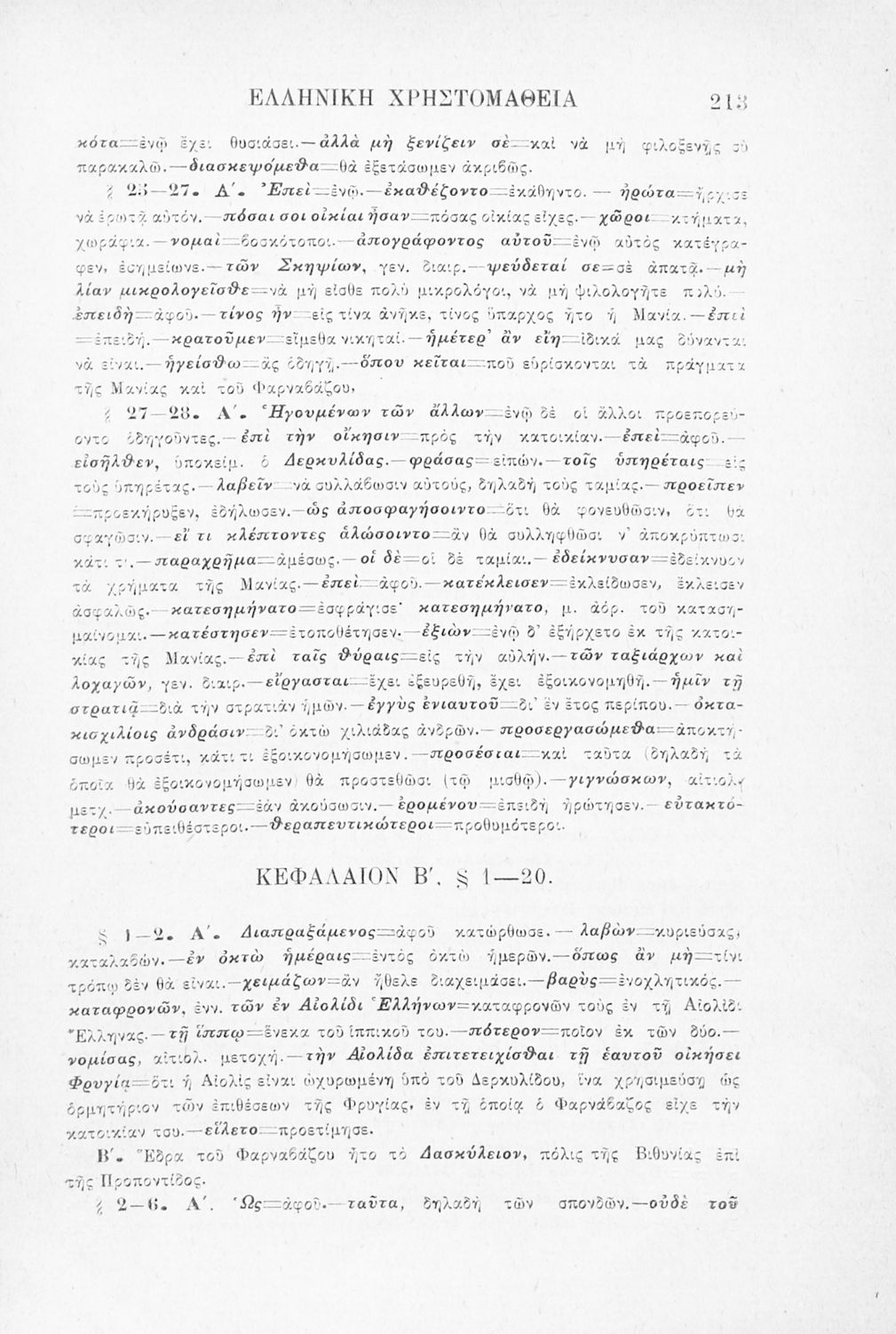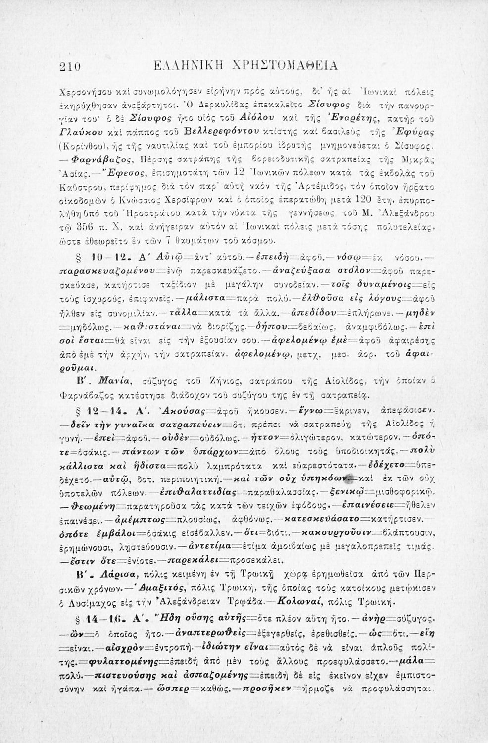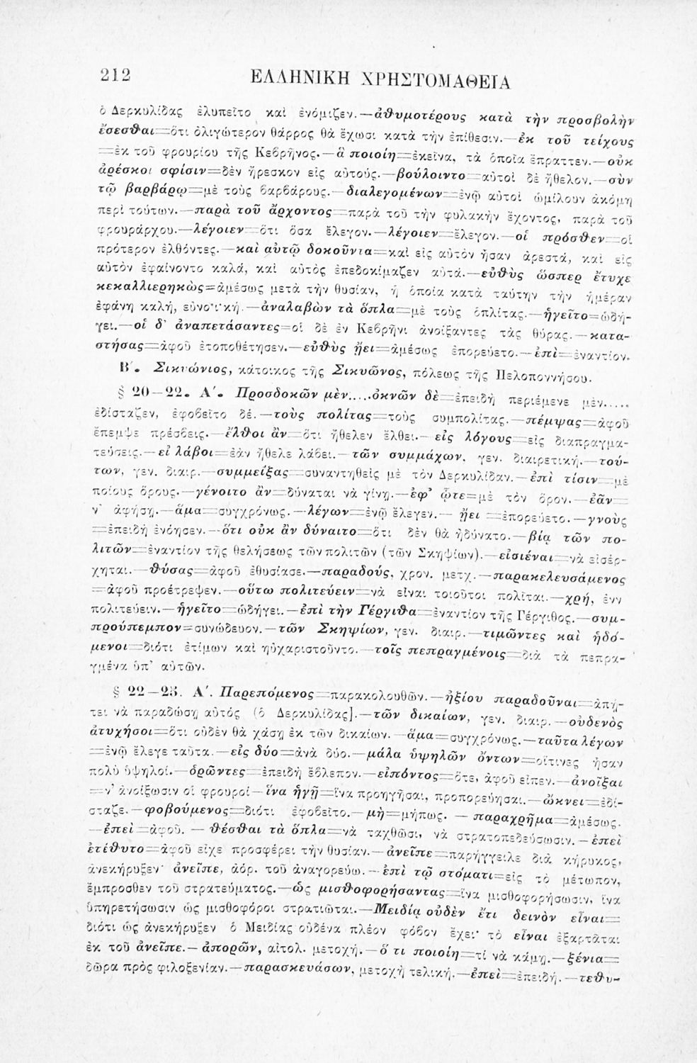 Σχολικό εγχειρίδιο Αρχαίων Ελληνικών Γ' Ελληνικού Σχολείου που περιλαμβάνει γραμματική της αρχαίας ελληνικής, αποσπάσματα από το έργο του Ξενοφώντα Ελληνικά και τα έργα του Λουκιανού Ενύπνιον και Ανάχαρσις, βιογραφικά σημειώματα των συγγραφέων, ερμηνευτικές και πραγματολογικές σημειώσεις.