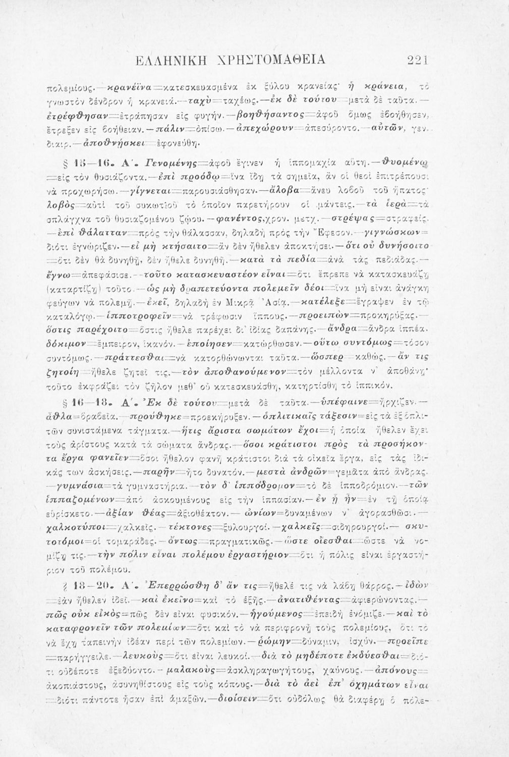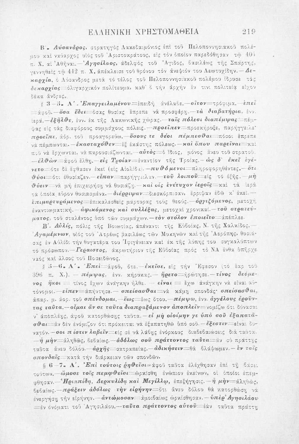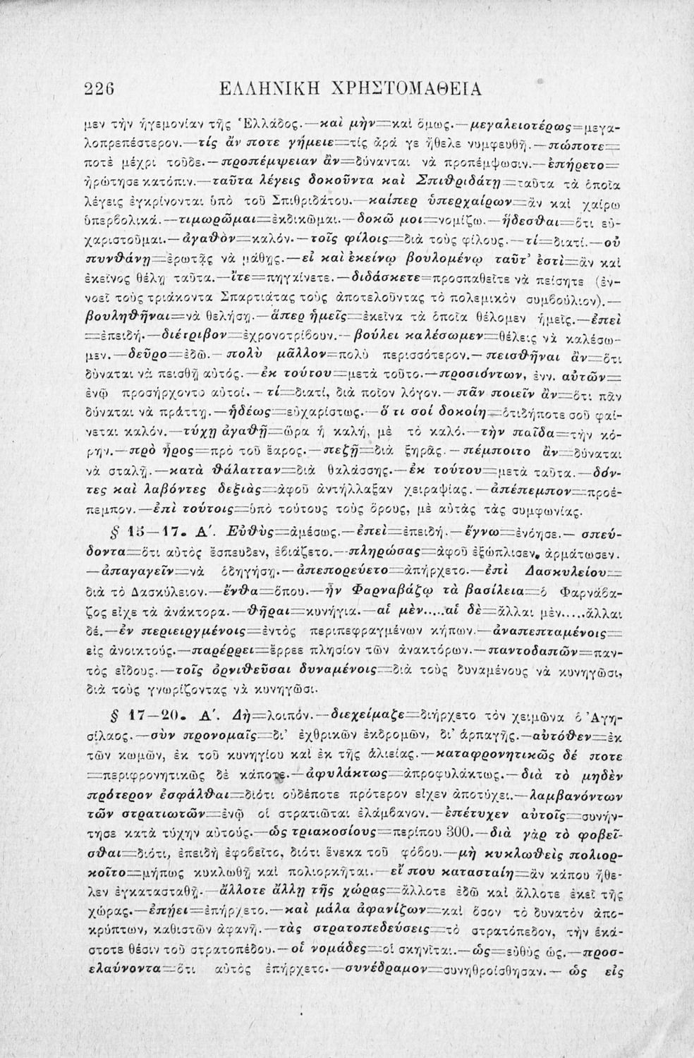 Σχολικό εγχειρίδιο Αρχαίων Ελληνικών Γ' Ελληνικού Σχολείου που περιλαμβάνει γραμματική της αρχαίας ελληνικής, αποσπάσματα από το έργο του Ξενοφώντα Ελληνικά και τα έργα του Λουκιανού Ενύπνιον και Ανάχαρσις, βιογραφικά σημειώματα των συγγραφέων, ερμηνευτικές και πραγματολογικές σημειώσεις.